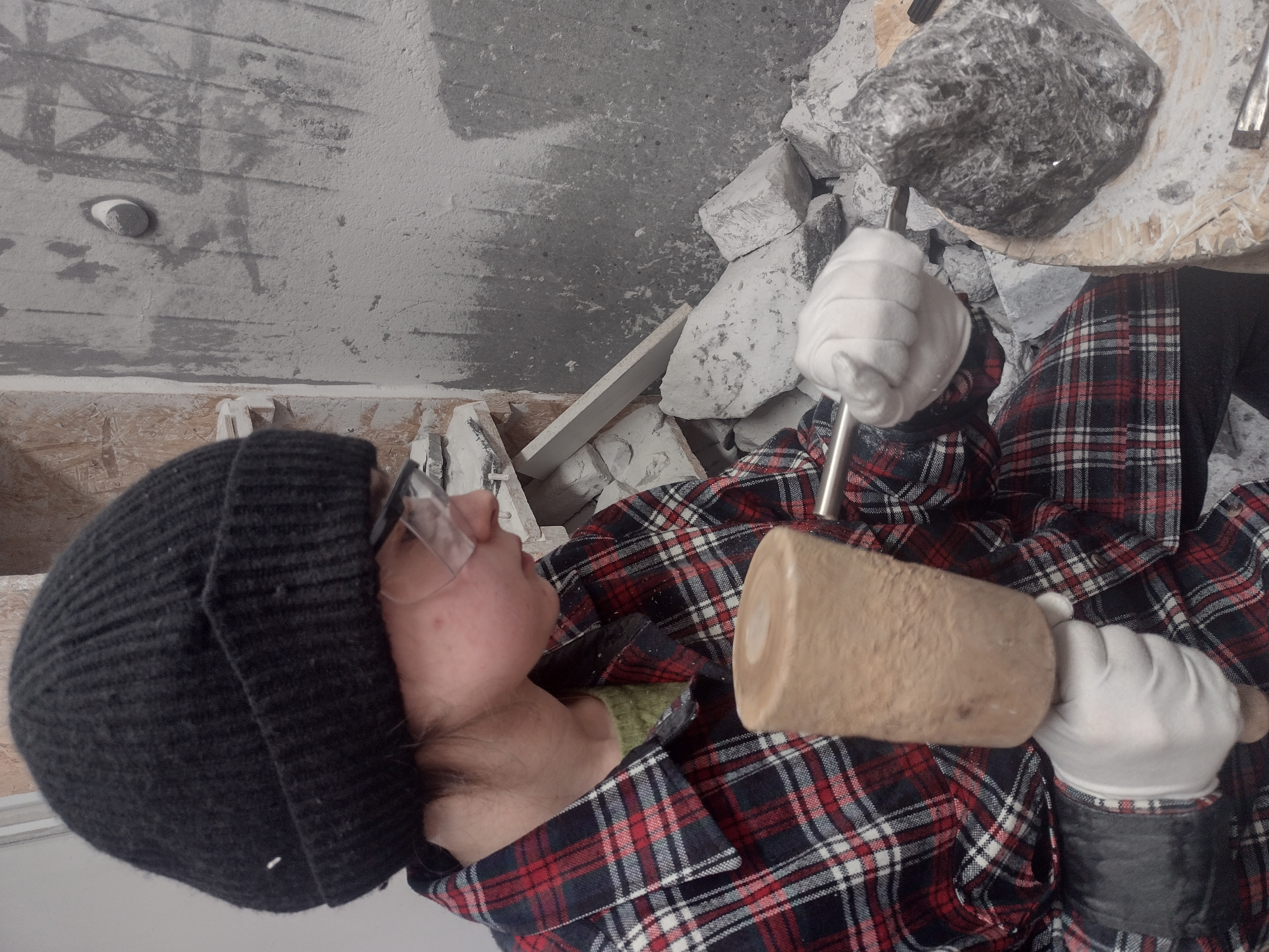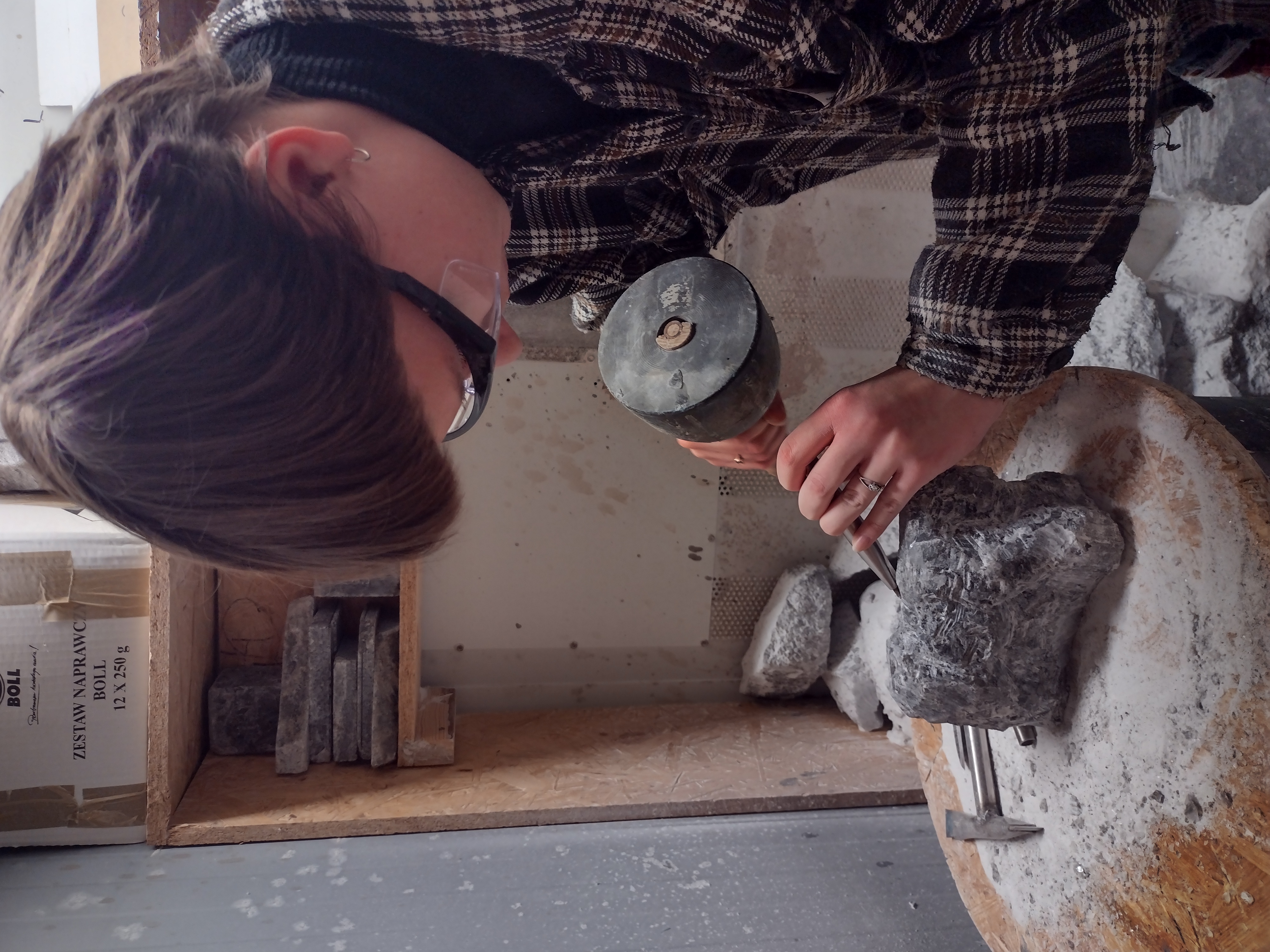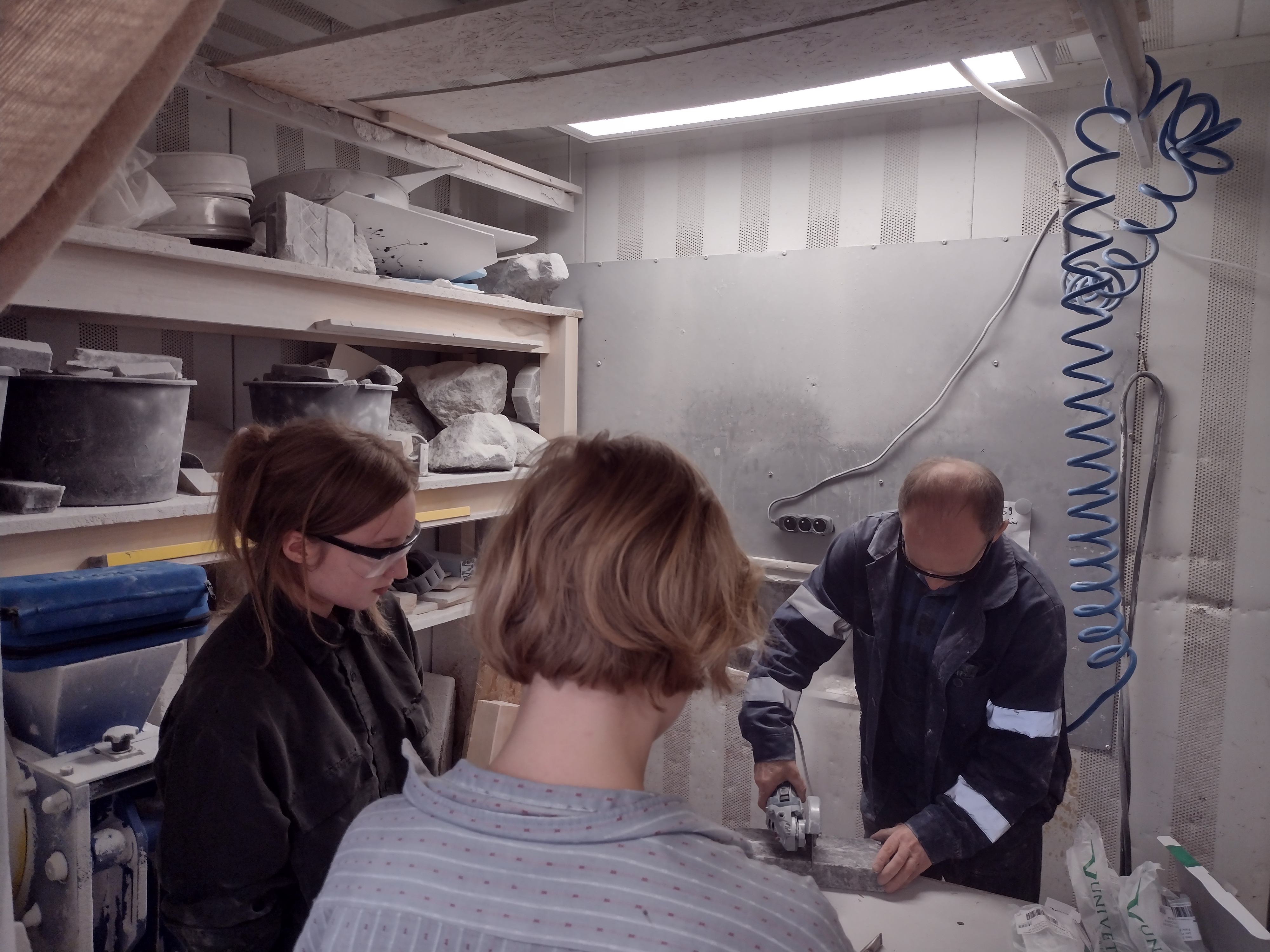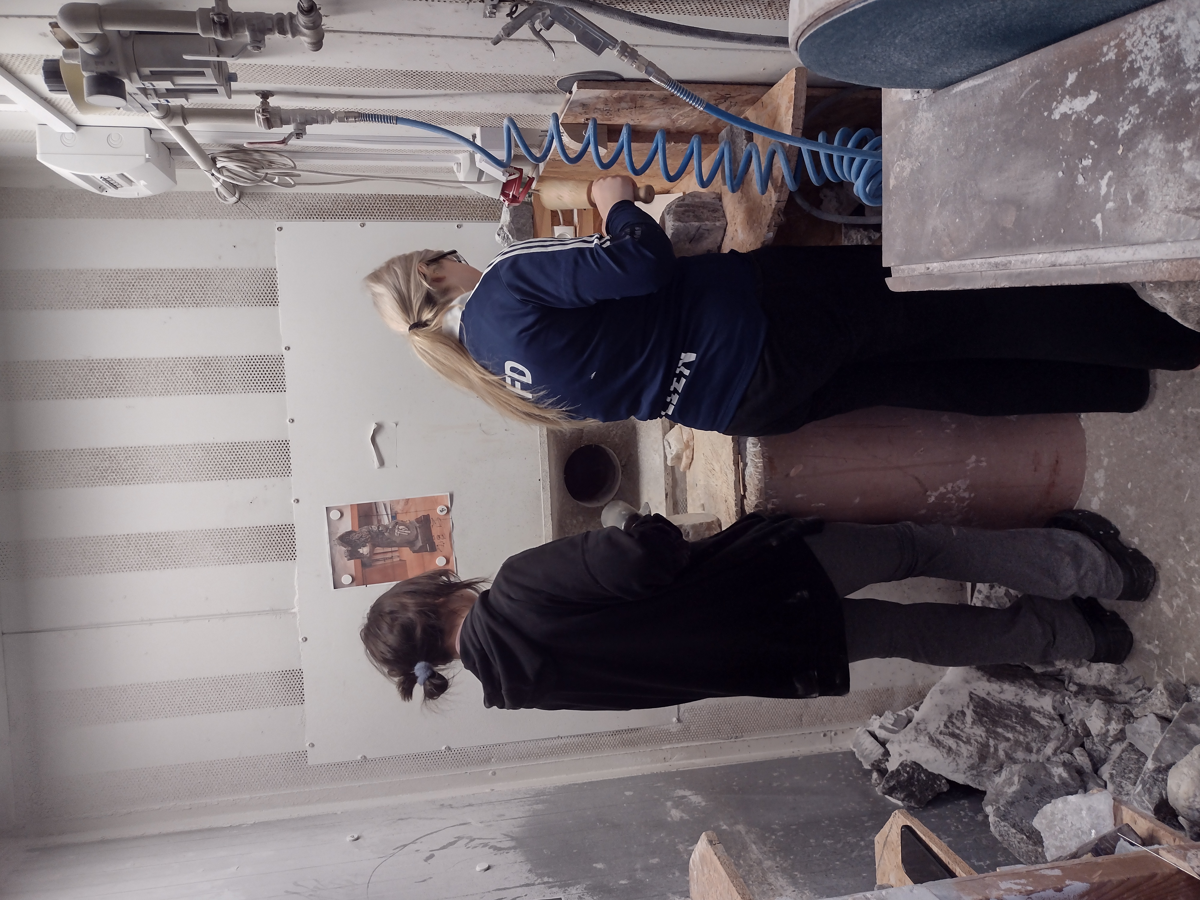 Po wyjeździe na świat udaliśmy się do pracowni rzeźbiarskiej, gdzie zostaliśmy przyjęcie bardzo życzliwie. W maleńkich boksach, uzbrojone w odpowiednie dłuta, pobijaki, okulary ochronne dziewczęta podjęły swe pierwsze działania w soli. Sól, jak opowiadali górnicy-rzeźbiarze, to niezwykle delikatny materiał, dlatego praca z nim wymaga precyzji i dokładności. Choć jest krucha i delikatna, sól ma twardość zbliżoną do gipsu. Pierwsze uderzenia były formą poznawania materiału. Stopniowo materiał stawał się coraz bardziej „obrabialny”.