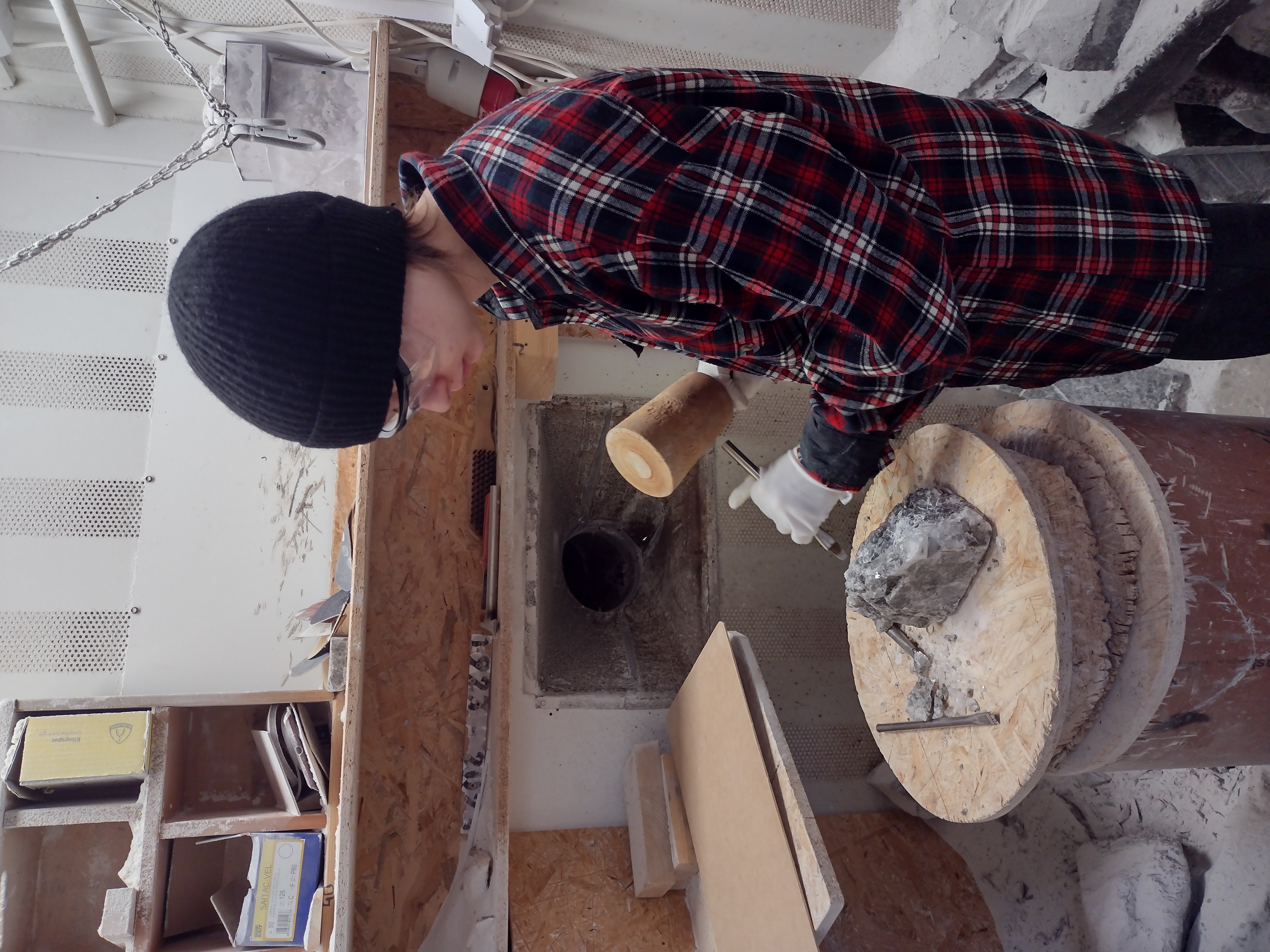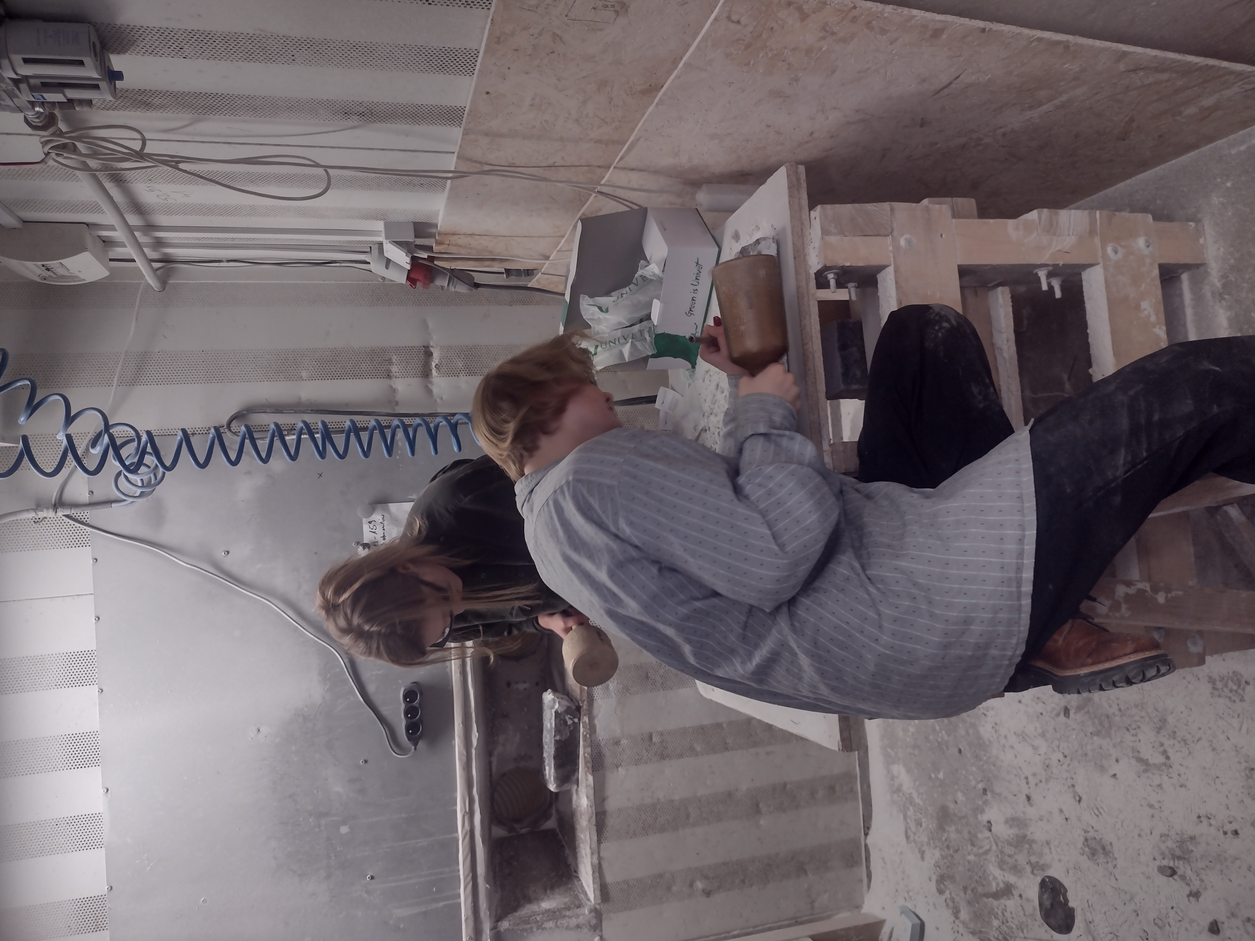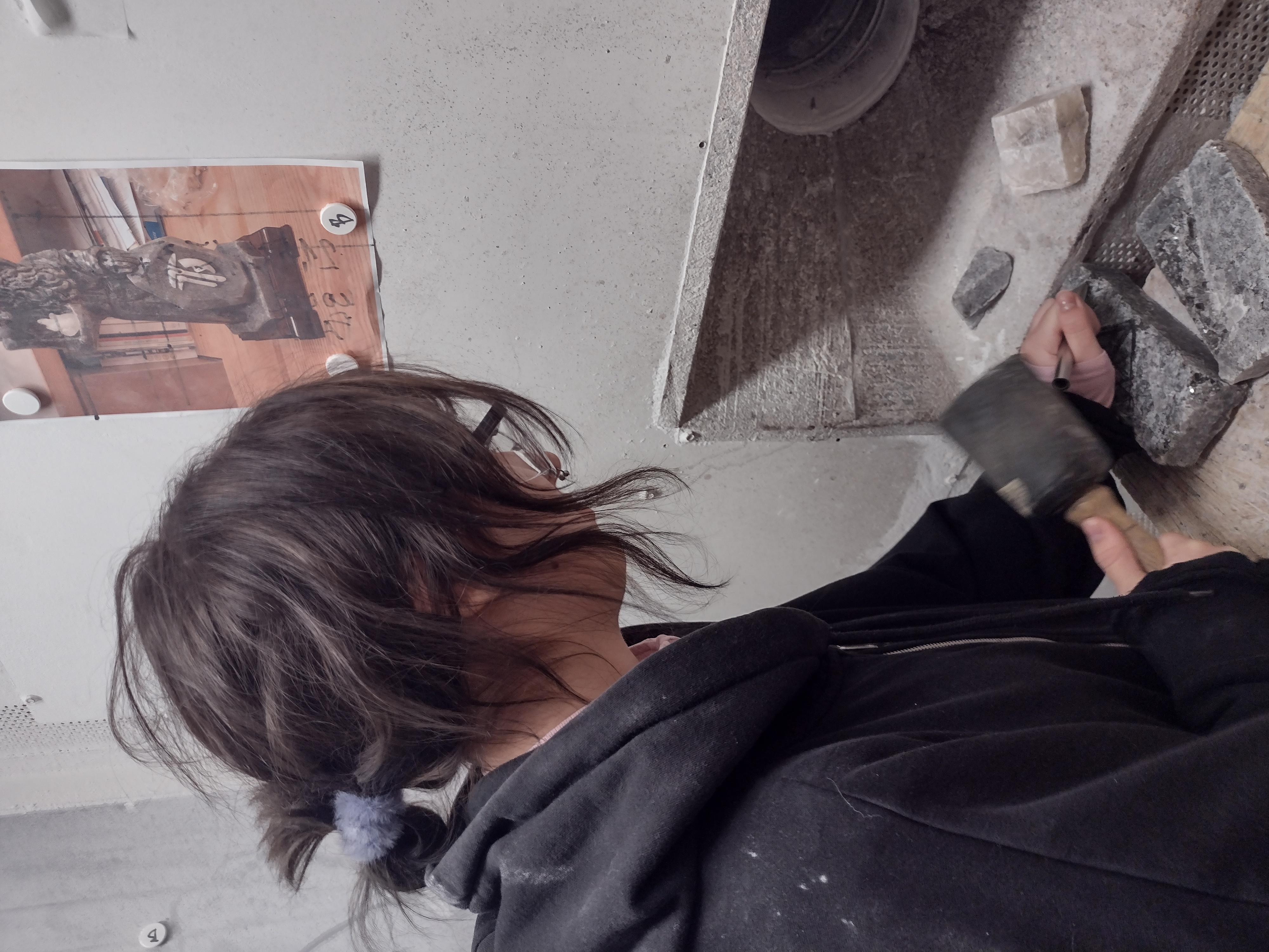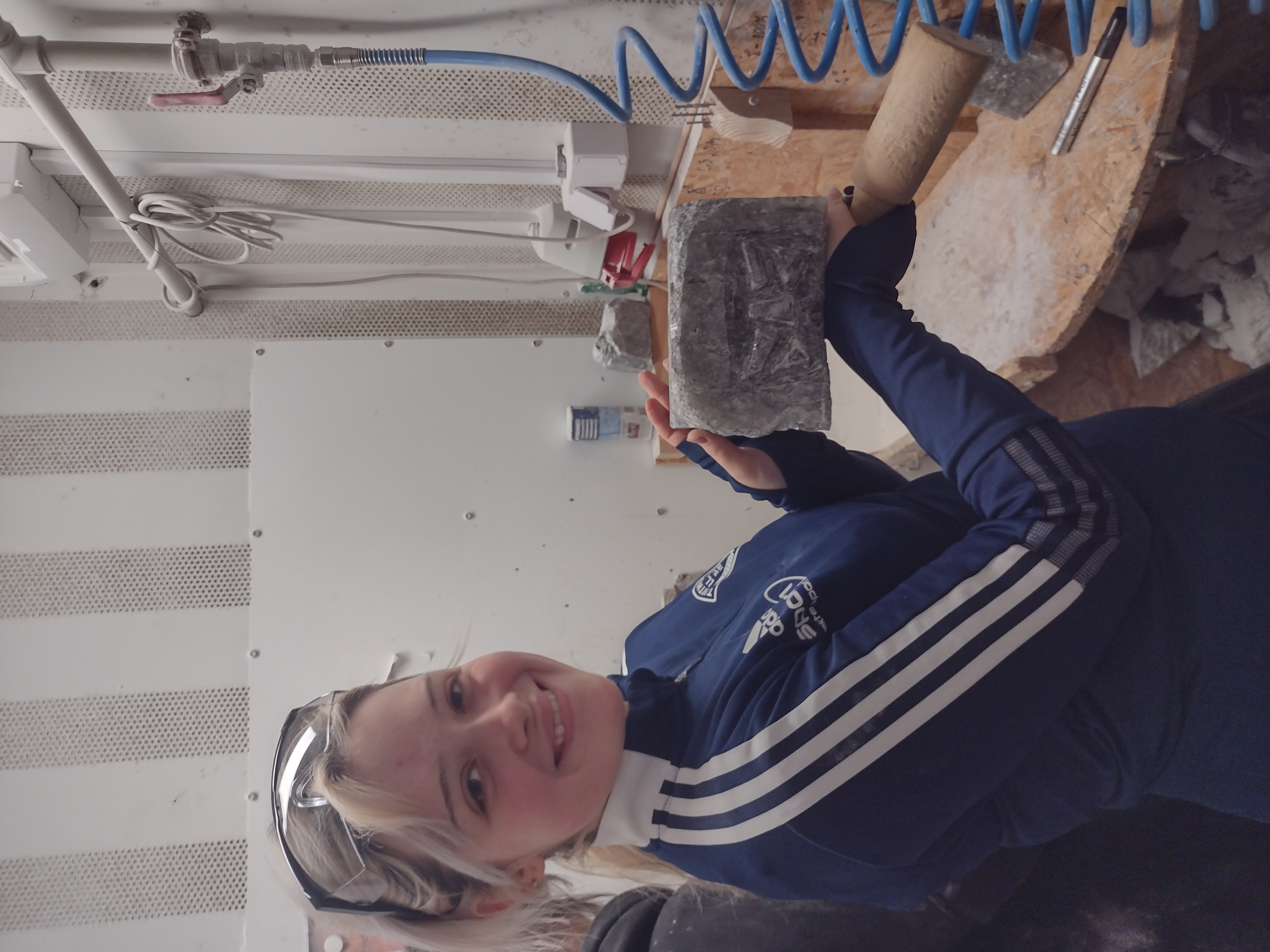 Po wyjeździe na świat udaliśmy się do pracowni rzeźbiarskiej, gdzie zostaliśmy przyjęcie bardzo życzliwie. W maleńkich boksach, uzbrojone w odpowiednie dłuta, pobijaki, okulary ochronne dziewczęta podjęły swe pierwsze działania w soli. Sól, jak opowiadali górnicy-rzeźbiarze, to niezwykle delikatny materiał, dlatego praca z nim wymaga precyzji i dokładności. Choć jest krucha i delikatna, sól ma twardość zbliżoną do gipsu. Pierwsze uderzenia były formą poznawania materiału. Stopniowo materiał stawał się coraz bardziej „obrabialny”.