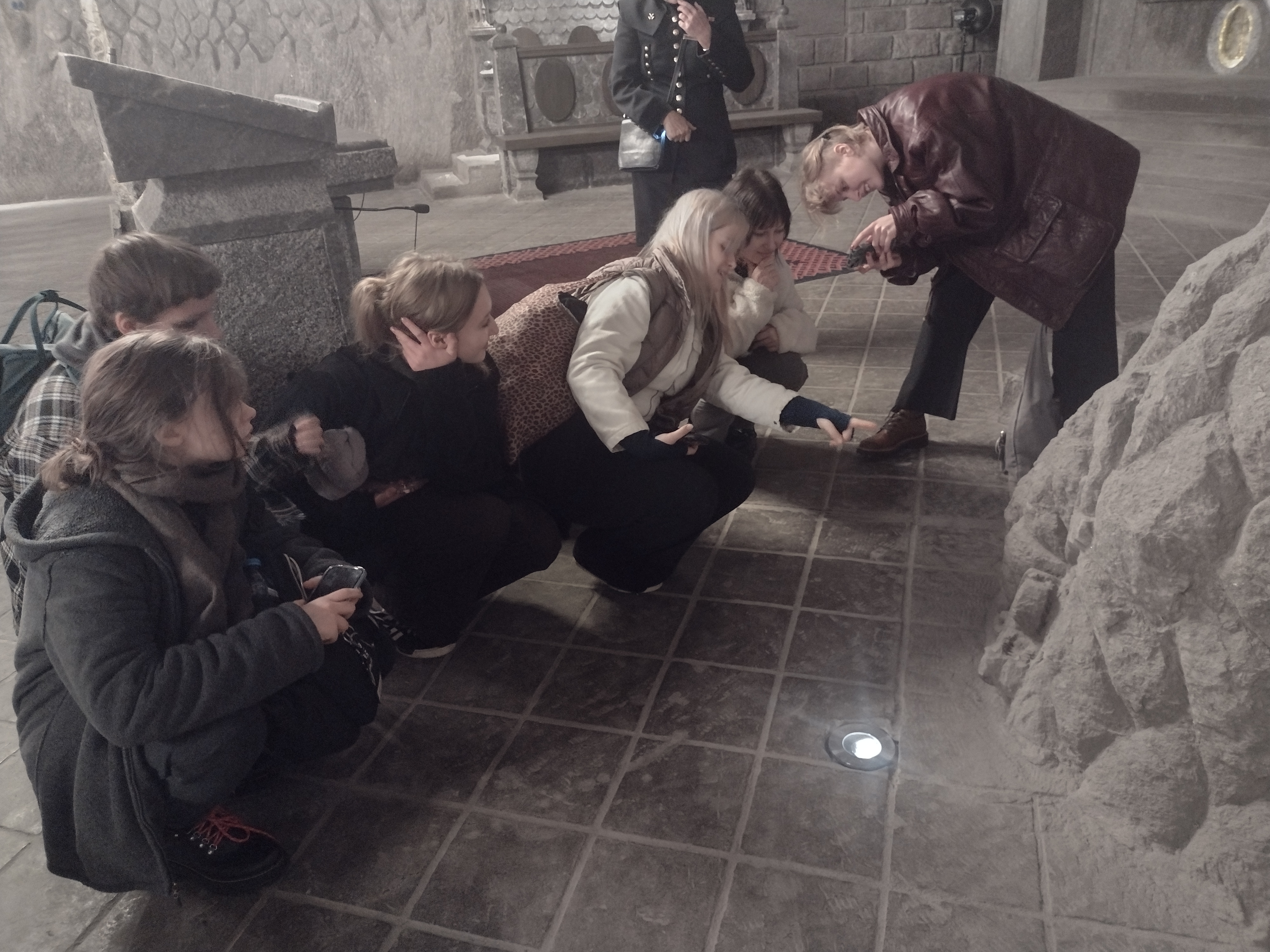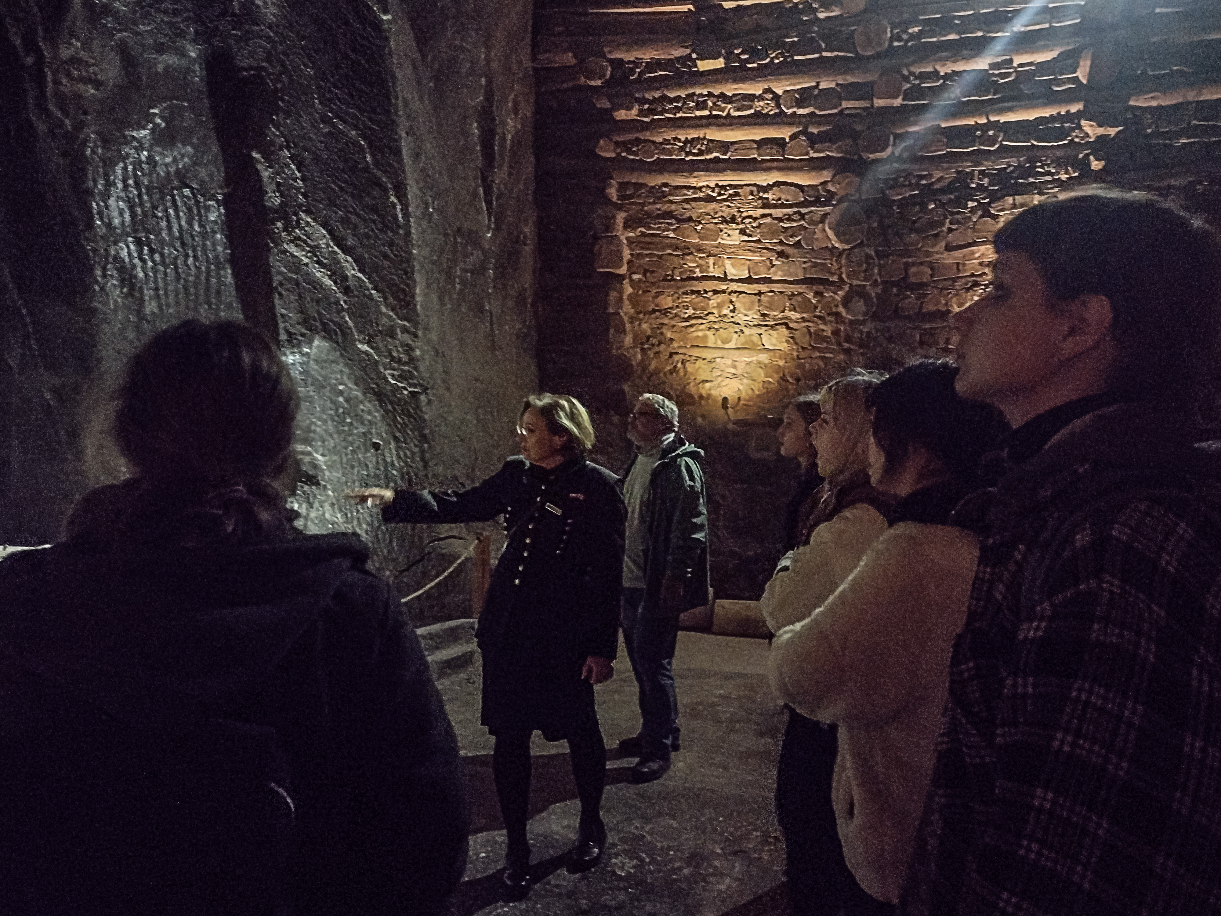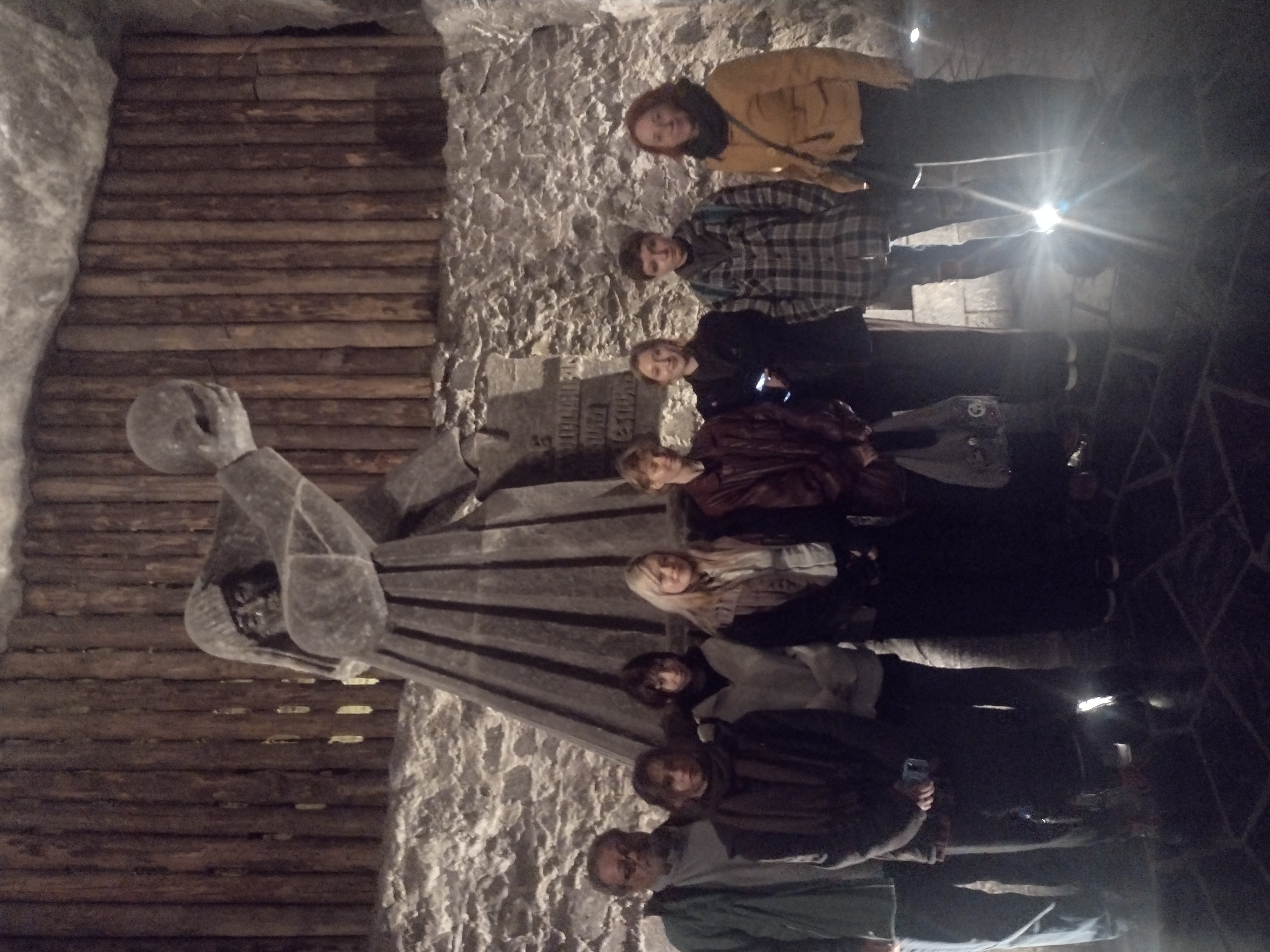 Wizytę w wielickiej Kopalni rozpoczęliśmy od zwiedzania pod opieką pani Agnieszki Wolańskiej. Trasa zaplanowana była tak, by młodzież mogła poznać dorobek rzeźbiarski górników, którzy na przestrzeni czasu wzbogacali dekorację komór wielickiej Kopalni o realizacje rzeźbiarskie głownie w soli, ale także w drewnie. Oglądaliśmy dekorację dwu kaplic, najstarszej św. Antoniego i św. Krzyża z dekoracją w drewnie, pomnik Kopernika i Kazimierza Wielkiego autorstwa Władysława Hapka, pomnik Józefa Piłsudskiego autorstwa Stanisława Anioła.
