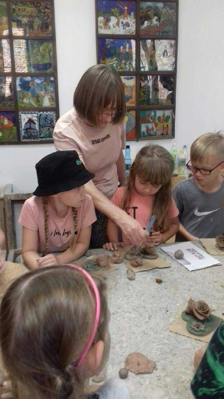 Warsztaty „Wyczarowane z gliny” zgromadziły w pracowni ceramiki artystycznej 15 - osobową grupę dzieci. Modelowały one z plastrów rozwałkowanej gliny motywy przestrzennych kwiatów, maleńkie naczyńka, dekoracyjne serca. Dużą atrakcją była barwiona w masie glina, która pozwoliła wzbogacić formy o pomysły kolorystyczne, a odciskane kawałki firanek dały efekty fakturalne. Dzieci wykazały się wielką kreatywnością i zaangażowaniem w tworzeniu oryginalnych prac.