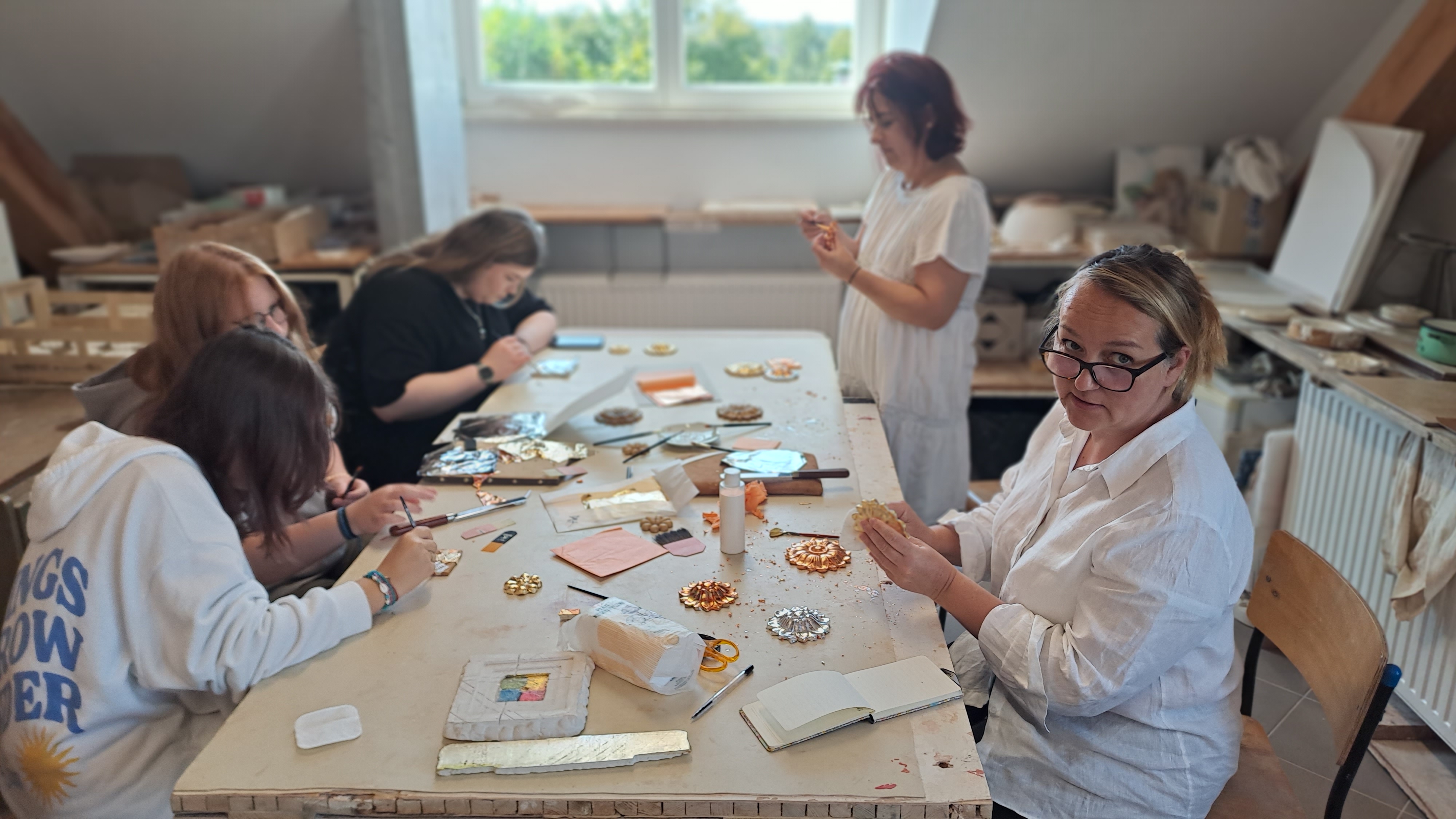Na warsztatach „Sztuka iluzji, czyli jak ozdobić gips, by nabrał blasku złota” uczestnicy dostali do zdobienia małe odlewy gipsowe z motywem rozety. By przemienić je w błyszczące cacka nanosili na nie cieniutkie płatki srebrnego szlagmetalu, warstwa po warstwie stosując mikstion akrylowy jako rodzaj kleju. By uzyskać efekt złota oraz innych warianty kolorystyczne zastosowali spirytusowe emalie barwne. Wykonując te drobne elementy zdobnicze uczestnicy warsztatów poznali tajniki warsztatu renowatora i uzyskali świadomość, jak żmudną, wymagającą spokoju i precyzji jest ich praca.
