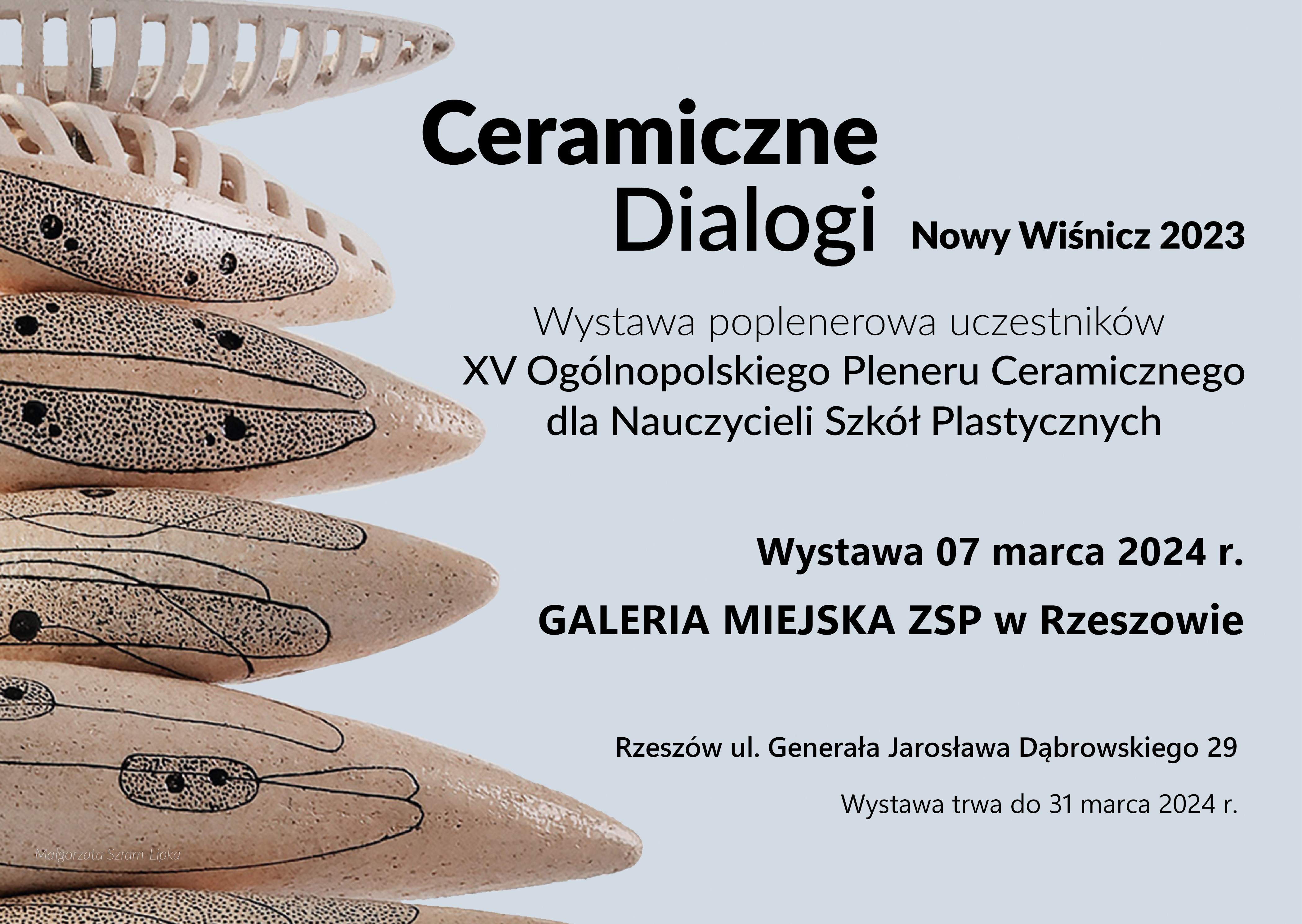 Od 8 do 29 marca 2024 roku w Galerii Miejskiej Zespołu Szkół Plastycznych im. Piotra Michałowskiego w Rzeszowie oglądać można prace ceramiczne siedemnastu nauczycieli ze szkół plastycznych w Polsce. Wystawa jest kolejną odsłoną efektów, organizowanego przez naszą szkołę i CEA w Warszawie, XV. Ogólnopolskiego Plener CERAMICZNE DIALOGI, Nowy Wiśnicz 2023.