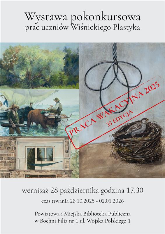 Z lewej strony zestaw czterech prac malarskich . Z prawej na jasnoszarym tle napis Wystawa pokonkursowa prac uczniów Wiśnickiego Plastyka. Na środku po skosie w czerwonej ramce napis Praca wakacyjna 2025 35 edycja.