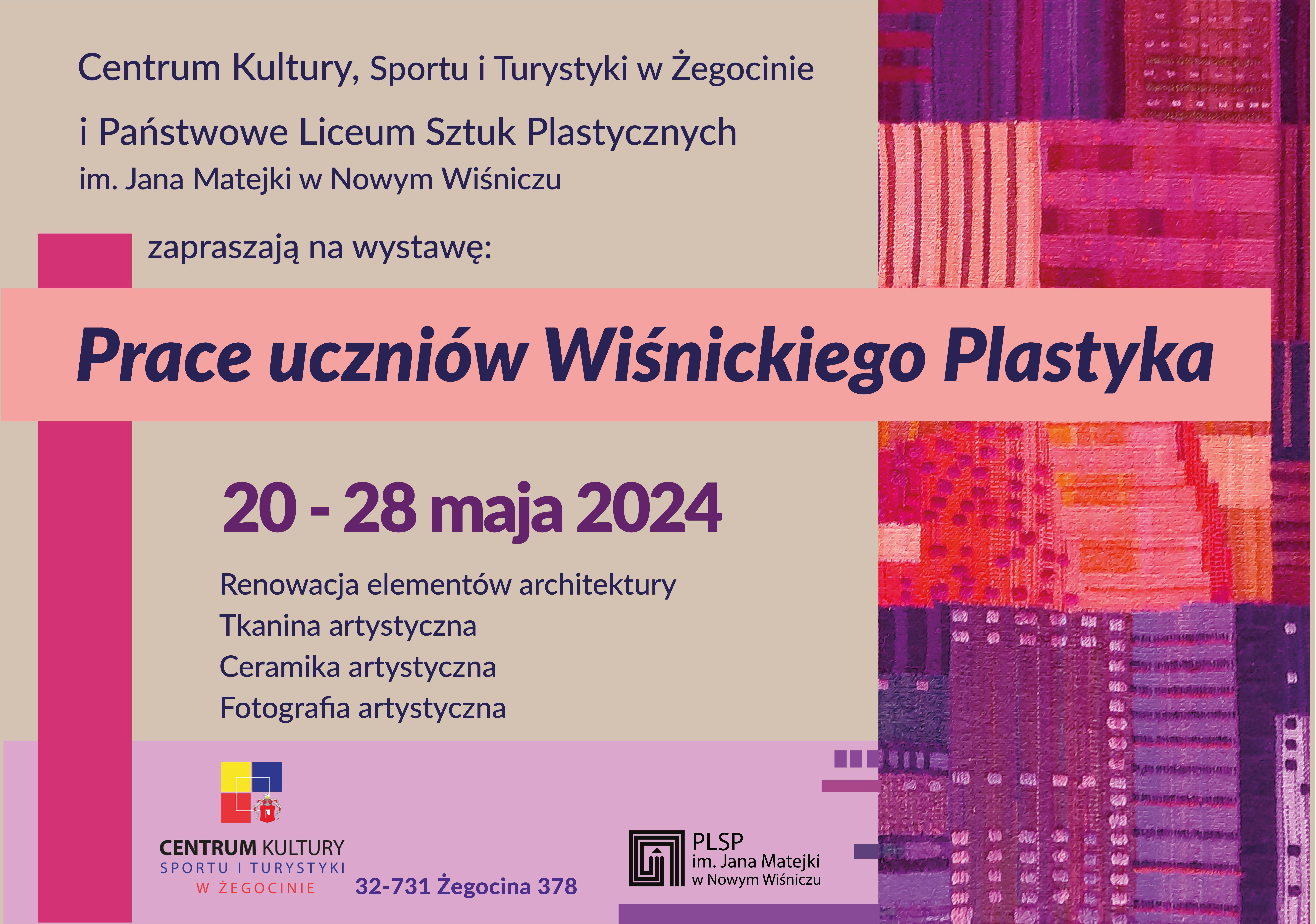 W Centrum Kultury, Sportu i Turystyki w Żegocinie będzie prezentowany publiczności kameralny zestaw prac uczniów Wiśnickiego Plastyka, powstałych na zajęciach specjalizacji artystycznych: ceramika, fotografia, tkanina i renowacja elementów architektury. Wystawa potrwa od 20 do 28 maja. Serdecznie zapraszamy!