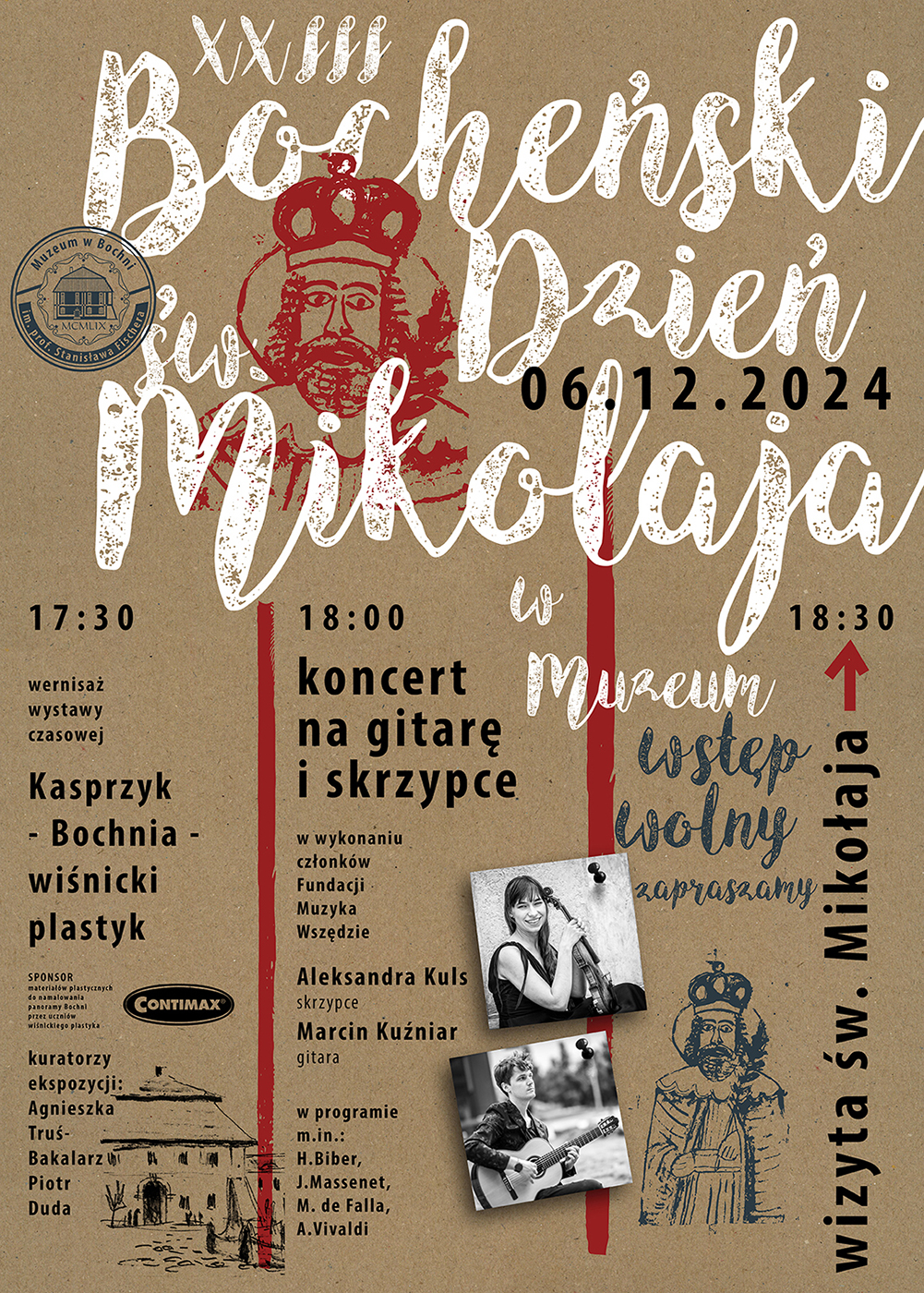 W piątek, 6 grudnia Muzeum im. prof. Stanisława Fischera w Bochni zaprasza na XXIII Bocheński Dzień św. Mikołaja, który rozpocznie o godz. 17.30 wernisaż wystawy czasowej "Kasprzyk – Bochnia – wiśnicki plastyk", przygotowanej przez Agnieszkę Truś-Bakalarz oraz Piotra Dudę. Następnie o godz. 18.00 odbędzie się koncert na gitarę i skrzypce w wykonaniu członków Fundacji Muzyka Wszędzie – Aleksandry Kuls (skrzypce) i Marcina Kuźniara (gitara). Ostatnim punktem programu będzie oczywiście wizyta św. Mikołaja zaplanowana o godz. 18.30.