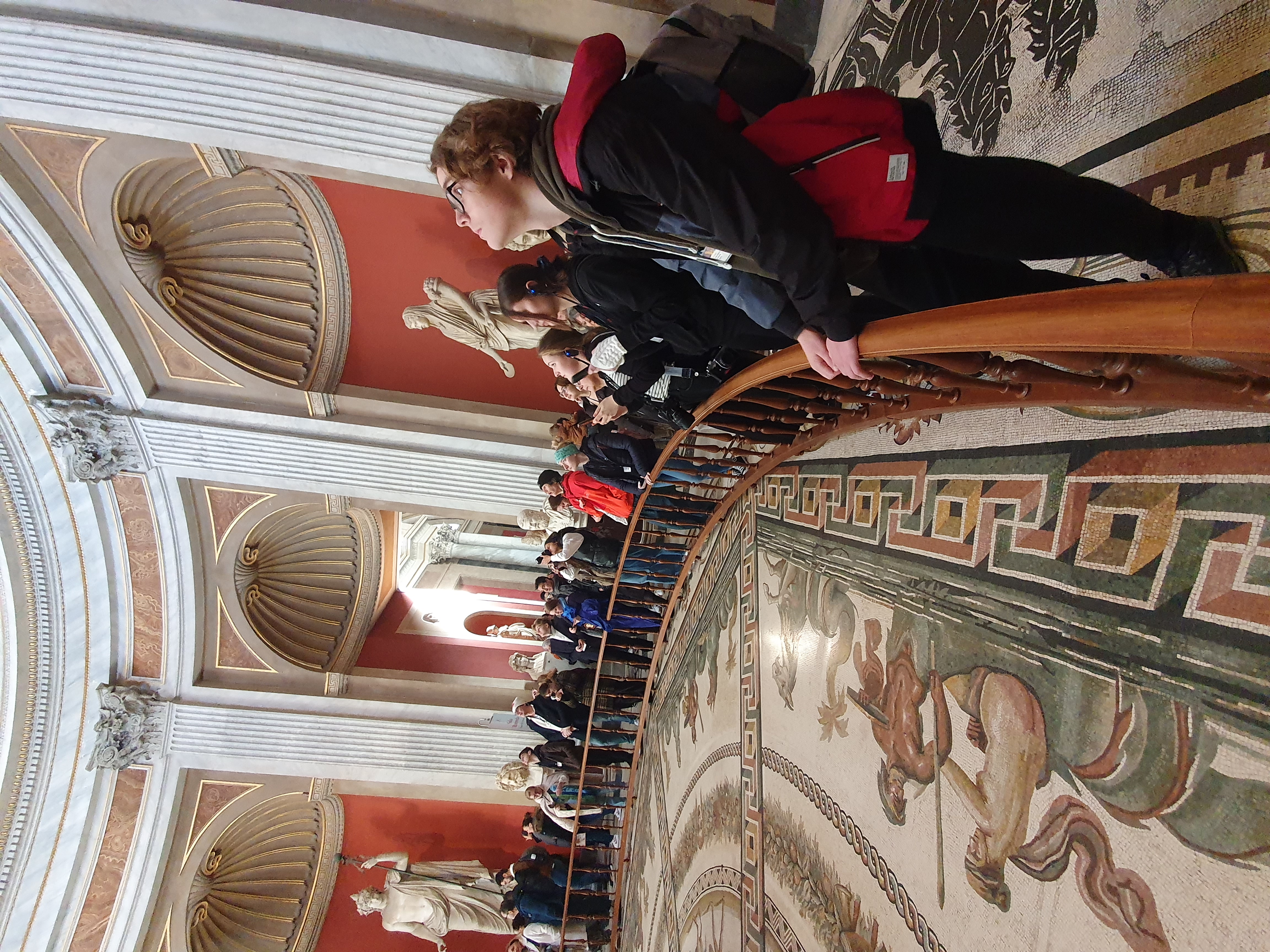 We wtorek 7 lutego, po śniadaniu, udaliśmy się do Muzeów Watykańskich, gdzie zostaliśmy oprowadzeni przez polskojęzycznego przewodnika. Zostaliśmy zapoznani z planem kompleksu oraz poznaliśmy najważniejsze obiekty i artefakty. W licznych salach muzeum podziwialiśmy dzieła malarskie i freski najwybitniejszych włoskich artystów: Rafaela Santi (w tym słynne Stance Watykańskie) Micheangelo Merisi Caravaggio (Złożenie do grobu) Leonardo da Vinci, Paolo Veronese, czy Jana Matejki (Jan Sobieski pod Wiedniem) i in. Pośród licznych dzieł rzeźbiarskich reprezentujących kulturę antycznej Grecji oraz obiektów rzemiosła artystycznego starożytnych Rzymian dostrzegliśmy perły kolekcji, czyli marmurową kompozycję rzeźbiarską zwaną Grupą Laokoona oraz Tors Belwederski. W trakcie zwiedzania nasze oczy przyciągały detale architektoniczne oraz ozdobne podłogowe i ścienne mozaiki. Ukoronowaniem zwiedzania sal muzealnych była Kaplica Sykstyńska z freskami Michała Anioła zdobiącymi sufit oraz ścianę frontową. Na zakończenie udaliśmy się do Bazyliki św. Piotra, gdzie naszym oczom ukazał się baldachim nad grobem św. Piotra zaprojektowany przez Gianlorenzo Bernini, słynna Pieta wykonana w karraryjskim marmurze przez młodego Michała Anioła, płaskorzeźbione epitafium autorstwa Antonio Canovy oraz liczne rzeźby i mozaiki ścienne (w tym kopie dzieł Rafaela) wykonane przez znakomitych włoskich mistrzów. Zwiedzanie bazyliki zostało zwieńczone wyprawą na kopułę, skąd podziwialiśmy panoramę miasta i wykonaliśmy pierwsze szkice. W drodze powrotnej do miejsca zakwaterowania zjedliśmy włoską obiadokolację i wykonaliśmy wieczorne zdjęcia na Placu św. Piotra.
