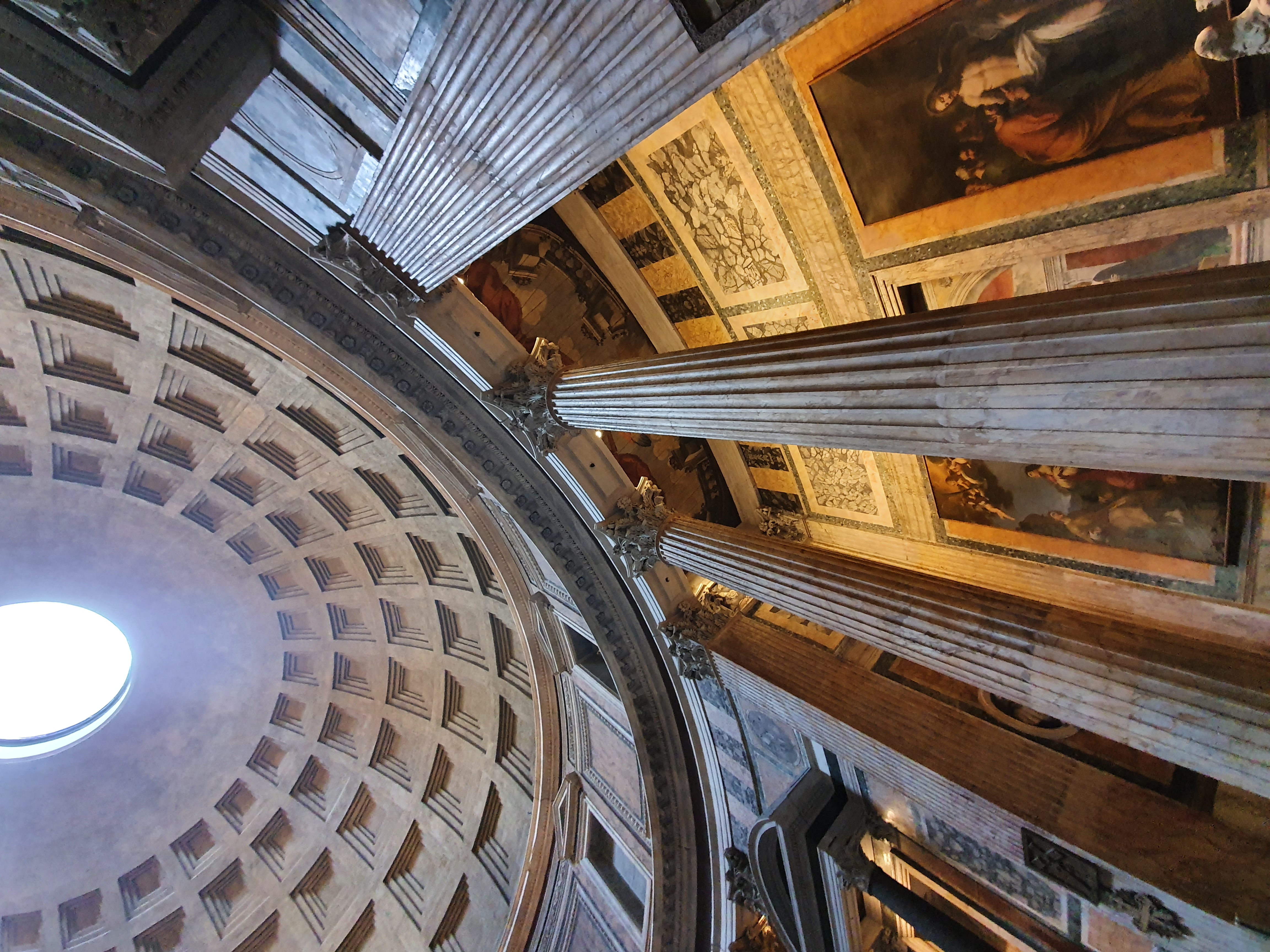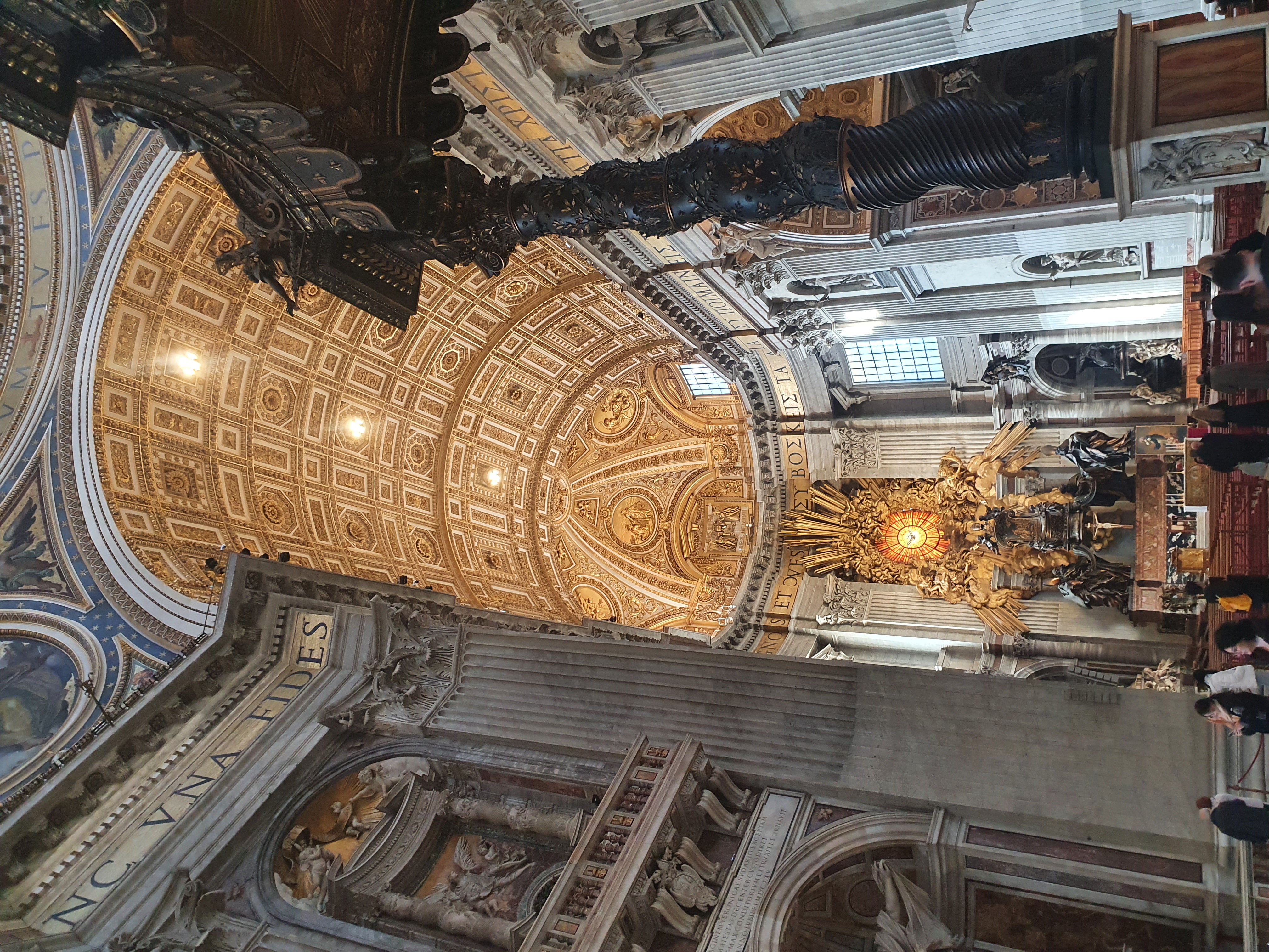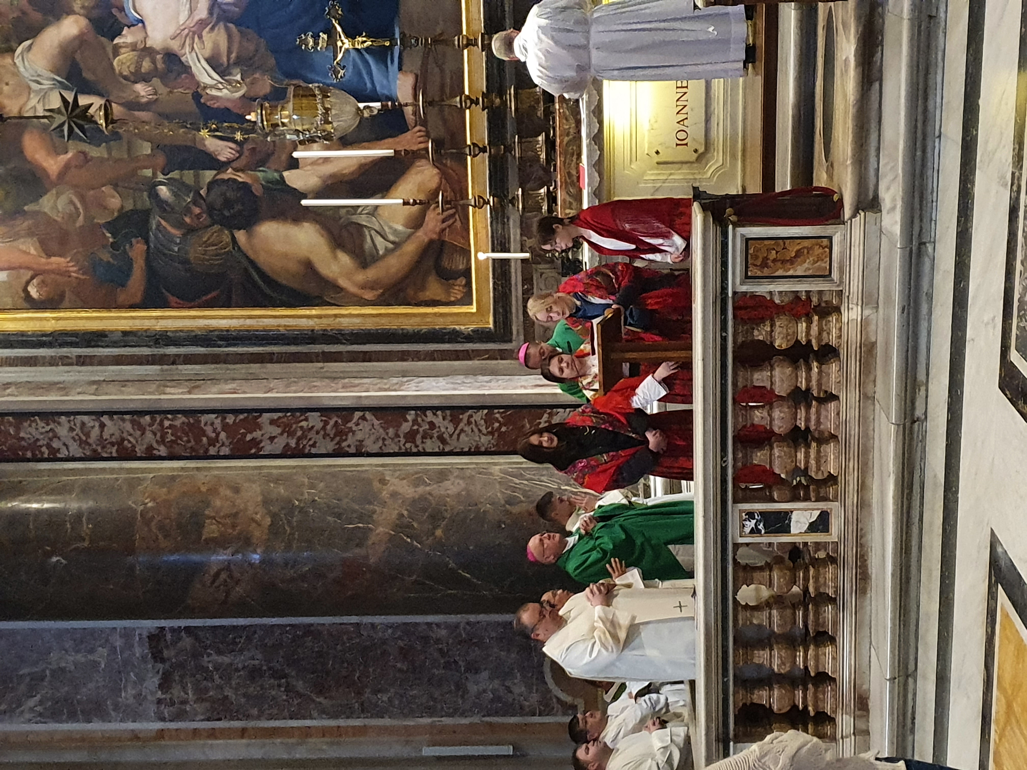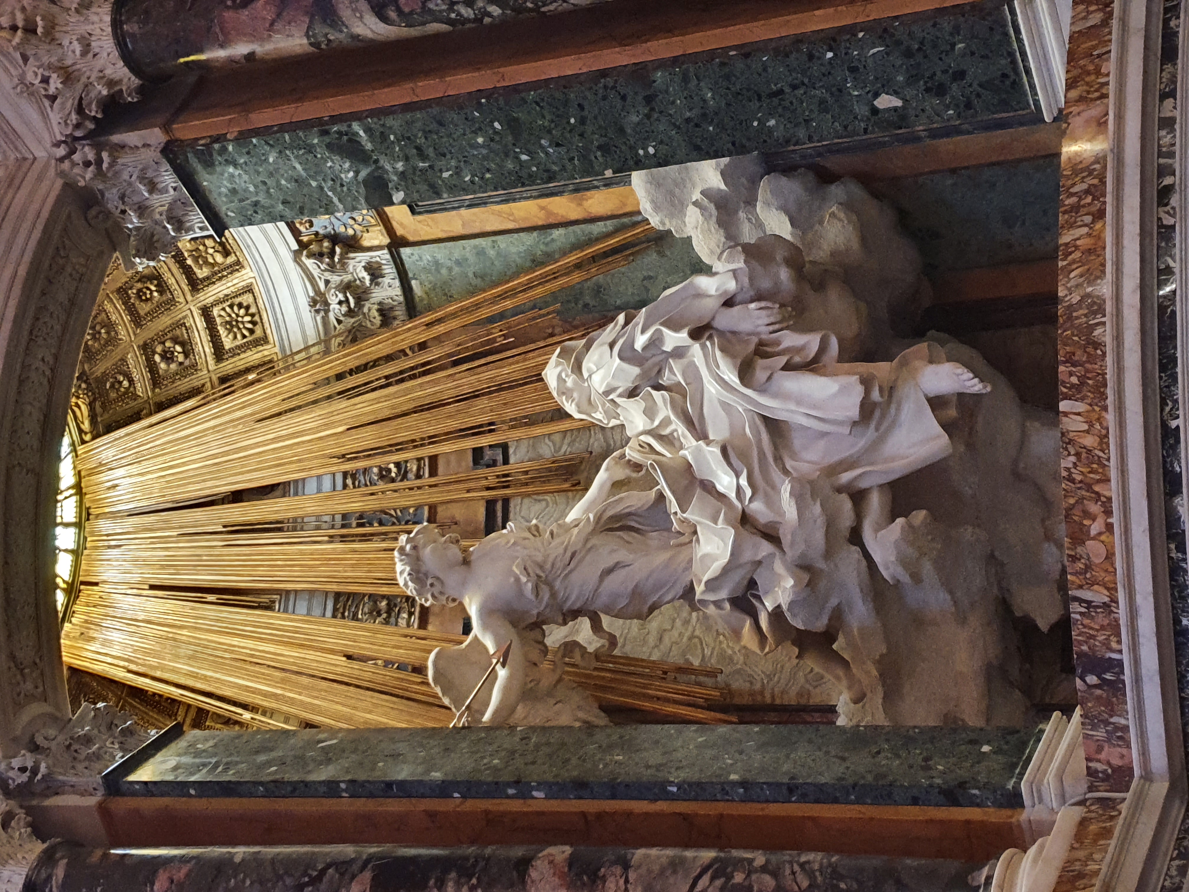 Siódmy dzień pleneru - niedzielę 12 lutego rozpoczęliśmy Mszą św. w kościele San Salvatore in Onde, gdzie znajdują się doczesne szczątki św. Wincentego Pallotti. Tu nastąpiło nasze spotkanie z przełożonymi żeńskiego zakonu Sióstr Pallotynek, które gościły nas w domu swojego zgromadzenia w trakcie naszego pobytu w Rzymie. Po spotkaniu wróciliśmy w rejon Bazyliki św. Piotra, gdzie uczestniczyliśmy w modlitwie Anioł Pański prowadzonej przez papieża Franciszka oraz wygospodarowaliśmy czas na plener rysunkowo - malarski. Po upływie wyznaczonego na tę aktywność czasu, wyruszyliśmy do Bazyliki św. Jana na Lateranie, gdzie uzupełniliśmy naszą wiedzę na temat historii kościoła katolickiego w Rzymie. Wizyta była też okazją do praktyki religijnej, jaką było wspięcie się po Świętych Schodach, które znajdują się w pobliżu. W programie naszego pleneru uwzględniliśmy także odwiedzenie kościoła Matki Boskiej Zwycięskiej, gdzie naszym oczom ukazał się spektakularny teatr formy i światła, czyli aranżacja dzieła rzeźbiarskiego autorstwa Gianlorenzo Bernini - Ekstaza świętej Teresy. W kościele Santa Maria del Popolo odnaleźliśmy kolejne wybitne dzieła Caravaggia: Nawrócenie św Pawła oraz Męczeństwo św. Pawła.
