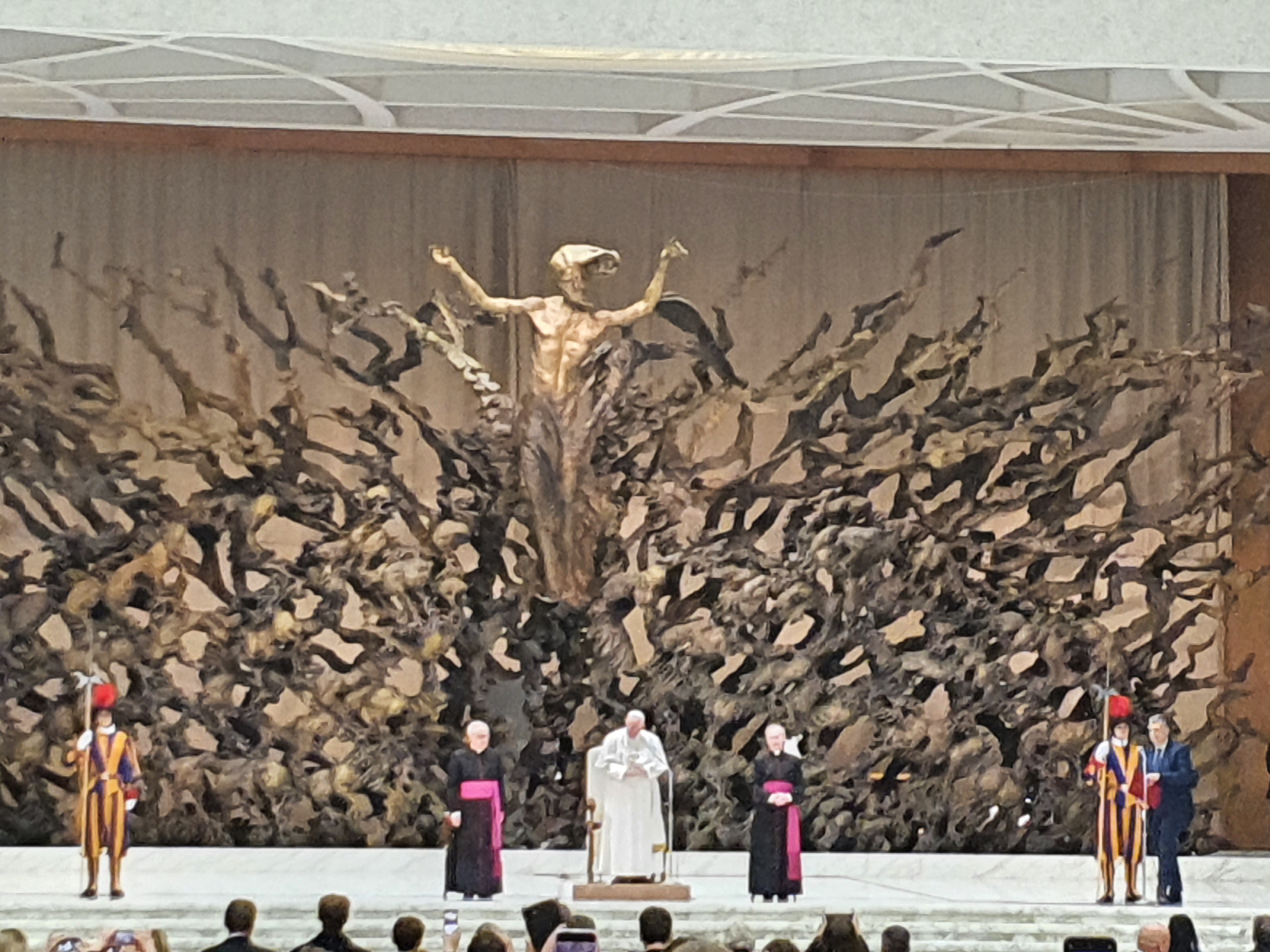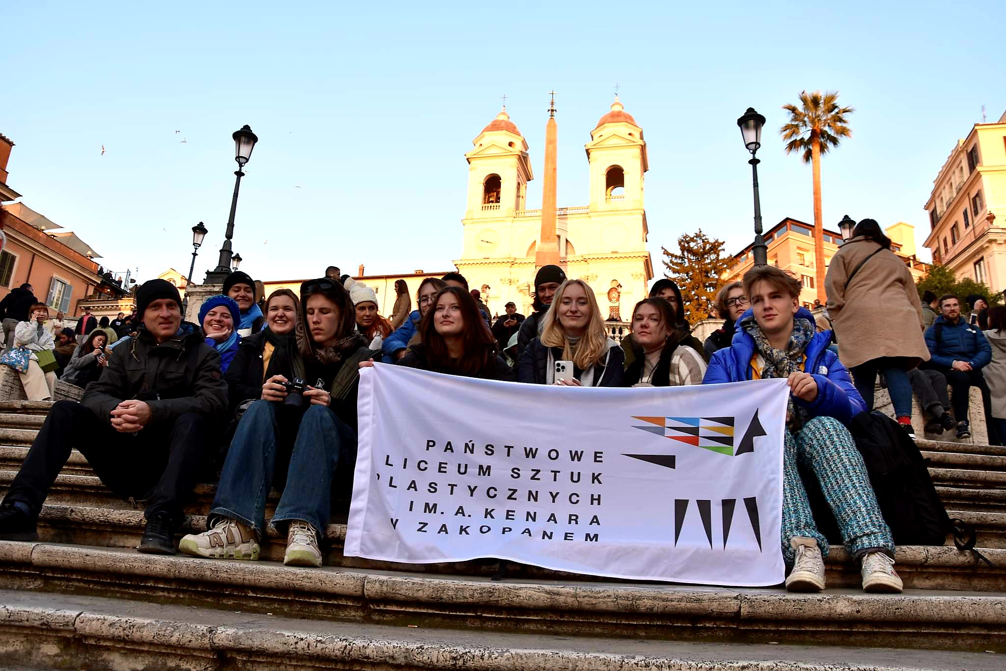 Trzeci dzień pobytu w Rzymie, środa 8 lutego, rozpoczął się bardzo wcześnie. Po śniadaniu udaliśmy się na Audiencję Generalną z Papieżem Franciszkiem do sali audiencyjnej Pawła VI. Założyliśmy odświętne stroje z regionalnym akcentem. W celu identyfikacji grupy zabraliśmy ze sobą flagę narodową oraz baner z nazwą i logo Szkoły. W trakcie audiencji Ojciec Święty podzielił się refleksjami z niedawno zakończonej pielgrzymki do Afryki. Słowo Papieża zostało przetłumaczone i powtórzone w wielu językach. Jesteśmy szczególnie dumni, że w trakcie spotkania udało się nam przekazać na ręce Papieża Franciszka upominek w postaci pejzażu górskiego - widoku ośnieżonych Tatr, namalowanego przez Annę Mazur, uczennicę klasy 4A. Po przyjęciu błogosławieństwa i wykonaniu pamiątkowych fotografii wróciliśmy do domu Sióstr Pallotynek i przygotowaliśmy się do artystycznej wyprawy przez most Anioła w kierunku Placu Navona. W trasie zwiedziliśmy Zamek Anioła wraz z wystawą kostiumów scenicznych Francy Rame. Spacer wzdłuż Tybru obfitował w subtelne pejzaże, które dokumentowaliśmy na fotografiach. Plac Navona zachwycił nas pięknymi barokowymi fontannami i tu powstały pierwsze prace malarskie oraz kolejne szkice i rysunki. Następnym etapem naszego pleneru był Panteon ze swoją architekturą i szlachetnymi proporcjami. Podziwialiśmy konstrukcyjne i techniczne rozwiązania zastosowane w obiekcie przez rzymskich budowniczych. W drodze powrotnej wstąpiliśmy do kościoła Św. Ludwika Króla Francji, żeby zobaczyć trzy płótna Caravaggio poświęcone Św. Mateuszowi, czyli: Powołanie św. Mateusza, św. Mateusz z aniołem oraz Męczeństwo św. Mateusza. Obraz ołtarzowy pędzla Piotra Pawła Rubensa Madonna Loretańska z pewnym trudem obejrzeliśmy w remontowanym wnętrzu kościoła Chiesa Nova. Przy okazji zwiedziliśmy miejsce spoczynku twórcy oratoriów Filippo Neri. Po kolacji udaliśmy się na spoczynek.