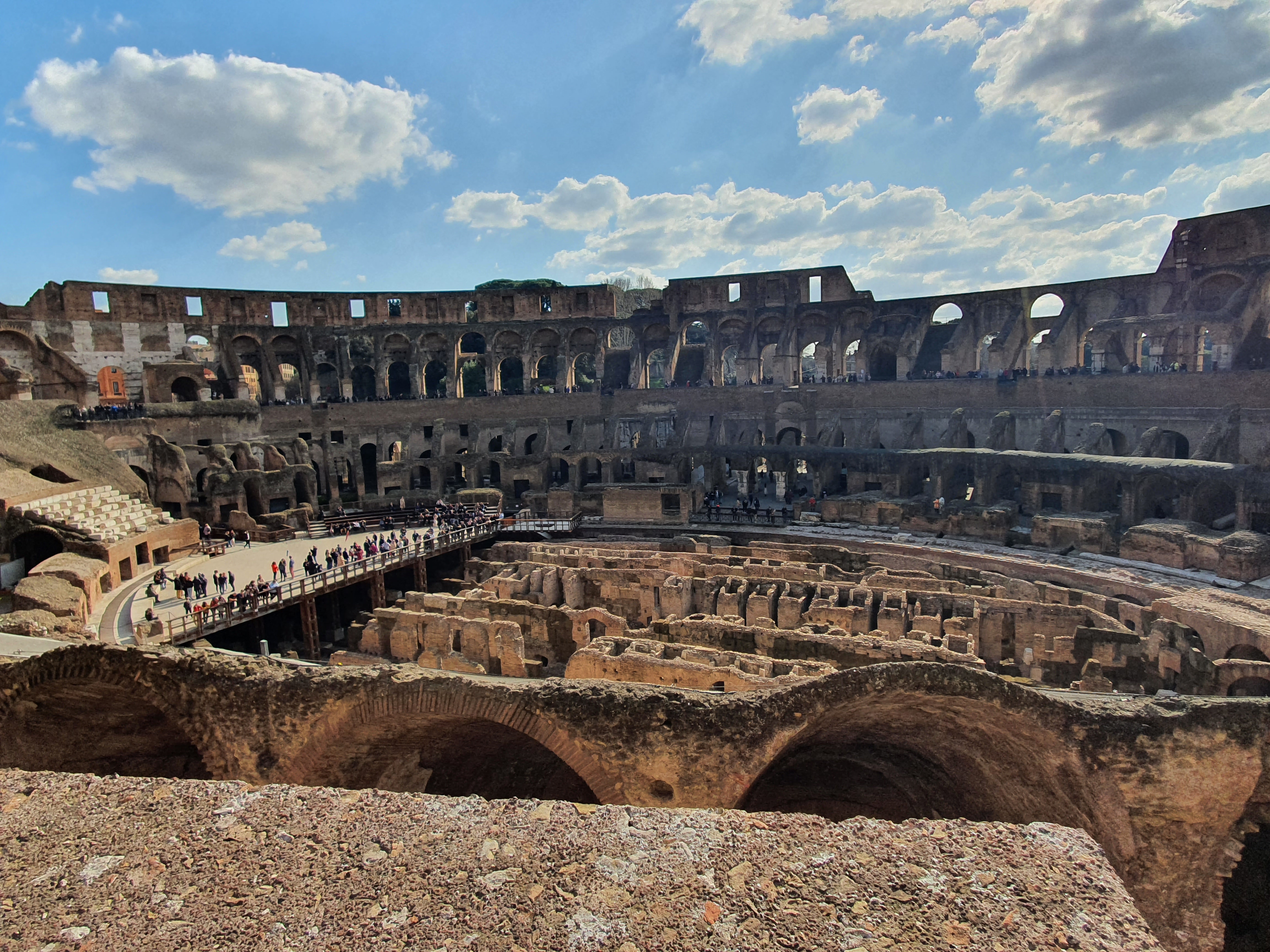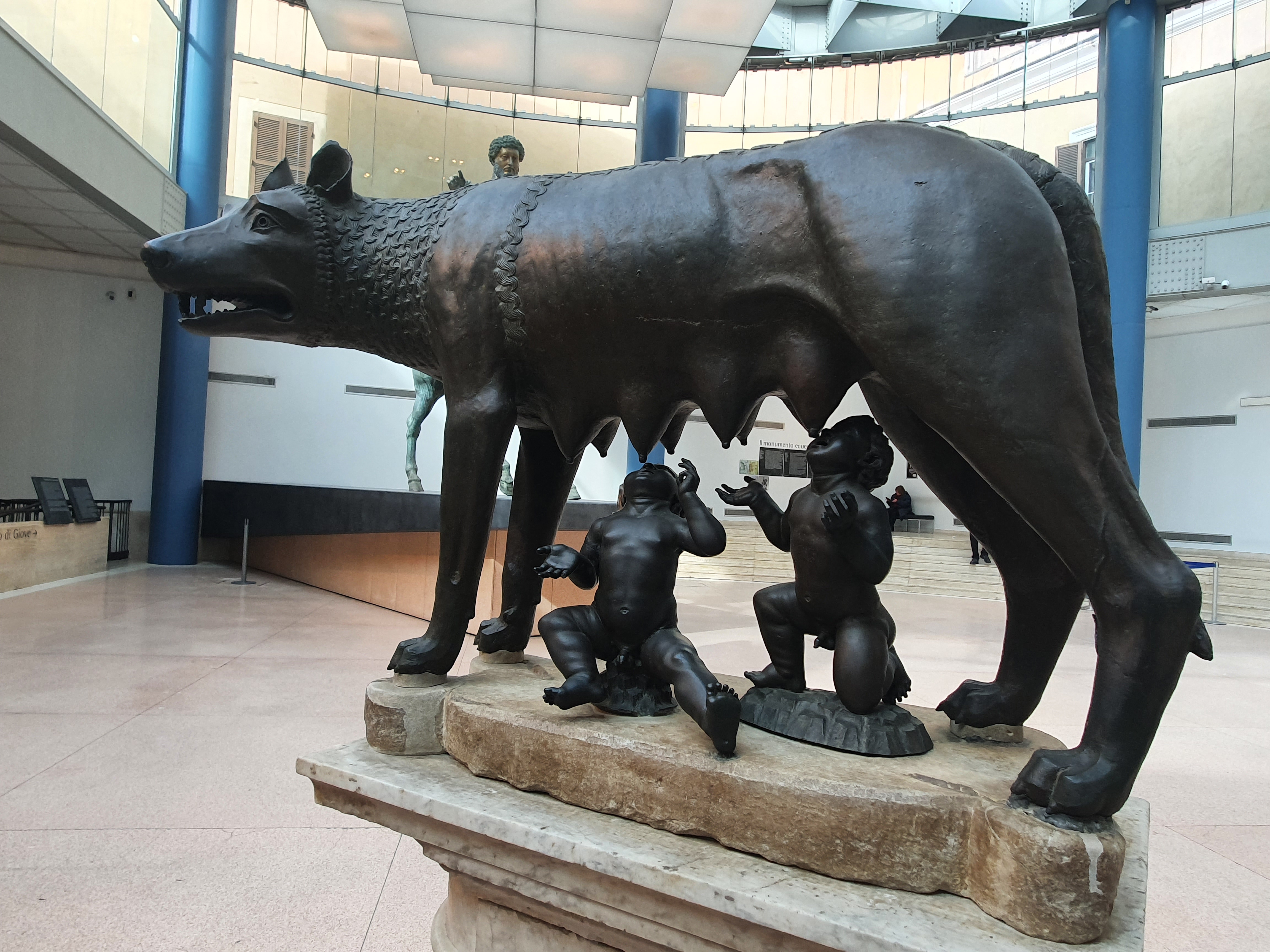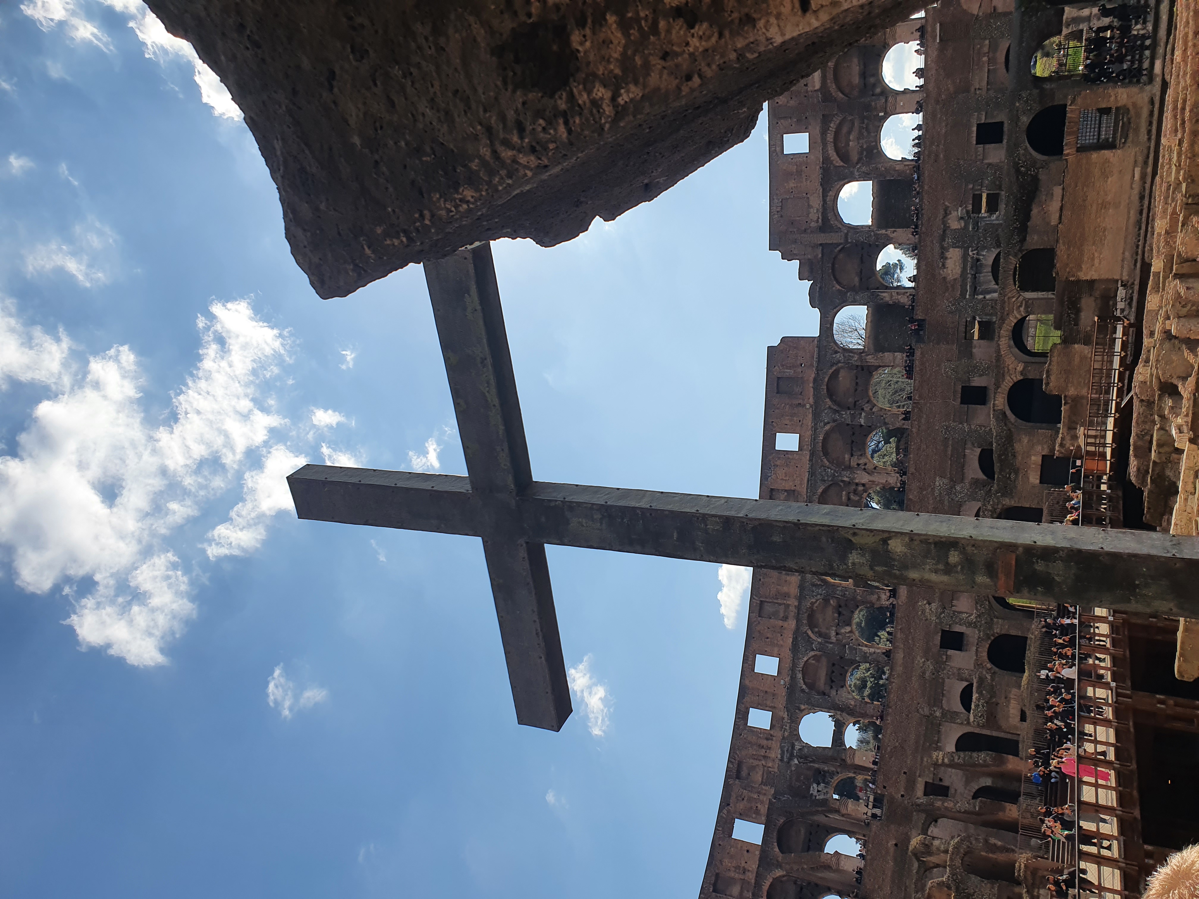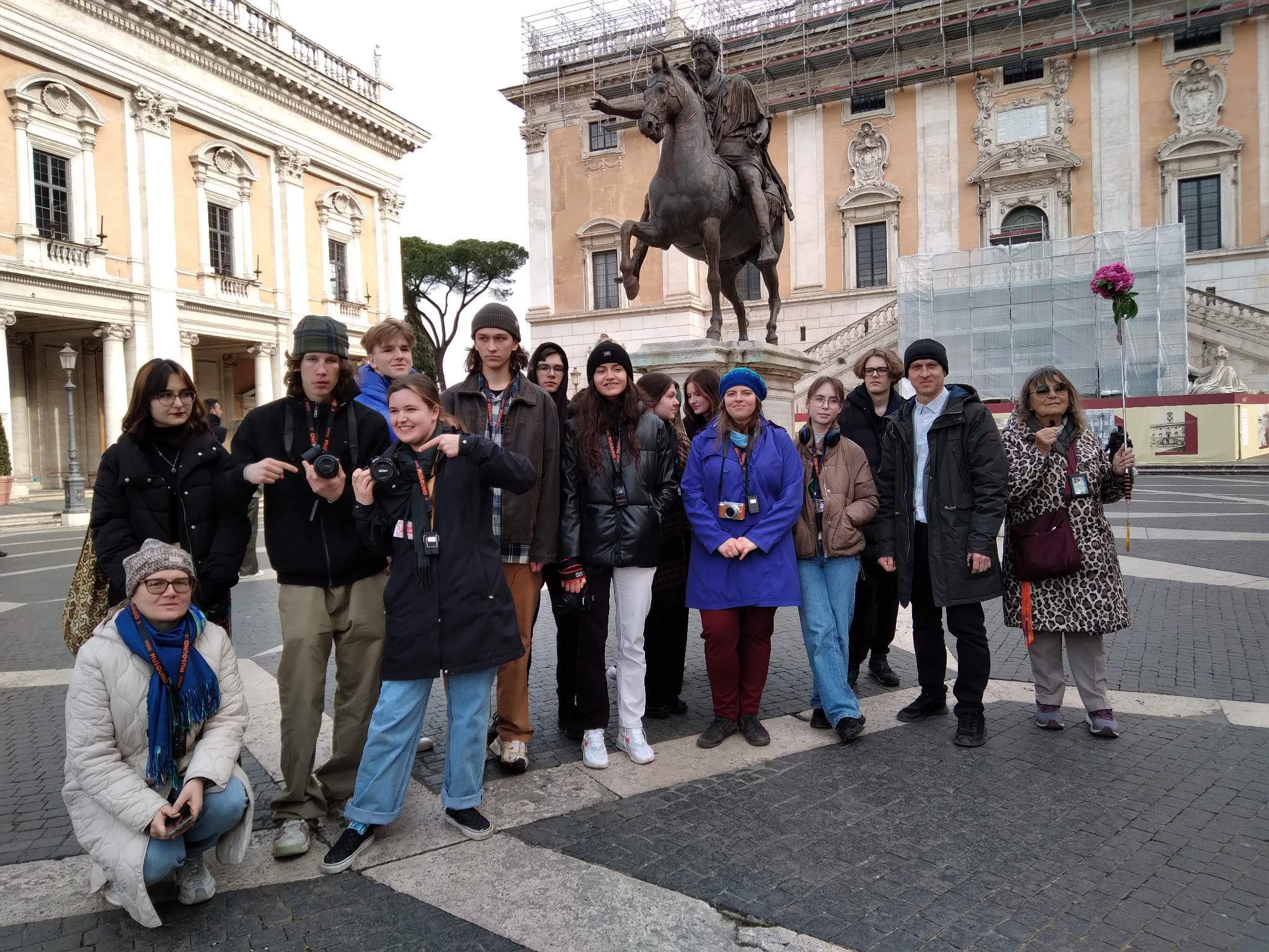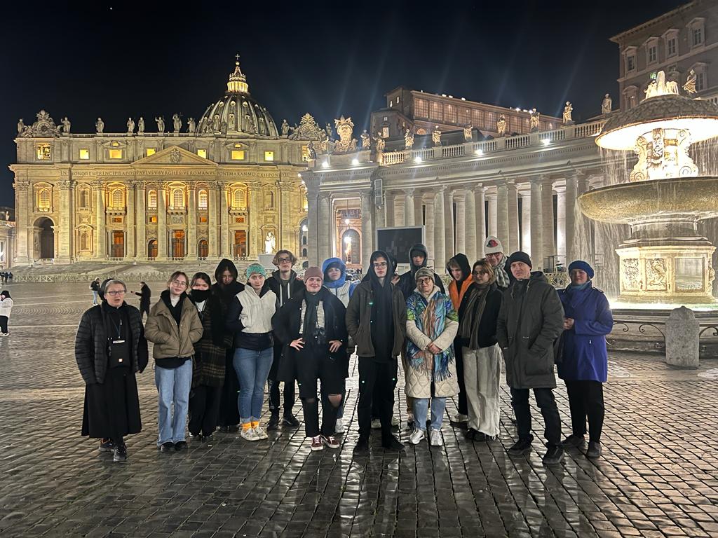 Czwarty dzień naszej wyprawy, czyli 9 lutego rozpoczęliśmy od porannej mszy świętej odprawionej w języku polskim przy grobie Jana Pawła II w Bazylice św. Piotra. Mszy św. koncelebrowanej przewodniczył biskup Grzegorz Ryś wraz z Jałmużnikiem Papieskim biskupem Konradem Krajewskim. We mszy św. uczestniczyliśmy w odświętnych i regionalnych strojach, a nasze uczennice odczytały modlitwę wiernych. W bazylice wykonaliśmy serię pamiątkowych zdjęć. Po śniadaniu wyruszyliśmy w kierunku Placu Weneckiego i skierowaliśmy się do Pałacu Bonaparte, gdzie ma miejsce czasowa wystawa dzieł Vincenta van Gogha z kolekcji Kröller-Müller Museum w Hadze. Na wystawie zaprezentowano 50 dzieł artysty w porządku chronologicznym, a kolekcja została uzupełniona materiałem fotograficznym, informacjami biograficznymi, a nawet osobistymi przedmiotami, które pozwalają lepiej zrozumieć fenomen twórczej osobowości van Gogha. Wystawę dopełnia sala multimedialna. Po obejrzeniu wystawy przeszliśmy na Wzgórze Kapitolińskie. Po uwiecznieniu przy pomocy aparatów fotograficznych perspektywy starożytnego Rzymu wraz z panią przewodnik udaliśmy się do Muzeum Kapitolińskiego. Mogliśmy się tutaj zapoznać z rękodziełem i artefaktami kultury etruskiej. Obejrzeliśmy bogatą kolekcję portretów patrycjuszek i patrycjuszy rzymskich uwiecznionych w marmurze oraz rzymskie kopie antycznych dzieł greckich, w tym posąg Wenus Medycejskiej. Z oryginalnych dzieł rzymskich uwagę przykuwał Umierający Gal. Podziwialiśmy symbol miasta w postaci odlanej w brązie Wilczycy Kapitolińskiej oraz oryginalny konny posąg Marka Aureliusza, a także Chłopca wyciągającego ze stopy cierń. Kolekcji dopełniały kunsztowne ścienne i podłogowe mozaiki. Spacer wzdłuż antycznych ruin w kierunku Koloseum obfitował w ciekawe widoki do fotografowania.