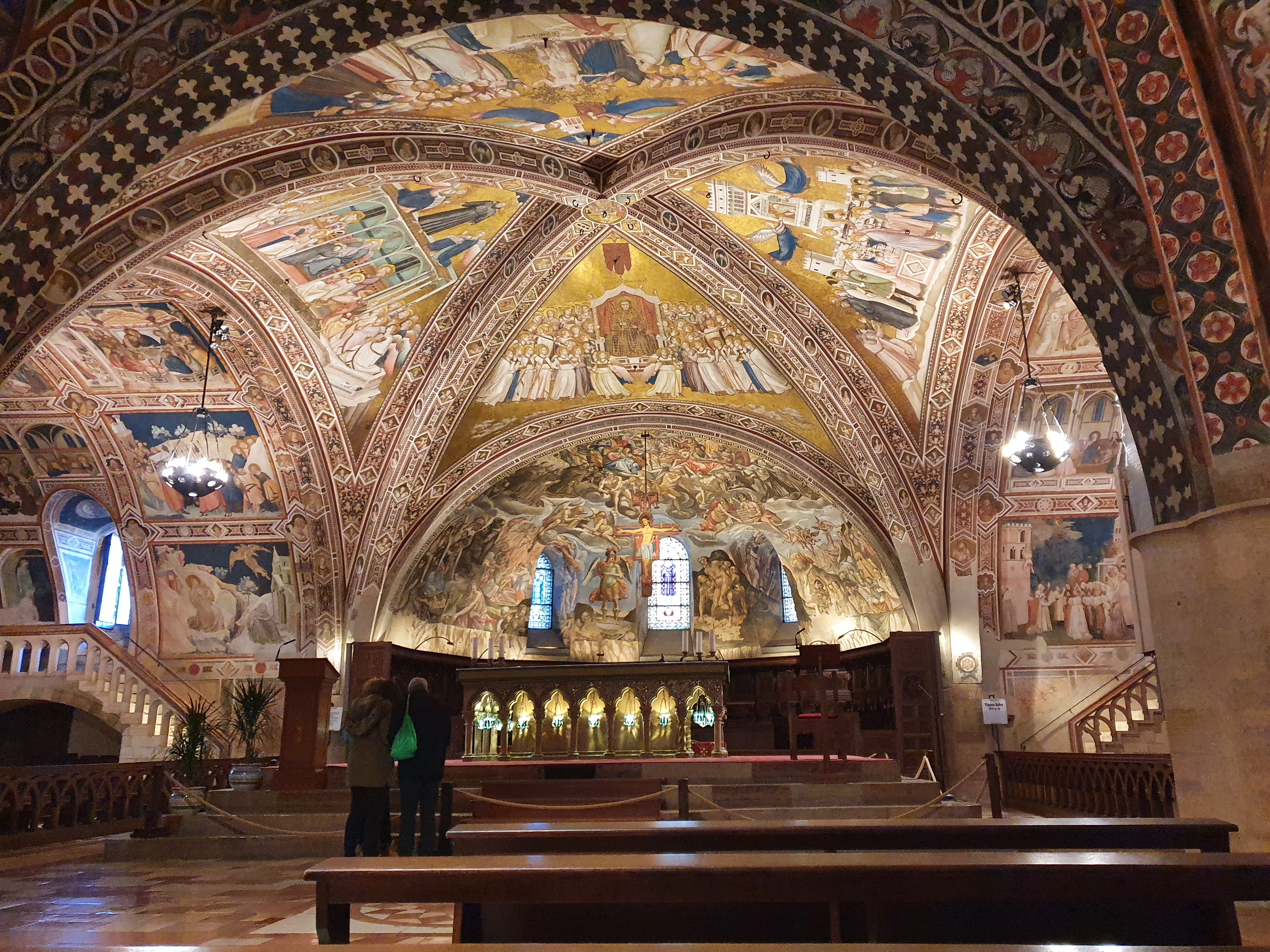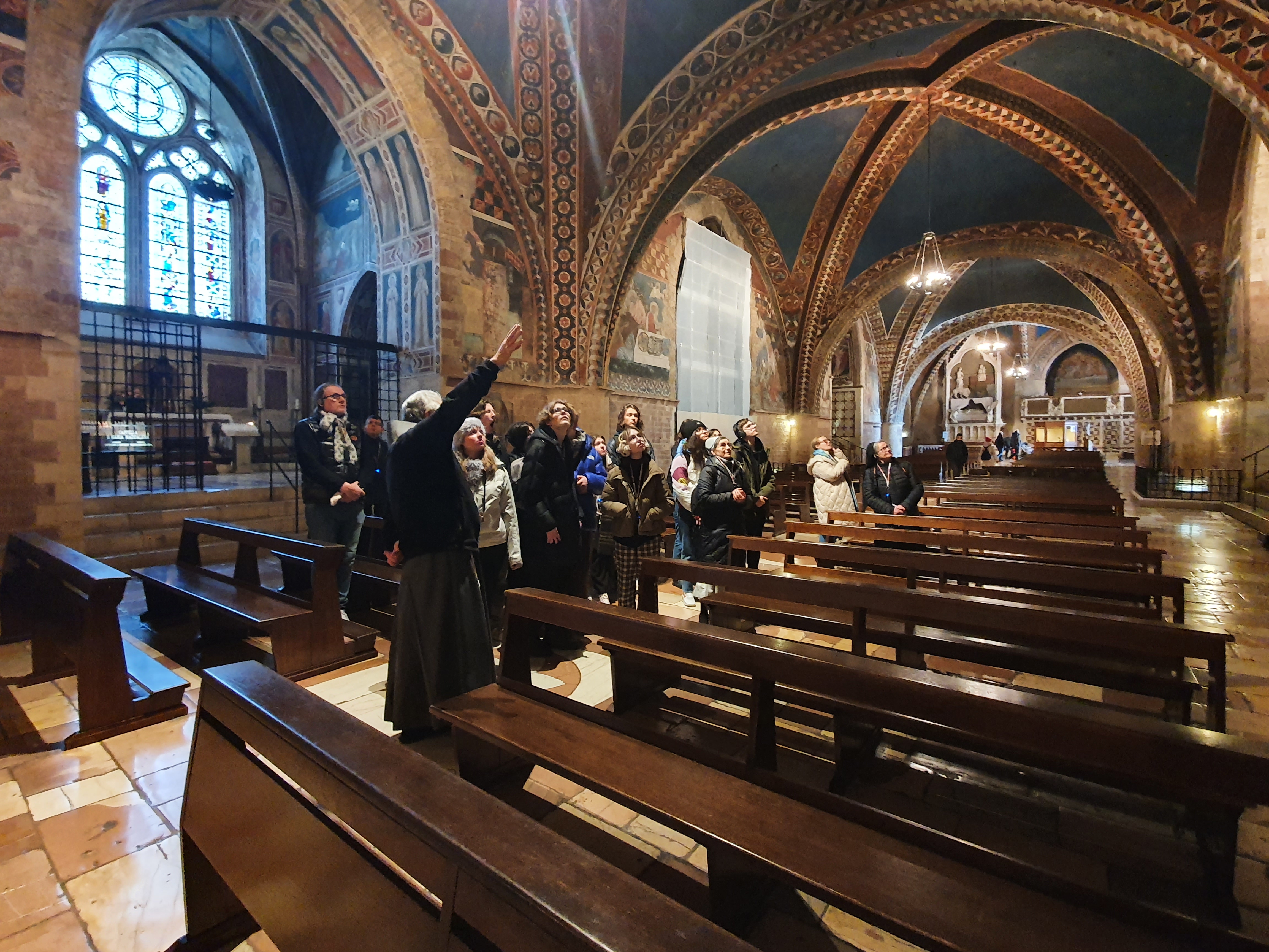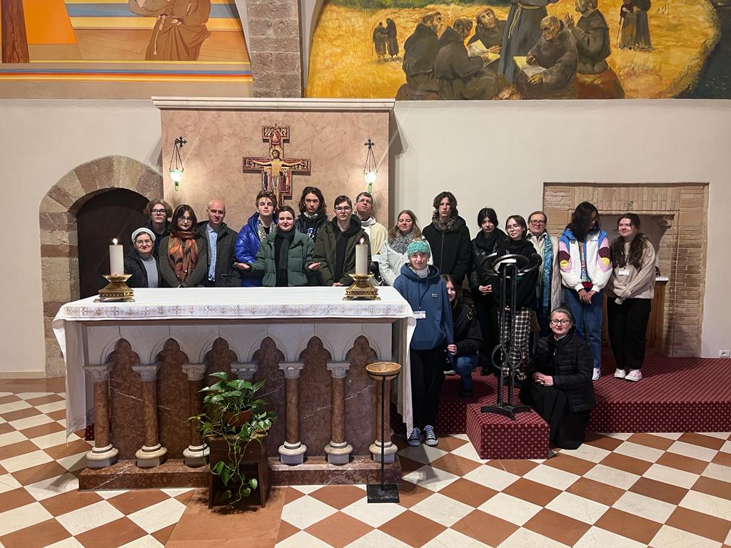 Piątego dnia pleneru, czyli 10 lutego, wyruszyliśmy pociągiem do Asyżu. Dotarliśmy na miejsce po 2 godzinach podróży urozmaiconej pejzażami zielonej - pomimo zimowej pory Umbrii, przemykającymi za oknami wagonu. Asyż przywitał nas kobaltowym niebem, które towarzyszyło nam do końca dnia. Po mszy świętej odprawionej w Bazylice św. Franciszka w intencji Uczniów i Pracowników Szkoły, zwiedziliśmy zespół świątyni wraz z przewodnikiem. Dowiedzieliśmy się wielu interesujących faktów z życia Świętego Franciszka i wpływie, jaki wywarł na kościół. Opowieść przewodnika odzwierciedlała się w przedstawieniach pokazanych na freskach autorstwa Giotto di Bondone, ukazujących życie świętego. Tematyka fresków wykonanych przez Cimabuego oraz Giotto nawiązywała także do Pisma Świętego i stanowiła tzw. biblię pauperum. Widzieliśmy także historyczne pamiątki: rzeczy osobiste i dokument z podpisem św. Franciszka. Korzystając z pięknej, słonecznej pogody, młodzież podzieliła pozostały czas na pracę artystyczną oraz zwiedzanie malowniczych zaułków Asyżu.