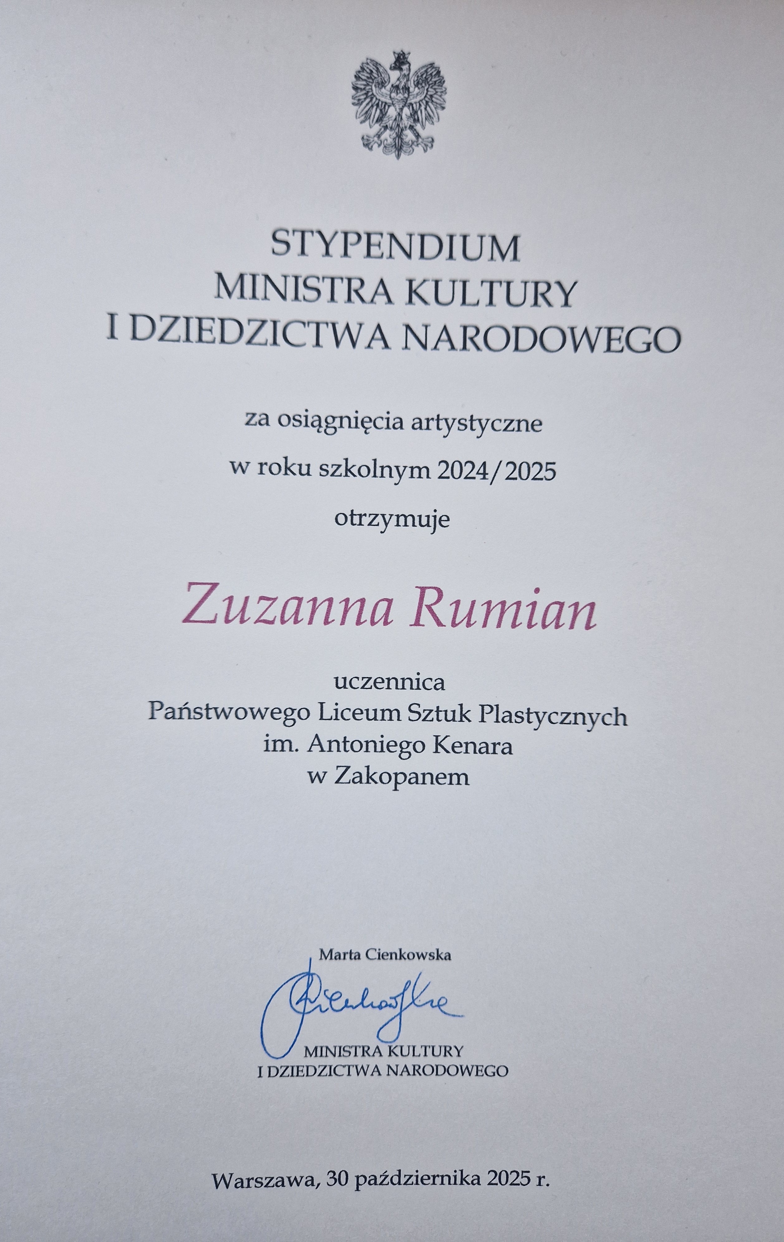 Z satysfakcją informujemy, że ZUZANNA RUMIAN uczennica kl. 5B Państwowego Liceum Sztuk Plastycznych im. Antoniego Kenara w Zakopanem otrzymała Stypendium Ministra Kultury i Dziedzictwa Narodowego za osiągnięcia artystyczne uzyskane w roku szkolnym 2024/2025.