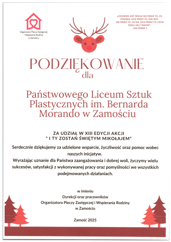Z radością informujemy, że szkolna akcja „I Ty zostań świętym Mikołajem”, organizowana we współpracy z Organizatorem Pieczy Zastępczej i Wspierania Rodziny w Zamościu, dobiegła końca – i zakończyła się ogromnym sukcesem dzięki wyjątkowemu zaangażowaniu całej społeczności PLSP.