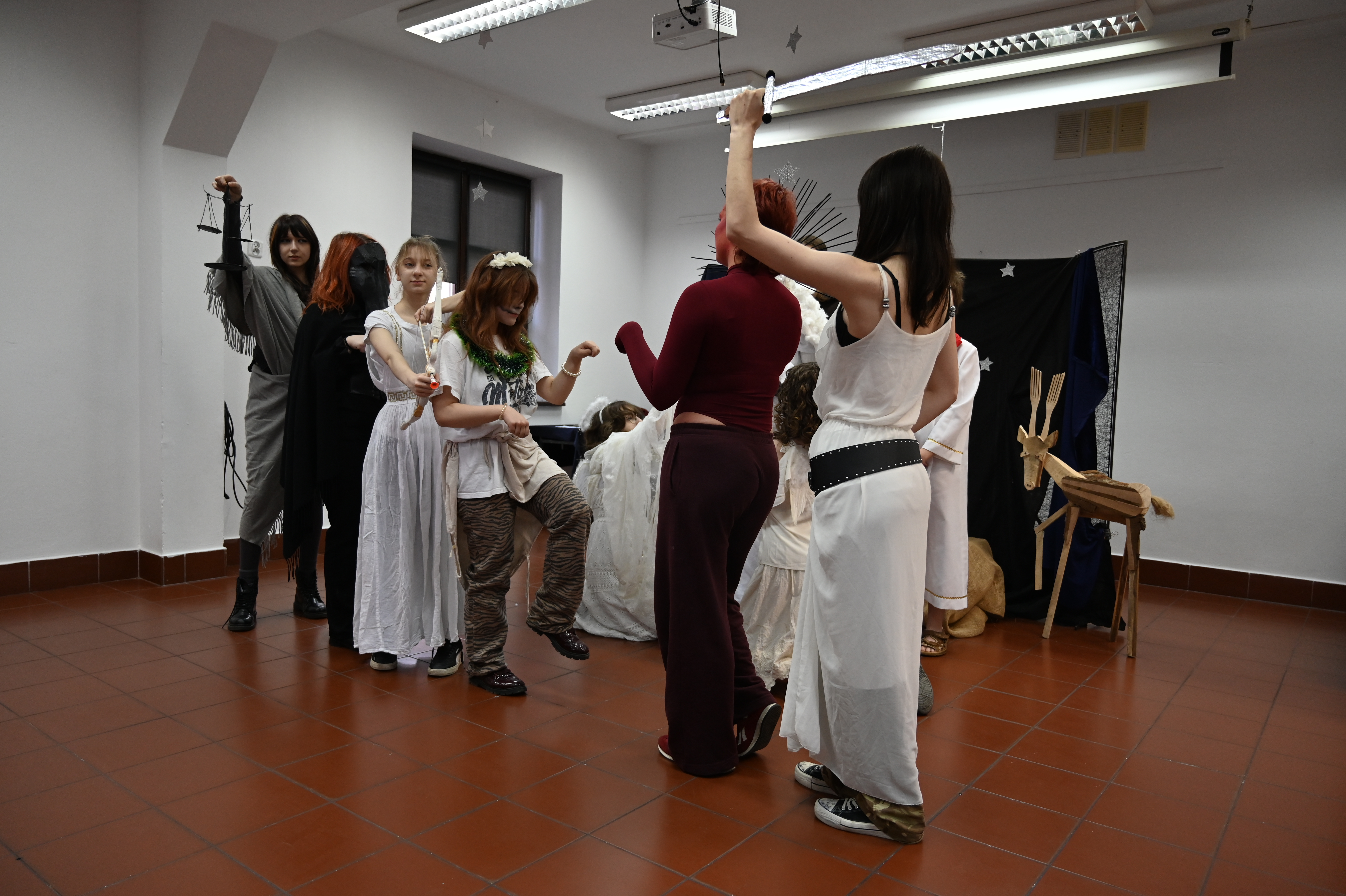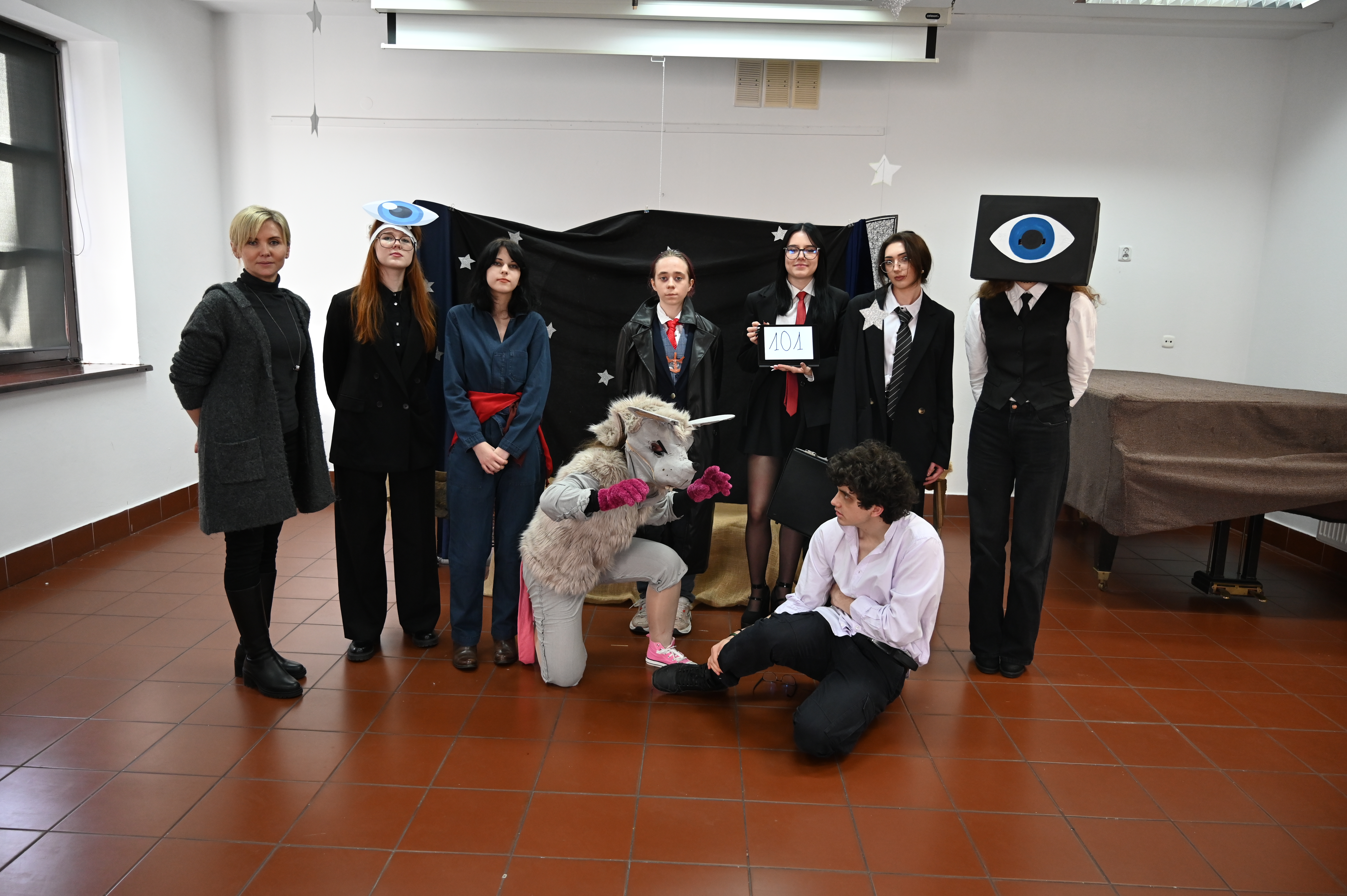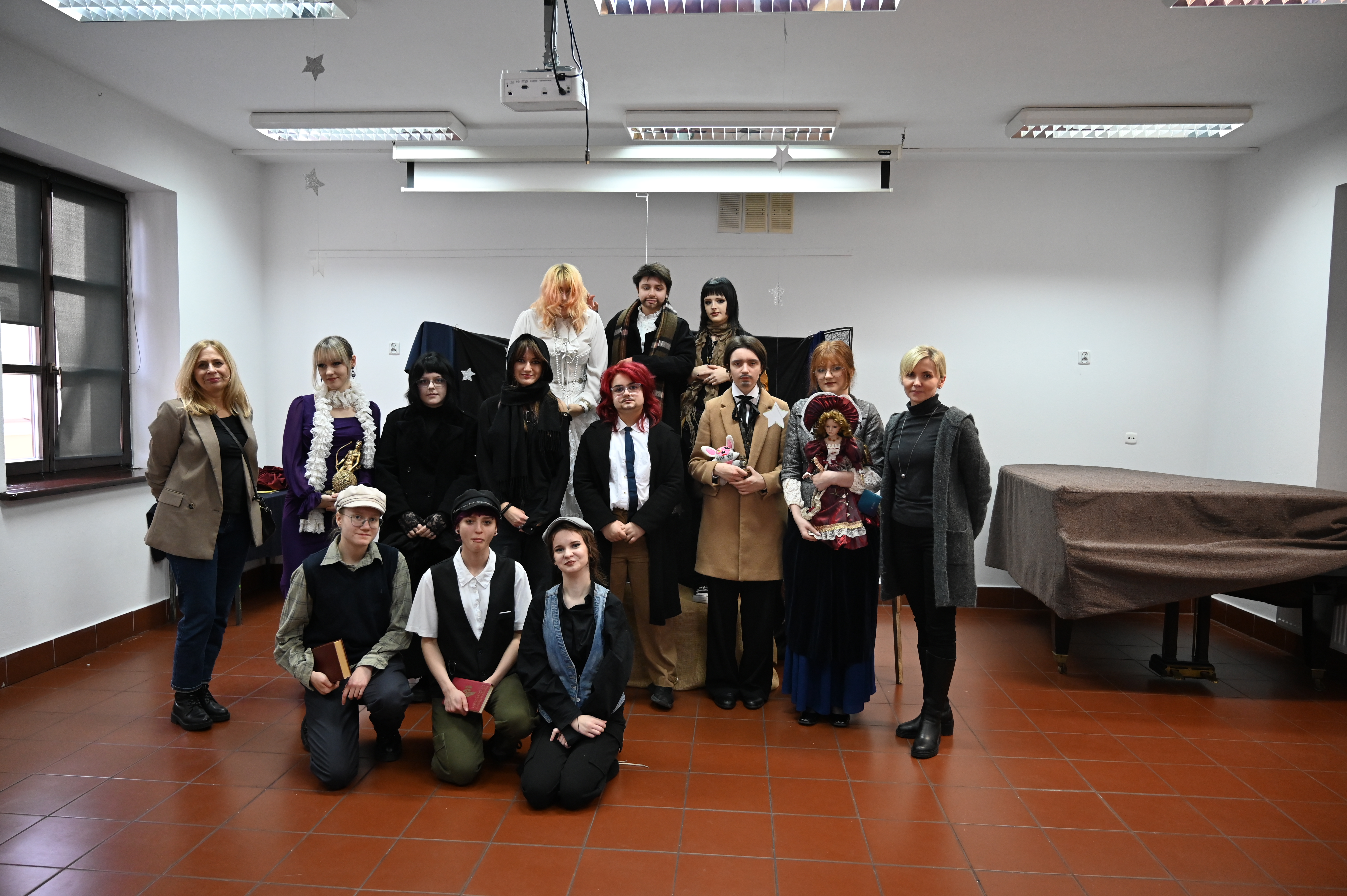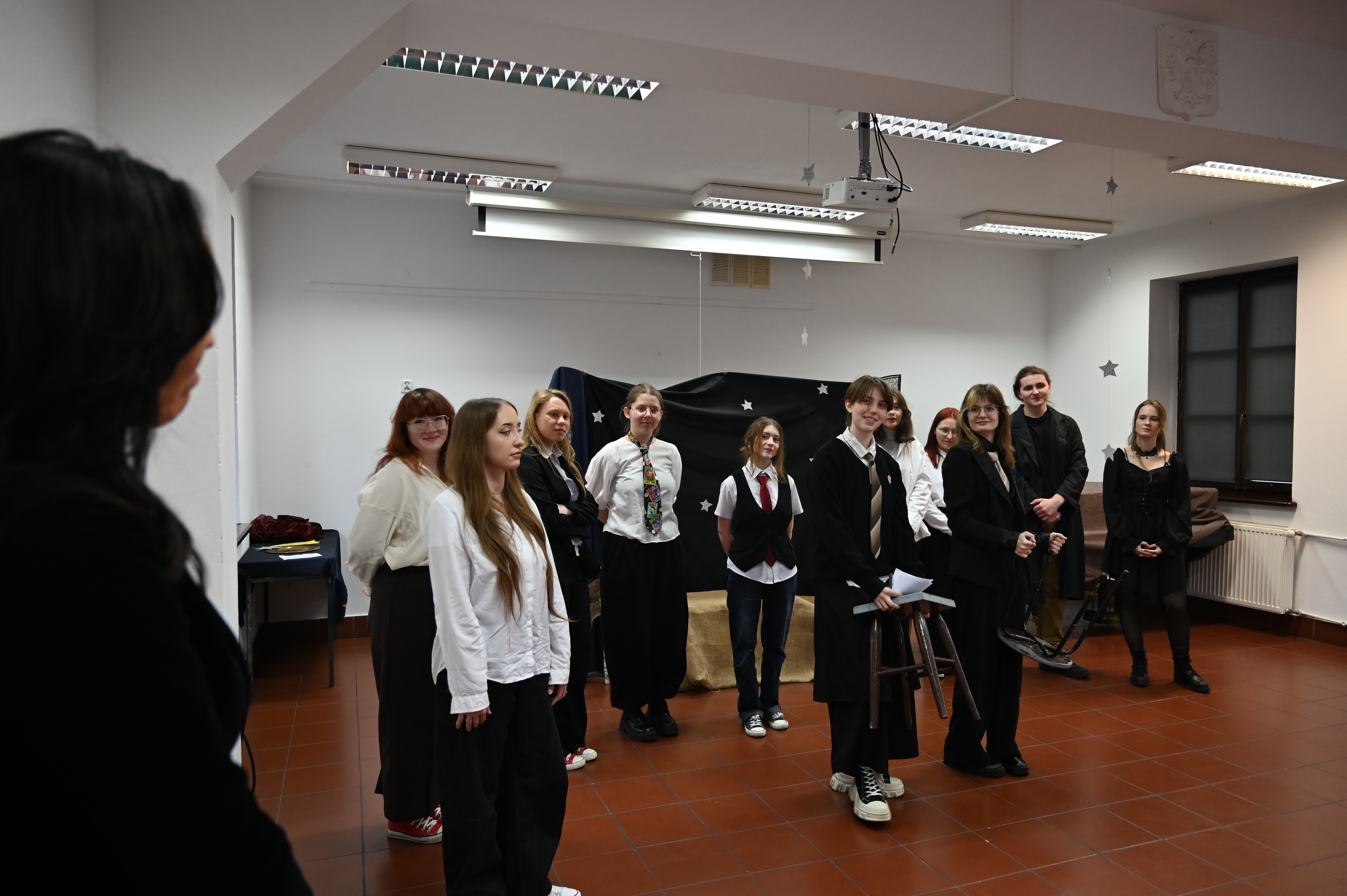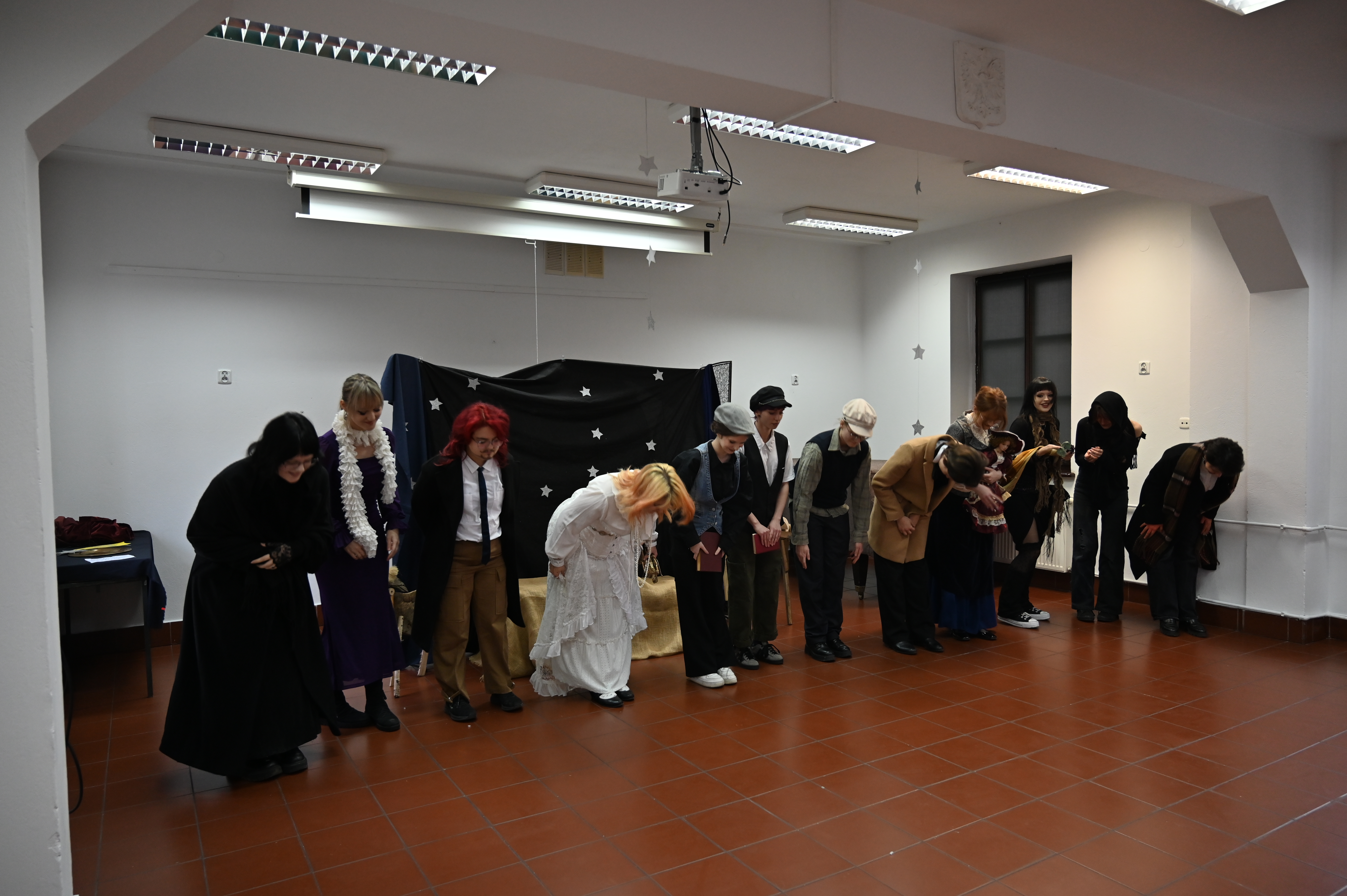 Właśnie w obecności naszych gości odbyły się główne prezentacje lektur. Praca nad projektem trwała kilka tygodni - na lekcjach języka polskiego uczniowie pod okiem nauczycieli polonistów analizowali teksty i wybierali najbardziej kluczowe, ich zdaniem, fragmenty dzieł literackich. Kolejnym etapem była praca nad formą - przekształcenie słowa pisanego w ruch sceniczny, gesty, emocje. Efektem tych działań były wyjątkowe etiudy teatralne. Każda klasa zaprezentowała własną interpretację klasyki, wykazując się talentem aktorskim. Klasa I a przygotowała "Apokalipsę św. Jana", kl. II a - balladę "Romantyczność A. Mickiewicza, III a "Chłopów" W. Reymonta, III b - "Lalkę" B. Prusa, IV a - "Ferdydurke" W. Gombrowicza, IV b - S. "Wesele" Wyspiańskiego, V a - "Rok 1984" G. Orwella, V b - "Tango" S. Mrożka. Jako szkoła artystyczna dużą wagę przywiązaliśmy również do oprawy wizualnej - każdy uczeń samodzielnie przygotował kostium odpowiadający granej postaci. Na szkolnych korytarzach można było spotkać bohaterów z różnych epok, co stworzyło niezwykły klimat. Szkolny dzień lektur to dowód na to, że kanon literatury nie musi być nudny. Dzięki zaangażowaniu młodzieży i nauczycieli polonistów postacie z książek ożyły, a wspólne przygotowania stały się doskonałą okazją do integracji i rozwijania kreatywności.