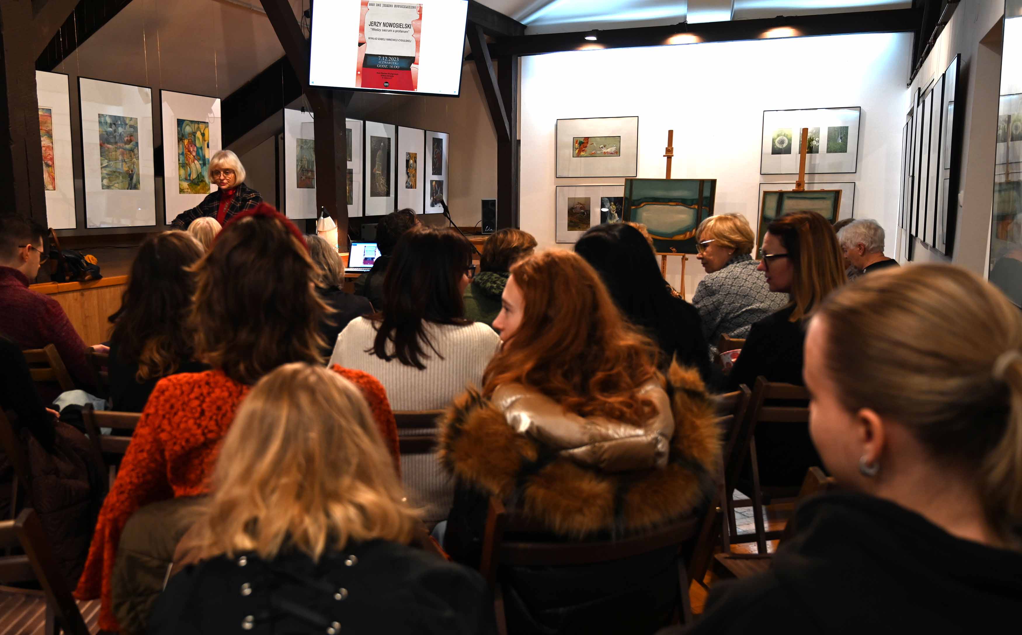 Dobiega końca rok 2023 dedykowany dwóm naszym wybitnym malarzom: Janowi Matejce i Jerzemu Nowosielskiemu. Była więc okazja, by twórczości tych artystów przyjrzeć się nieco bliżej. Szkolną tradycją stały się konkursy w formie elektronicznej, do których pytania przygotowywane są w oparciu o literaturę (na dany temat) zgromadzoną w bibliotece szkolnej. Konkurs na temat twórczości Jana Matejki odbył się 13 grudnia, a na temat Jerzego Nowosielskiego – jeszcze w ubiegłym roku szkolnym. Swoistą klamrą zamykającą ten rok był wykład otwarty Izabeli Winiewicz-Cybulskiej, nauczycielki historii sztuki, w BWA-Galerii Zamojskiej „Jerzy Nowosielski – między sacrum a profanum”, który odbył się 7 grudnia. To wyjątkowy, przedświąteczny czas, dlatego wśród prezentowanych obrazów nie mogło zabraknąć ikon z wizerunkiem św. Mikołaja czy ze sceną Bożego Narodzenia. Najważniejsze było jednak to, że wykładowi poświęconemu twórczości naszego wybitnego artysty, nazywanego twórcą ikony świeckiej, towarzyszyły dwa oryginalne dzieła mistrza – pejzaże znajdujące się w zbiorach zamojskiej Galerii. Klimat niepowtarzalny – to tak jakby duch artysty na tę jedną chwilę znalazł się pośród nas by przypomnieć słowa mistrza: „dzisiaj wiemy, że cała sztuka, i ta święta i ta świecka, pochodzi od bogów”. Fot. Janusz Zimon.