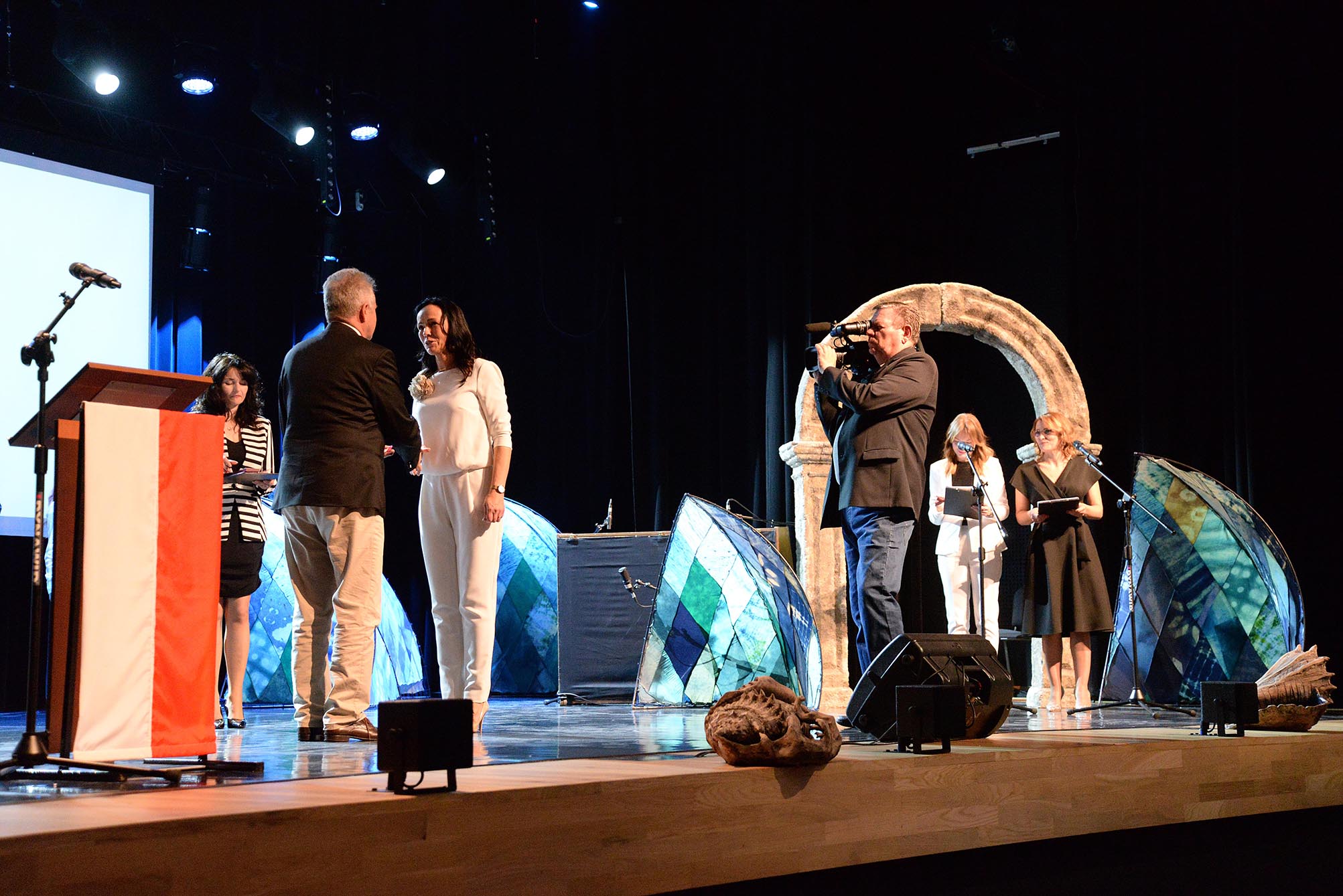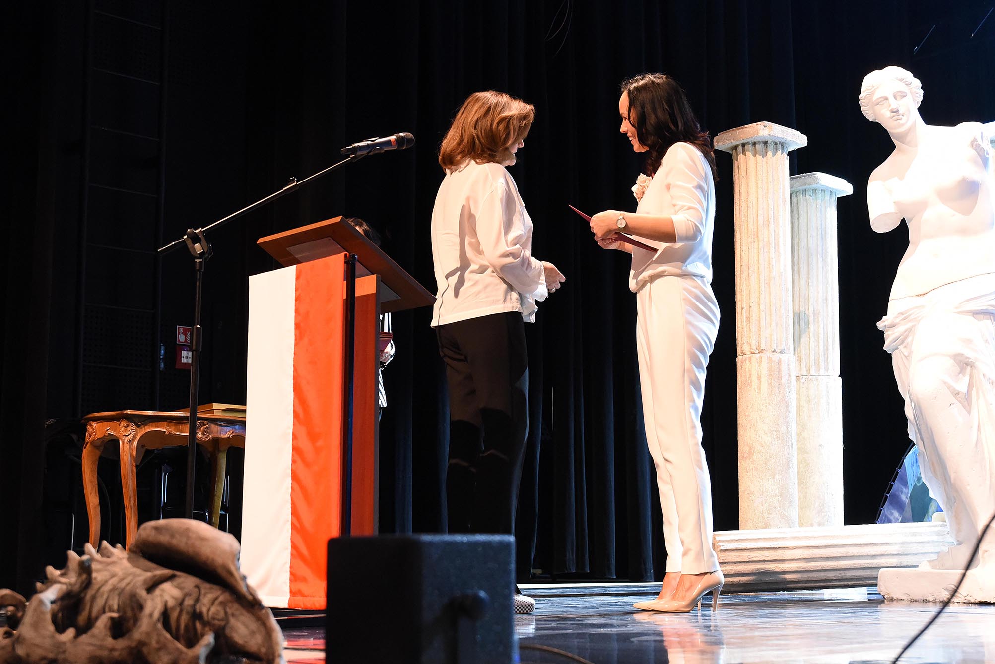 Obchody rozpoczęły się symbolicznym złożeniem kwiatów przy tablicy upamiętniającej założycielkę szkoły, Halinę Rogińską. Następnie w Kościele Franciszkanów odprawiona została uroczysta Msza Święta, inaugurująca ten doniosły dzień. Po niej przeszliśmy do Zamojskiego Domu Kultury, gdzie odbyła się Gala Jubileuszowa, rozpoczęta muzycznym występem absolwentów – Anny Mroczek i Łukasza Zwolana, wykonujących utwór „Lubię wracać tam, gdzie byłem”. Ten moment wprowadził nas w wyjątkowy nastrój całej uroczystości. Następnie Pani Dyrektor Marzena Tadeusz dokonała oficjalnego otwarcia jubileuszu, po czym mogliśmy obejrzeć wyjątkowy film o historii szkoły, stworzony przez nauczyciela fotografii Pawła Malczenkę, który, korzystając z nowoczesnych technologii, ożywił archiwalne zdjęcia z lat 50., 60., 70. i 80., przenosząc nas w atmosferę tamtych czasów. Po wzruszającym seansie nadszedł uroczysty moment przemówień oraz wręczenia nagród przez zaszczytne grono gości. Wiceminister Kultury i Dziedzictwa Narodowego, Pan Sławomir Rogowski, uhonorował Panią Dyrektor Marzenę Tadeusz Medalem za długoletnią służbę. Nagrody I stopnia za szczególny wkład w rozwój szkolnictwa artystycznego w Polsce wręczyła Pani Agnieszka Wainer, wizytator Centrum Edukacji Artystycznej w Warszawie. Otrzymały je Panie: Marzena Tadeusz, Małgorzata Godzisz oraz Dorota Jasek, natomiast nagrody II stopnia odebrali Panowie: Mateusz Kitka i Paweł Malczenko. Wiceprzewodniczący Sejmiku Województwa Lubelskiego, Pan Krzysztof Gałaszkiewicz, wręczył nagrodę za osiągnięcia w dziedzinie twórczości artystycznej Panu Bartłomiejowi Sęczawie, a Prezydent Miasta Zamość, Pan Rafał Zwolak, uhonorował nagrodami Panią Izabelę Winiewicz-Cybulską oraz Panią Katarzynę Manachiewicz. Z kolei Nagrodami Dyrektora Szkoły Pani Marzena Tadeusz wyróżniła Panią Anetę Majewską oraz Panów Tomasza Bełecha i Wojciecha Duklewskiego.