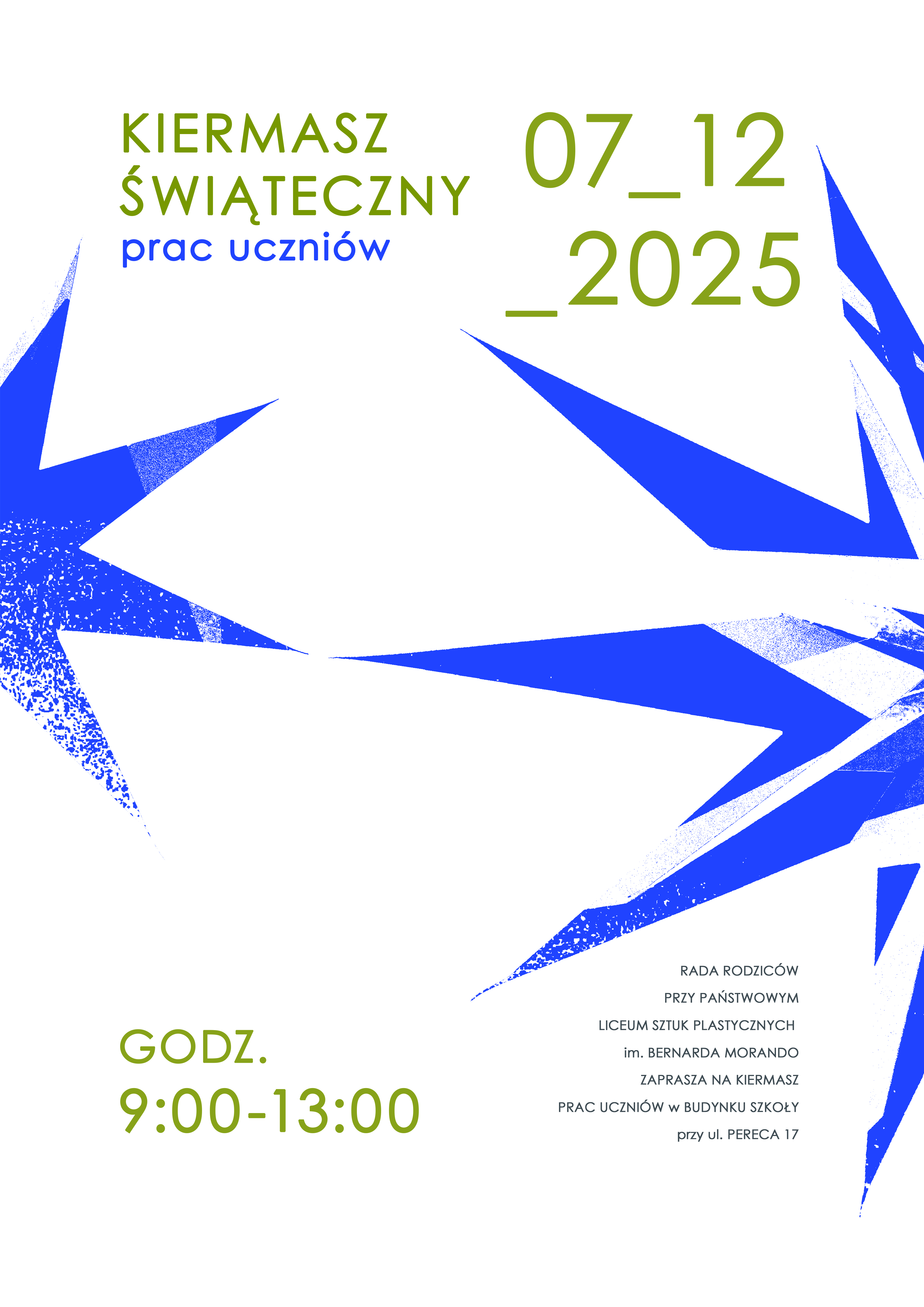 plakat, na białym tle niebieskie gwiazdy i napis kiermasz świąteczny