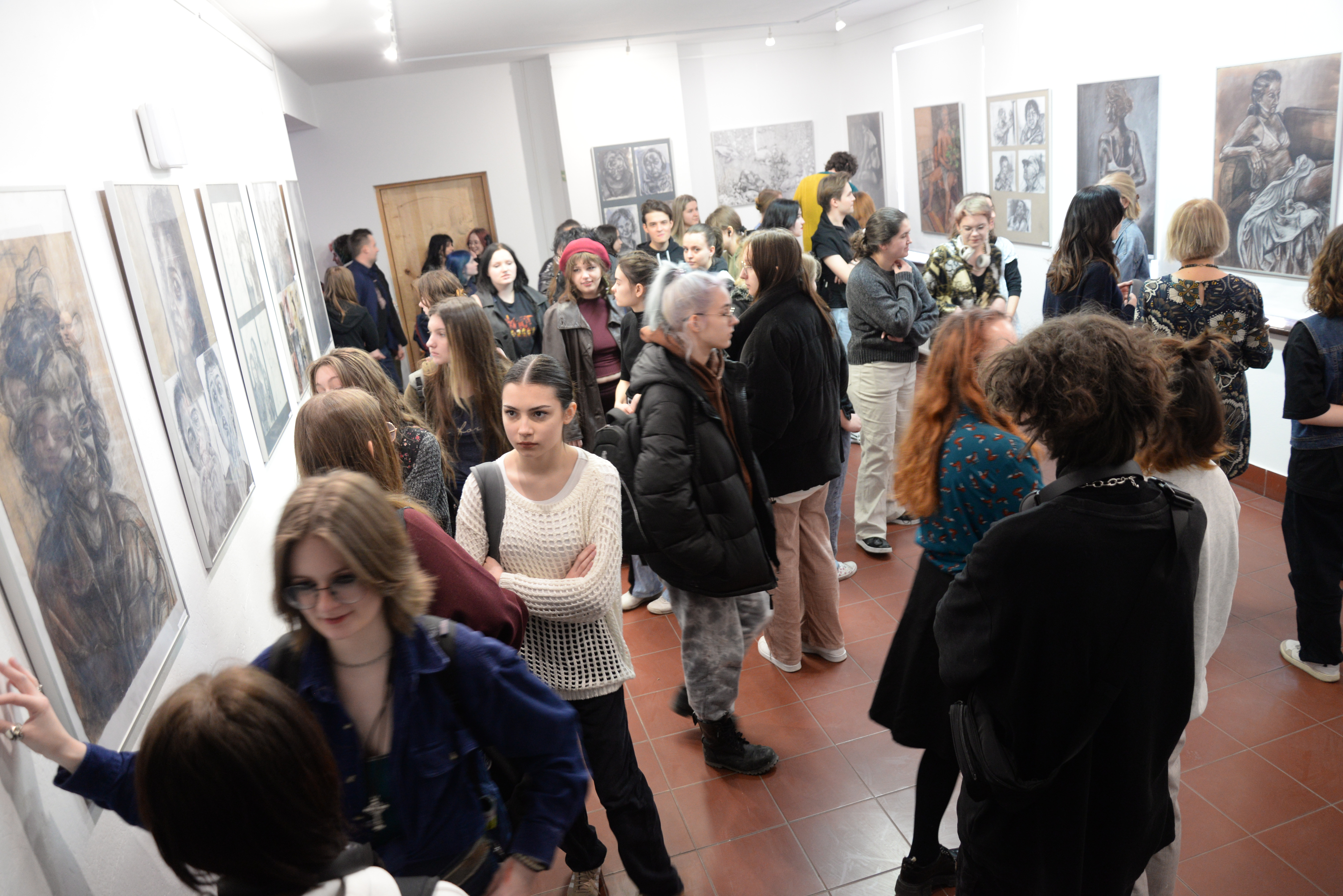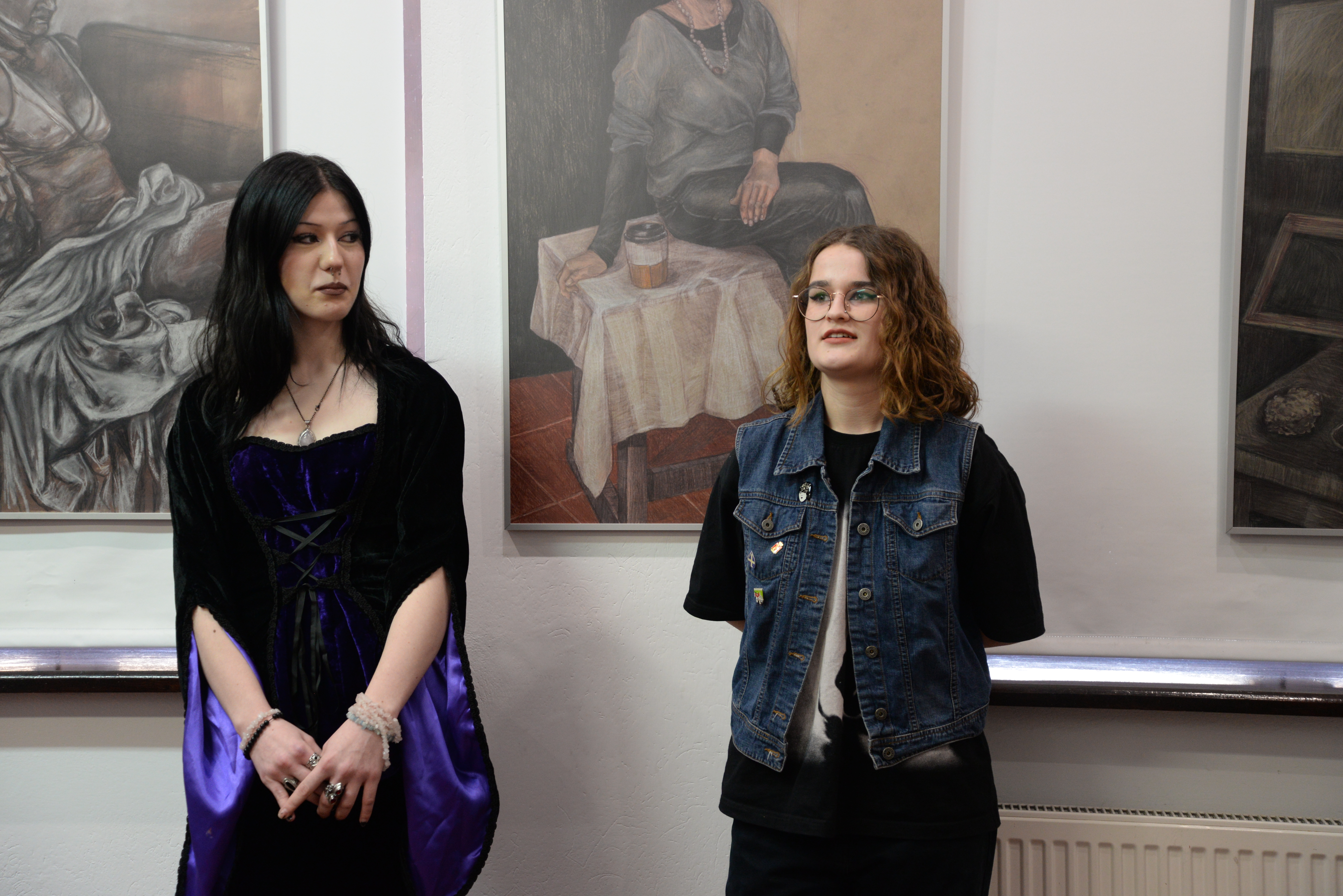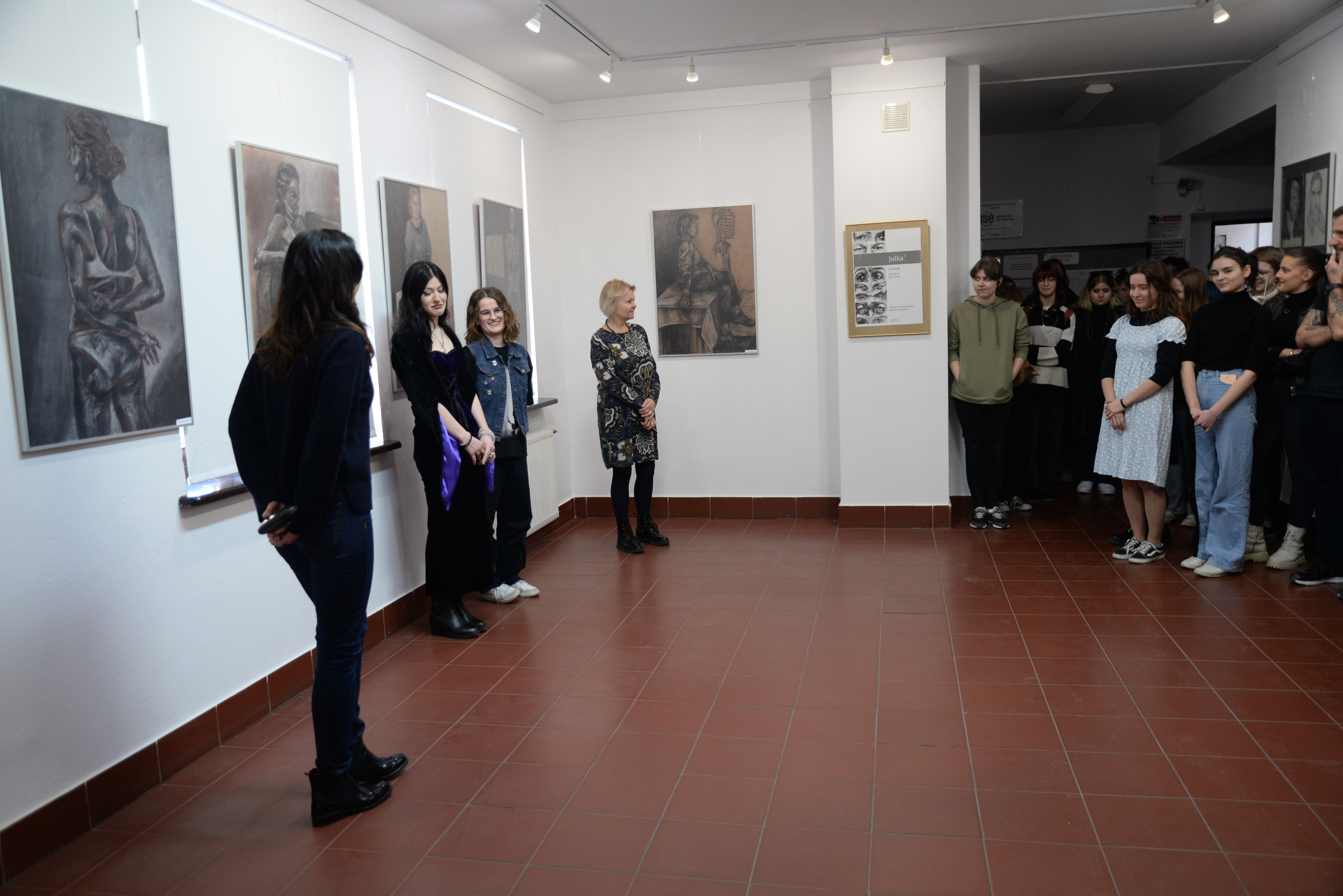 Wystawa ma miejsce w szkolnej Galerii Patio, rysunki Julek są przykładem wysokiego poziomu warsztatu, odwagi w eksperymentowaniu z narzędziem, formą rysunku. Rysunki Julki Ruckiej mocne, zdecydowane, kontrast światłocienia podkreśla rzeźbiarską formę anatomii ciekawie ujętych postaci kobiecych, a trafione, syntetyczne tła dopełniają kompozycji. Autorka prezentuje również portrety, mniejsze szkice postaci, pełne ekspresji rysowane kredką, grafitem, piórkiem na barwionych papierach plamą herbaty, bejcy czy kawy. Prace Julii Mich są kontrastem w delikatnym, skrupulatnym, a niekiedy mocnym ujęciu formy. Dopracowane studium postaci brata rysowane kolorowymi kredkami z dokładnie, wnikliwie przedstawioną anatomią, postać nauczycielki, rysunki portretów ulubionych postaci, uchwycony charakter, podobieństwo. Na wystawie zachwyca kompozycja z rybami na dużym formacie, wykonana cienkopisem z wnikliwie przedstawionymi detalami natury podwodnego świata czy klimatyczna martwa natura ze szkieletem. Gratulujemy Julkom bardzo udanej wystawy na wysokim poziomie artystycznym, życzymy wielu sukcesów twórczych.
