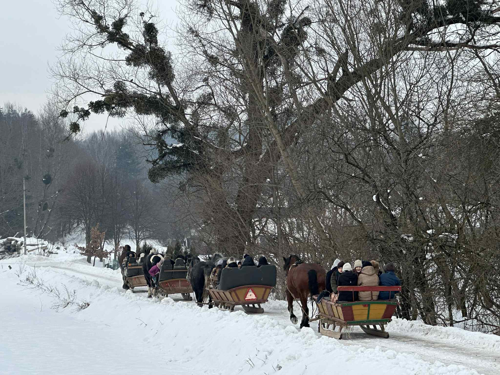 Wyjazd odbył się w godzinach przedpołudniowych i przebiegał zgodnie z ustalonym harmonogramem. Głównym punktem programu był kulig, obejmujący około godzinny przejazd saniami po trasie w zimowej scenerii. Po jego zakończeniu uczestnicy skorzystali z ogniska z poczęstunkiem, a następnie wzięli udział w zaplanowanych aktywnościach rekreacyjnych na świeżym powietrzu, w tym zjazdach na workach.
