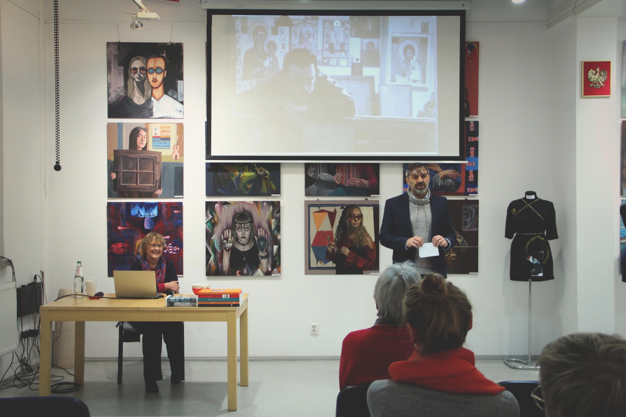 Sylwetkę tego niezwykłego artysty przybliżyła nam dzisiaj Pani Krystyna Czerni – historyk sztuki, doktor nauk humanistycznych oraz przede wszystkim autorka licznych publikacji związanych z Jerzym Nowosielskim. Podczas prelekcji mogliśmy prześledzić nie tylko losy artysty, ale również poznać jego inspiracje i liczne przykłady działań twórczych, których część nadal wymaga odkrycia i skatalogowania. Wykład został wzbogacony fotografiami pochodzącymi min. ze zbiorów pani Czerni.
