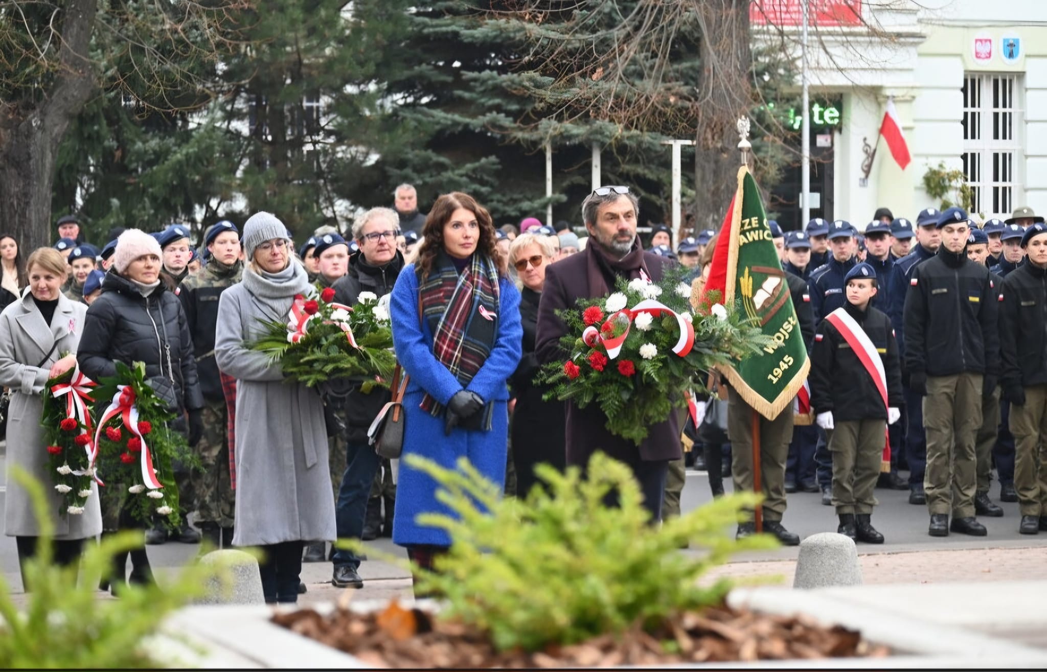 Symboliczną wiązankę kwiatów, przed pomnikiem marszałka Józefa Piłsudskiego, złożyli Dyrektor szkoły pan Witold Rajczak i wicedyrektorka Agnieszka Donder