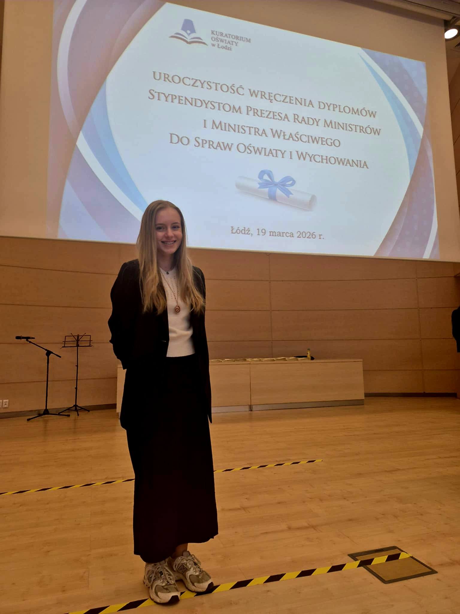 Miło nam poinformować, że 19 marca 2026 r. w auli Wydziału Prawa i Administracji Uniwersytetu Łódzkiego odbyło się uroczyste wręczenie dyplomów Stypendystom Prezesa Rady Ministrów. Laureatką tegorocznego stypendium została uczennica klasy IV Gabriela Nosal, której serdecznie gratulujemy i życzymy dalszych sukcesów!