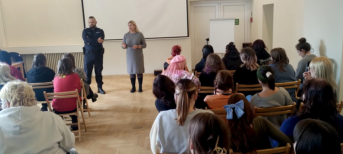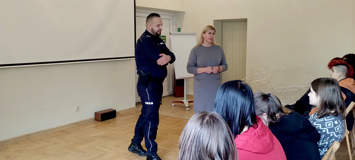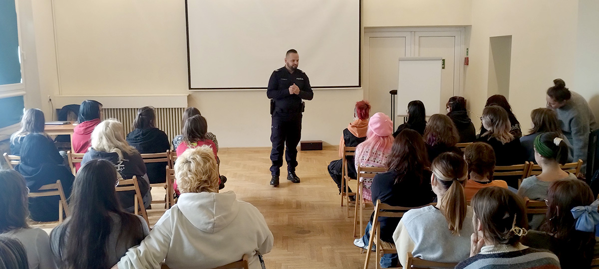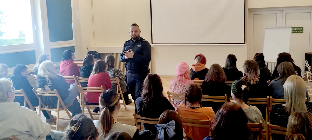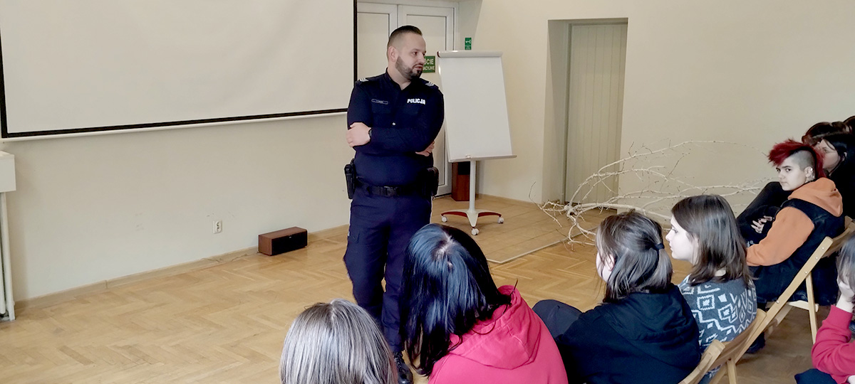 W środę 2 stycznia 2024 roku odbyło się w naszej szkole spotkanie z funkcjonariuszem Policji z Zespołu ds. Profilaktyki Społecznej i Nieletnich Komendy Miejskiej Policji w Zielonej Górze, który opowiadał o różnych aspektach bezpieczeństwa w sieci. Nasz gość uświadamiał uczniów jak łatwo paść ofiarą cyberprzemocy oraz w jaki, często bezmyślny sposób, wyrządzamy komuś krzywdę, publikując na temat tej osoby ośmieszające i kompromitujące informacje, zdjęcia oraz filmy. Policjant opowiadał również o konsekwencjach takiego postępowania zarówno dla młodzieży oraz ich prawnych opiekunów. Celem spotkania było przede wszystkim wzmocnienie u młodzieży świadomości i odpowiedzialności za własne działania w sieci oraz uzmysłowienie w jaki sposób można zapobiegać przemocy przy użyciu telefonu komórkowego i Internetu.