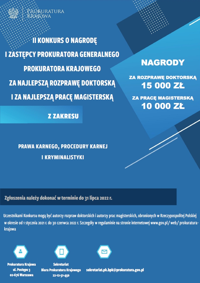 2022.06.09 - Informacja o konkursie o nagrodę I Zastępcy Prokuratora Generalnego - Prokuratora Krajowego za najlepszą rozprawę doktorską i za najlepszą pracę magisterską z zakresu prawa karnego, procedury karnej i kryminalistyki