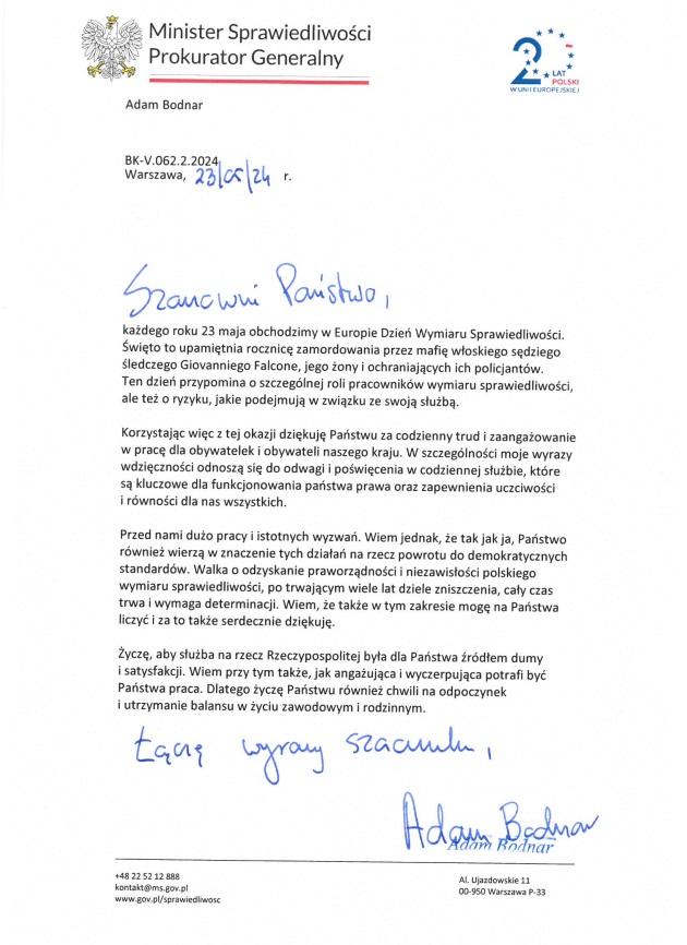 Przed nami dużo pracy i istotnych wyzwań. Wiem jednak, że tak jak ja, Państwo również wierzą w znaczenie tych działań na rzecz powrotu do demokratycznych standardów. Walka o odzyskanie praworządności i niezawisłości polskiego wymiaru sprawiedliwości, po trwającym wiele lat dziele zniszczenia, cały czas trwa i wymaga determinacji. Wiem, że także w tym zakresie mogę na Państwa liczyć i za to także serdecznie dziękuję.
