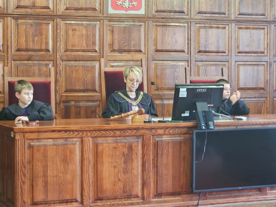 Symulacja rozprawy sądowej z udziałem dzieci ze Szkoły Podstawowej im. Ludzi Morza w Mścicach