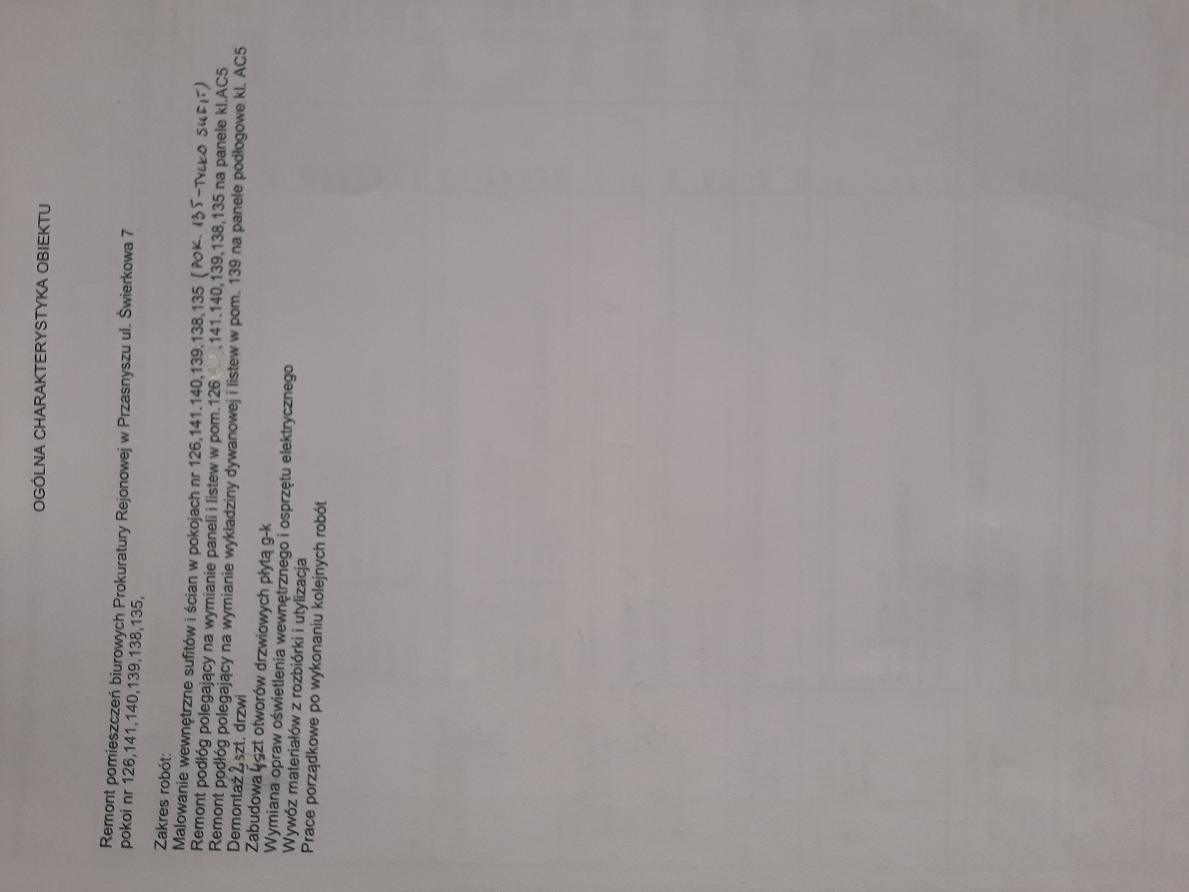 Prokuratura Okręgowa w Ostrołęce zaprasza do złożenia oferty cenowej na remont 6 pomieszczeń biurowych w Prokuraturze Rejonowej w Przasnyszu, ul. Świerkowa 7, 06-300 Przasnysz.