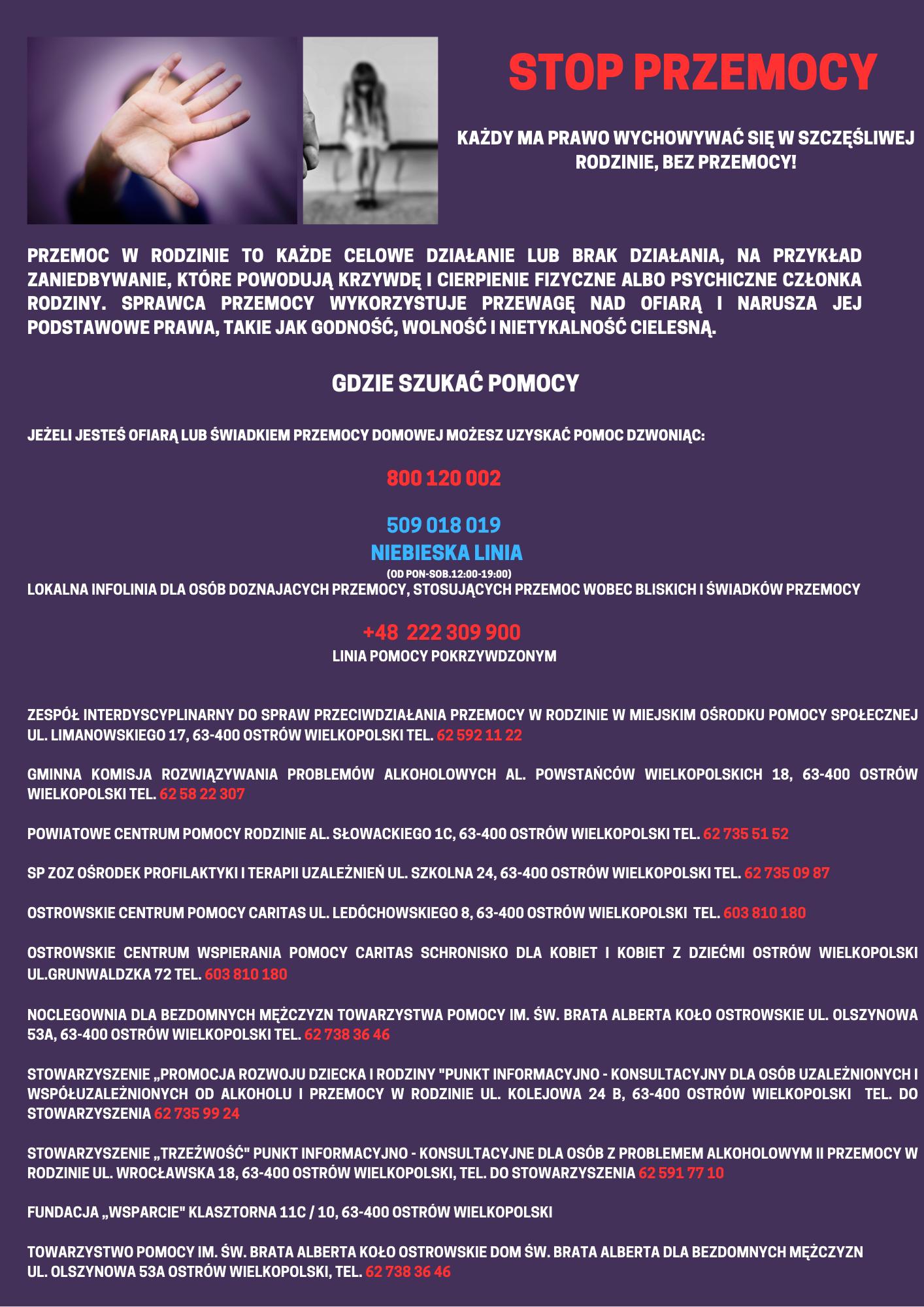 - Gminny Ośrodek Pomocy Społecznej w Ostrowie Wielkopolskim, tel. 062 7362846