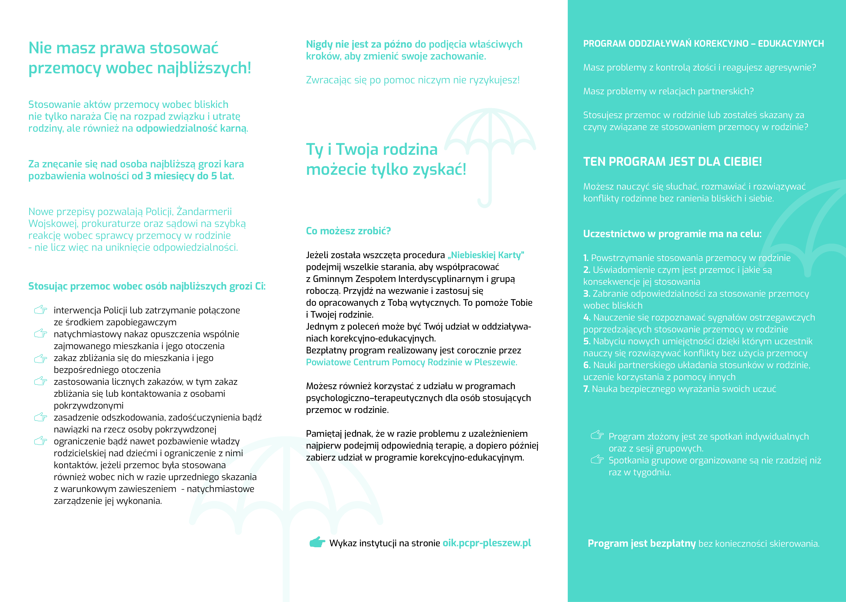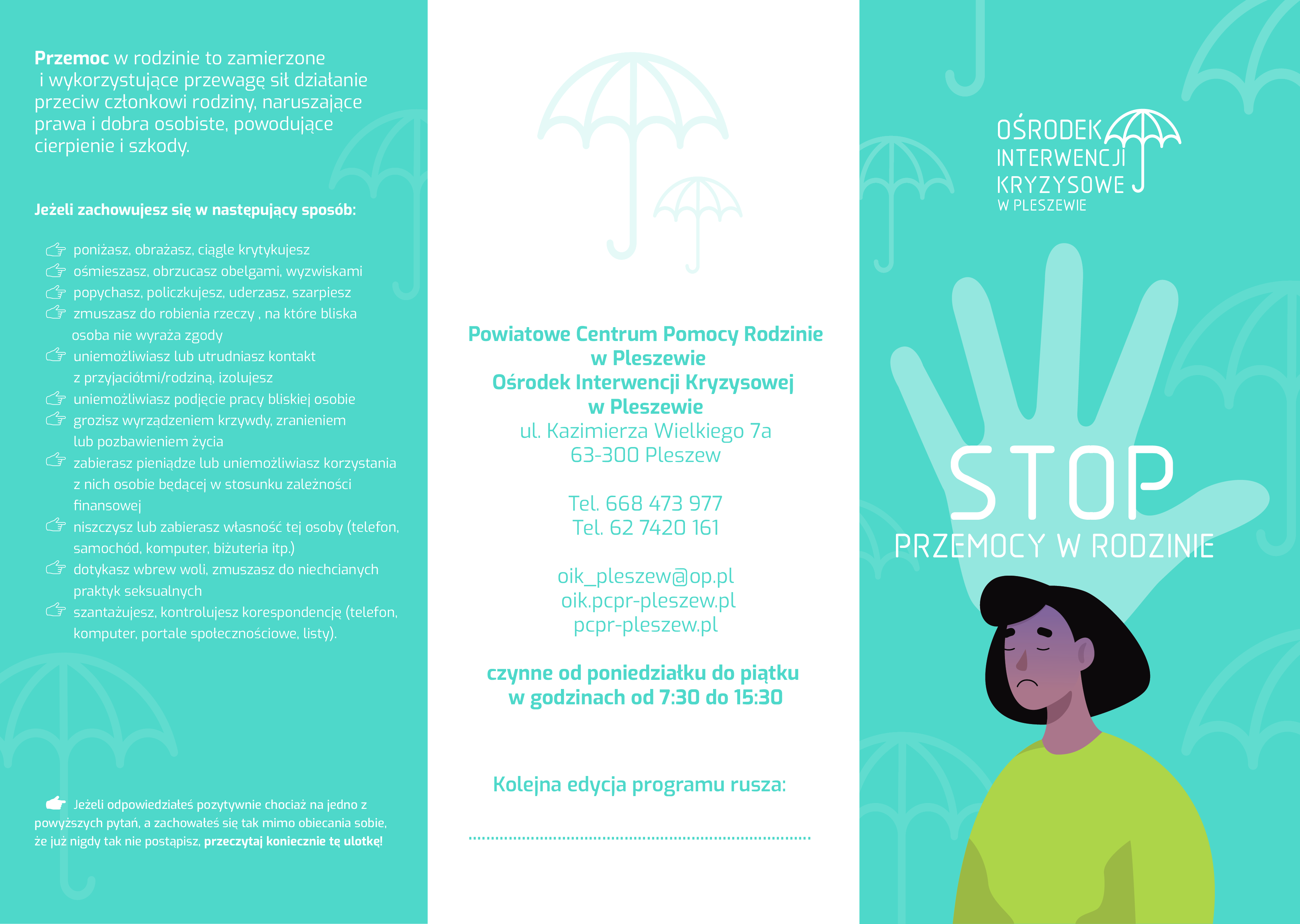 Ośrodek Interwencji Kryzysowej w Pleszewie, ul. Osiedlowa 1, 63-300 Pleszew, tel. 62 74 21 184, całodobowy: 668 473 977, oik_pleszew@op.pl, www.pcpr-pleszew.info