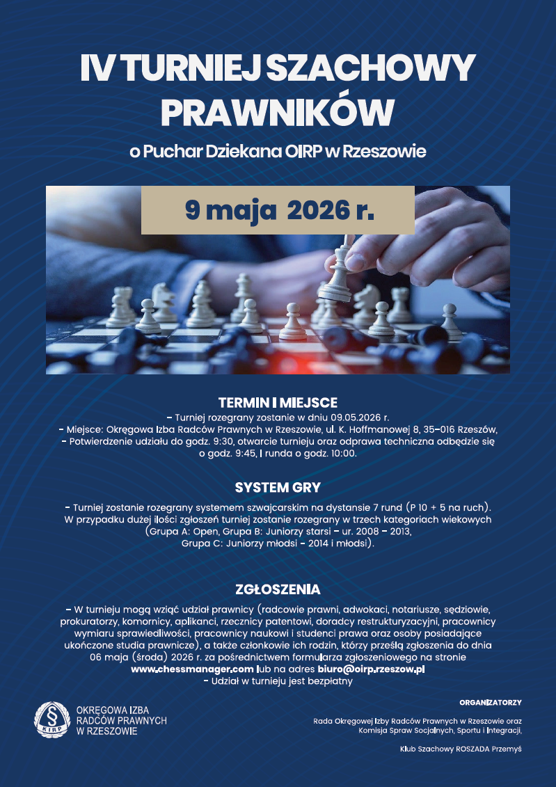 IV Turniej Szachowy Prawników o Puchar Dziekana Okręgowej Izby Radców Prawnych w Rzeszowie 14.04.2026 Materiały Informacja Informacja_-_Turniej_szachowy.pdf 3.77MB