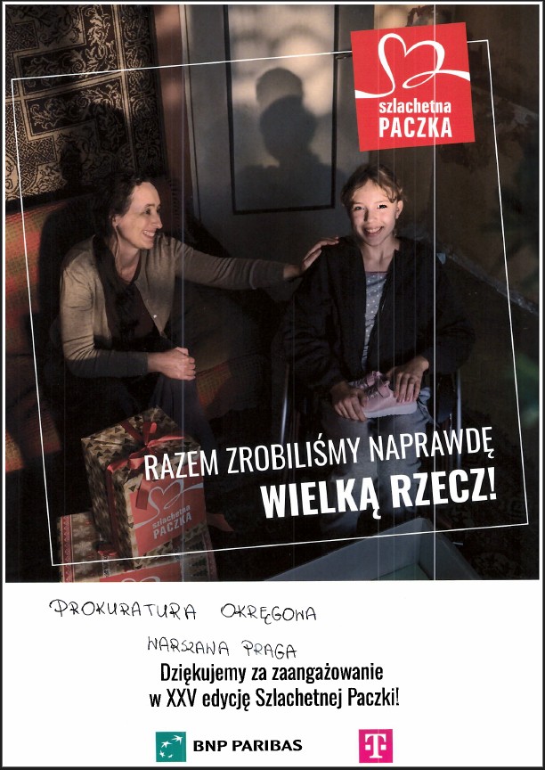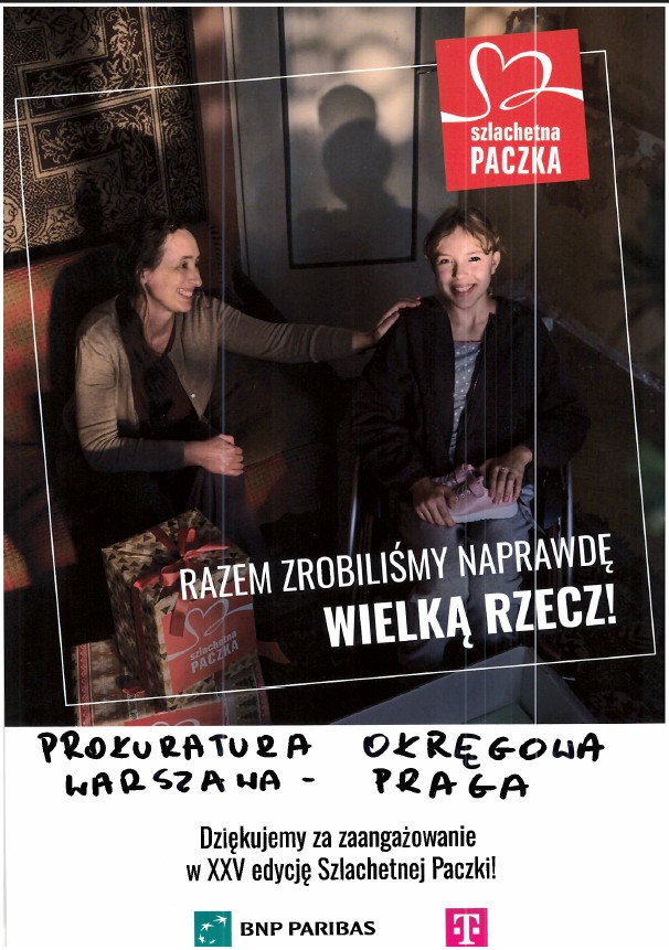 Z radością informujemy, że prokuratorzy i pracownicy Prokuratury Okręgowej Warszawa-Praga w Warszawie i wszystkich prokuratur rejonowych wzięli udział w akcji „Szlachetna Paczka”. Dzięki przeprowadzonej zbiórce pomogliśmy dwóm samotnym osobom oraz jednej rodzinie w potrzebie.