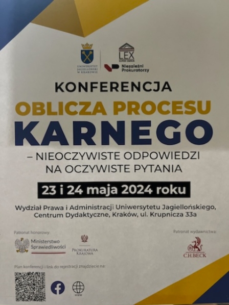 Konferencja naukowa pt. „Oblicza Procesu Karnego – nieoczywiste odpowiedzi na oczywiste pytania” Kraków 23-24.05.2024 r.