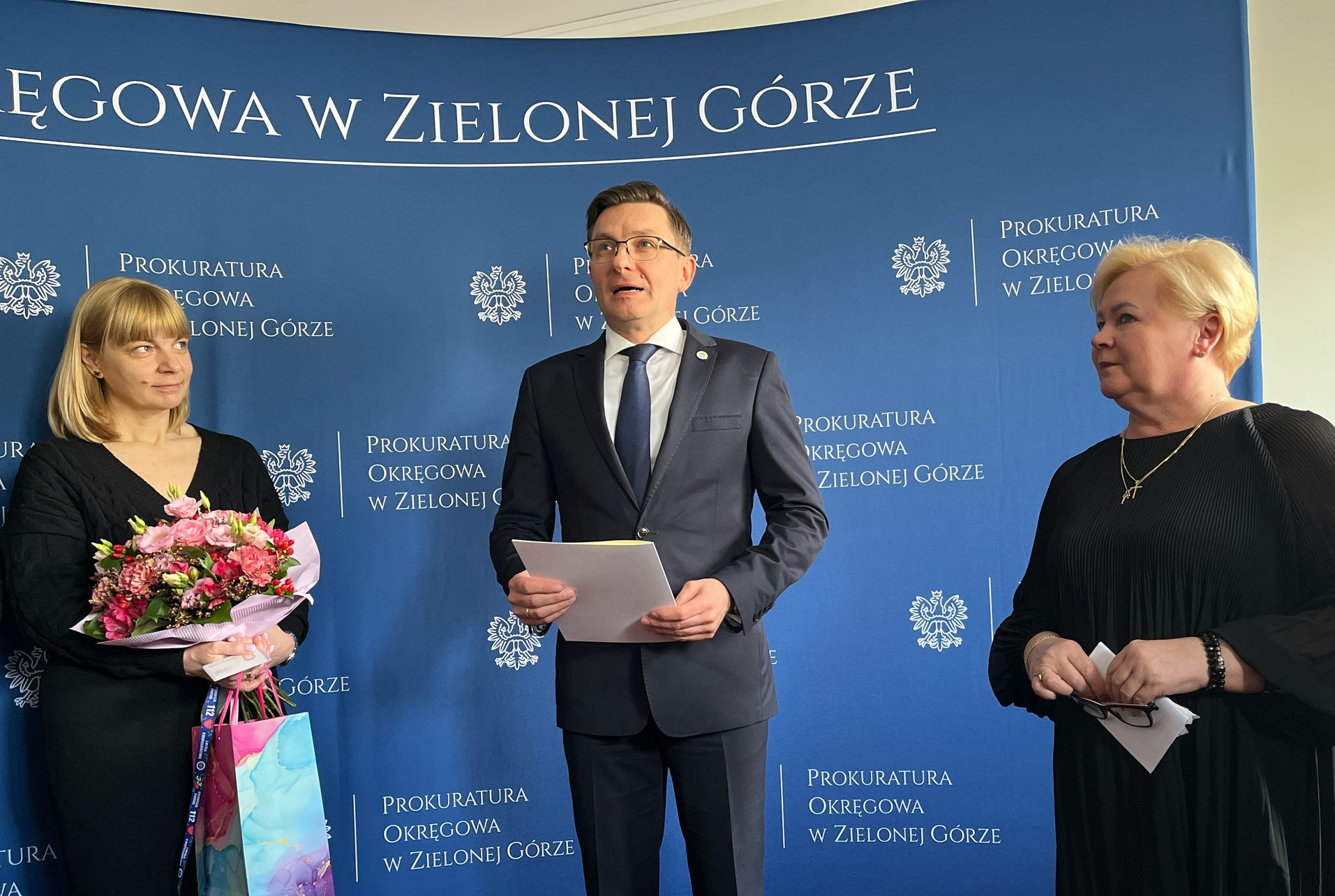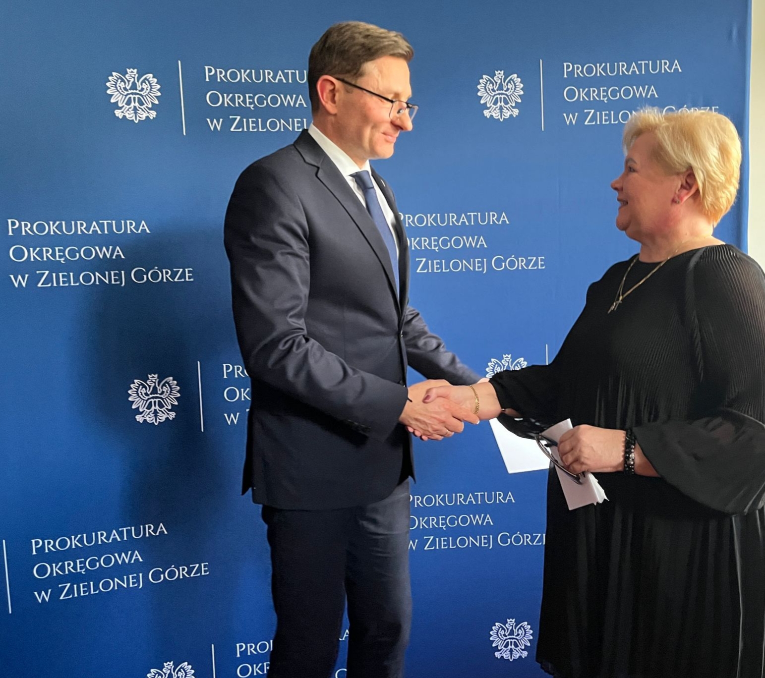 W dniu 25.03.2025 r. r. w imieniu kierownictwa Prokuratury Okręgowej w Zielonej Górze oraz współpracowników Prokurator Okręgowy dr Robert Kmieciak złożył Pani Izabelli Machcińskiej wyrazy uznania i podziękowania za lata profesjonalnej i skrupulatnej pracy na bardzo istotnym dla pracowników prokuratury i ich wynagrodzeń odcinku - specjalisty w Dziale Płac Prokuratury Okręgowej w Zielonej Górze.