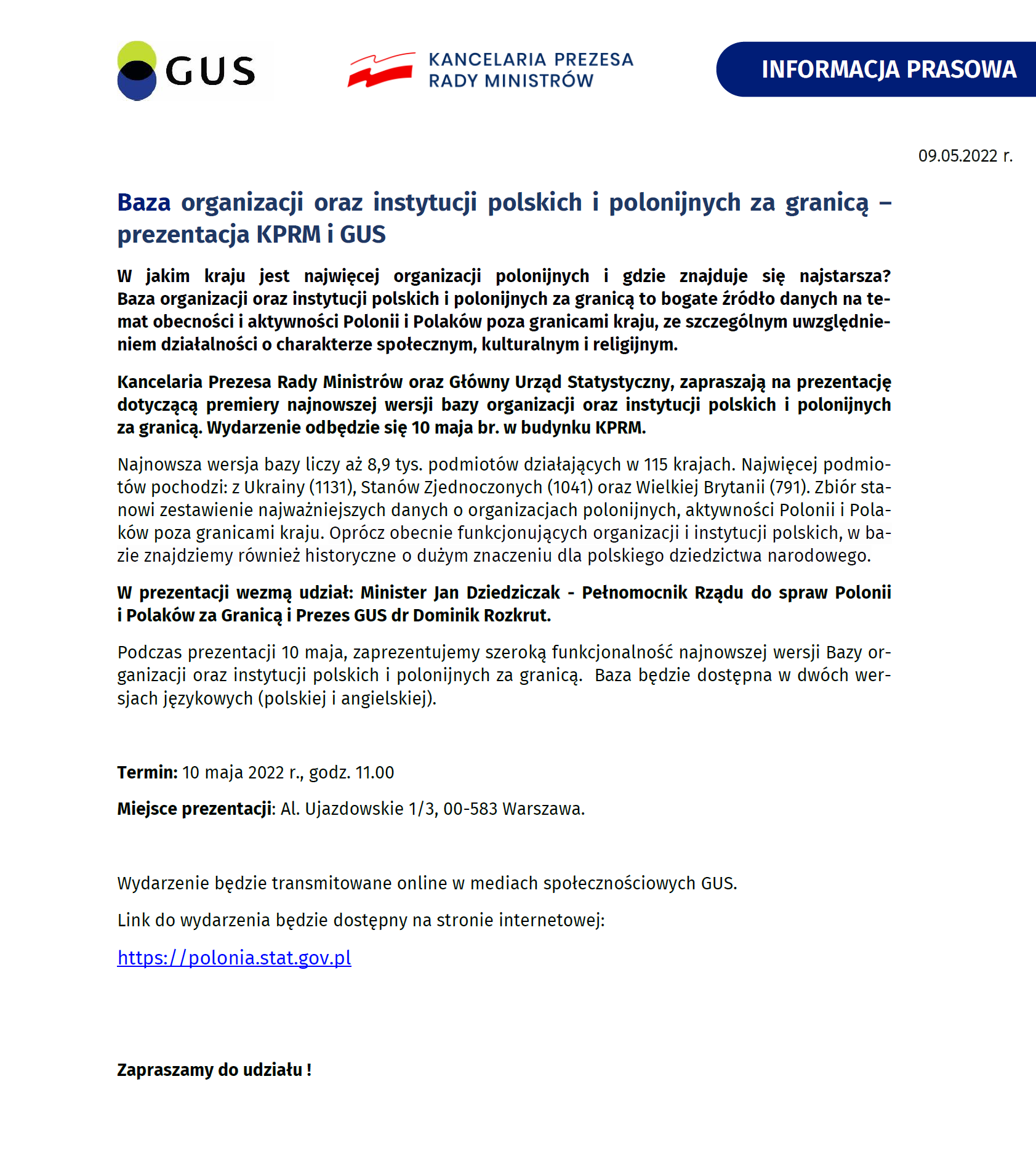 Kancelaria Prezesa Rady Ministrów oraz Główny Urząd Statystyczny, zapraszają na prezentację dotyczącą premiery najnowszej wersji bazy organizacji oraz instytucji polskich i polonijnych za granicą. Wydarzenie odbędzie się 10 maja br. w budynku KPRM.