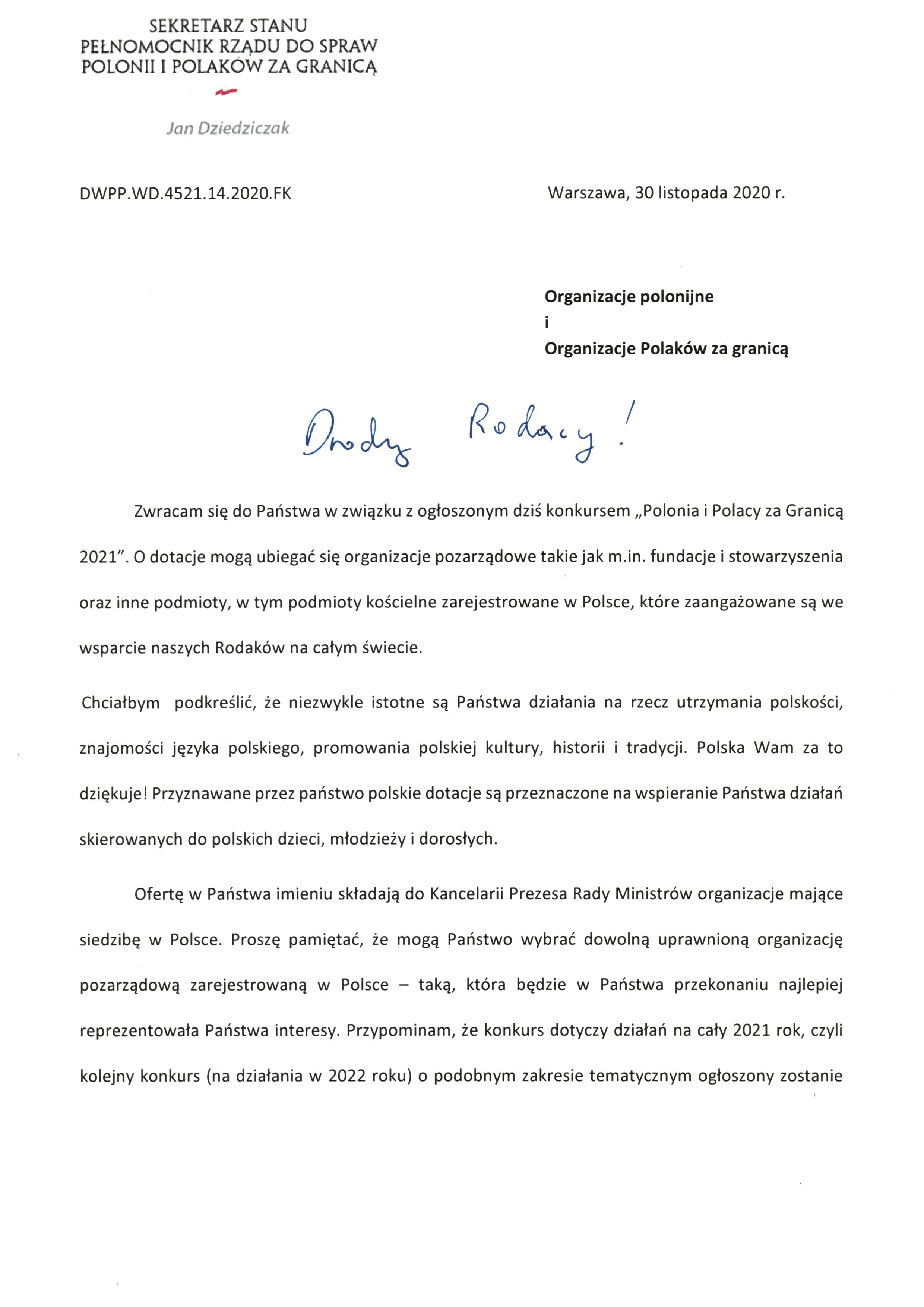 Zwracam się do Państwa w związku z ogłoszonym dziś konkursem „Polonia i Polacy za Granicą 2021”. O dotacje mogą ubiegać się organizacje pozarządowe takie jak m.in. fundacje i stowarzyszenia oraz inne podmioty, w tym podmioty kościelne zarejestrowane w Polsce, które zaangażowane są we wsparcie naszych Rodaków na całym świecie.