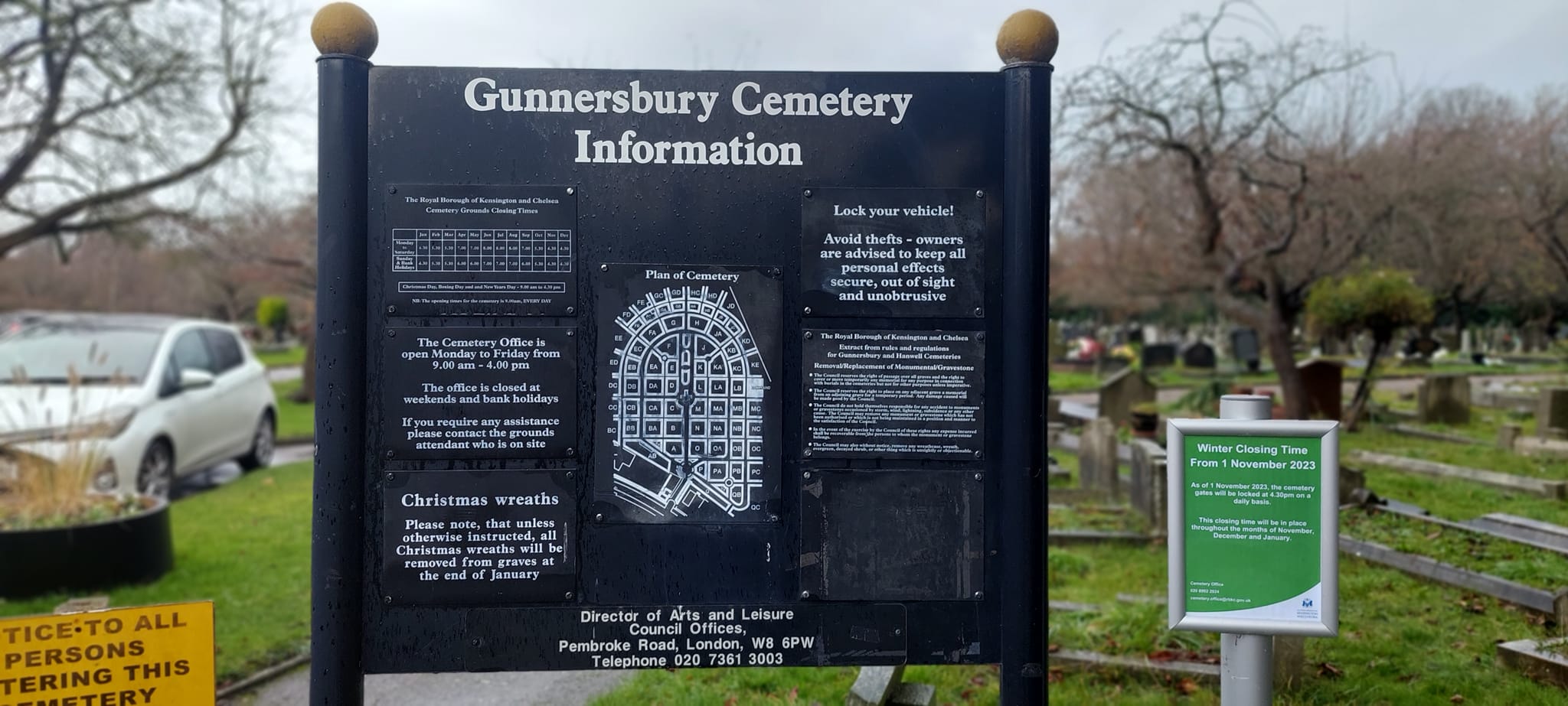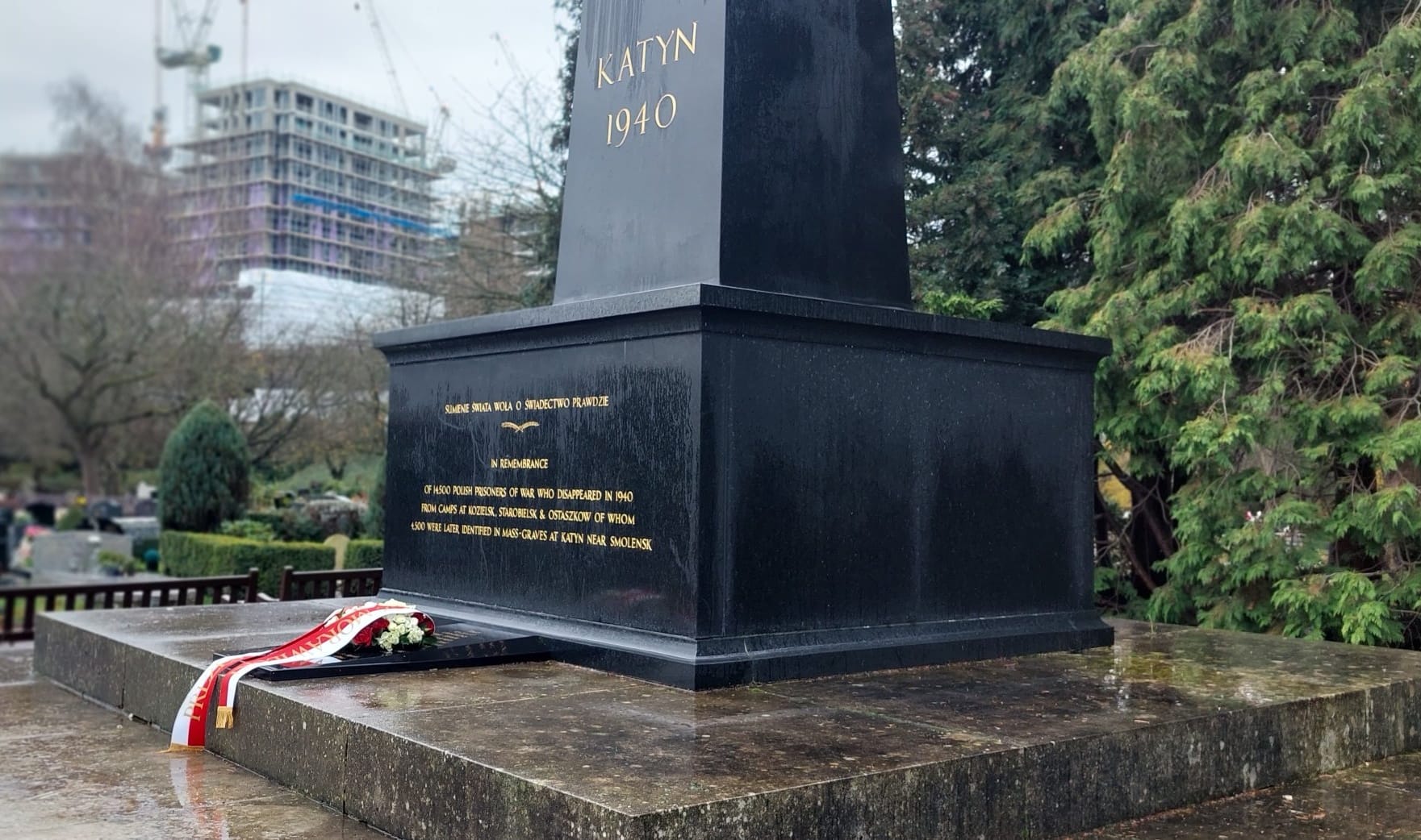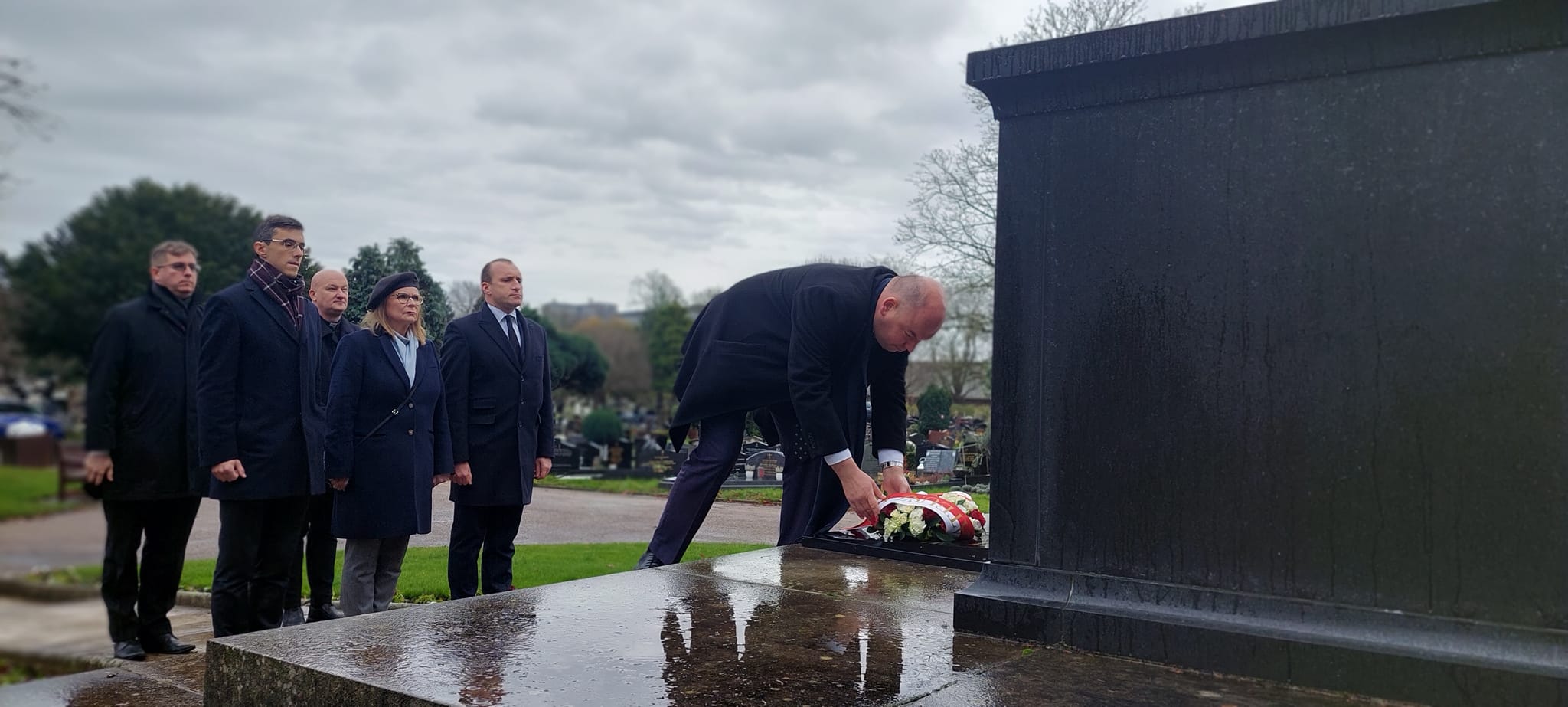 Pierwszym punktem wizyty polskiej delegacji rządowej w Wielkiej Brytanii, w składzie: Minister Jan Dziedziczak Pełnomocnik Rządu ds. Polonii i Polaków za Granicą, Wojciech Labuda Pełnomocnik ds. ochrony miejsc pamięci, Małgorzata Gosiewska Wiceprzewodnicząca Sejmowej Komisji Łączności z Polakami za Granicą, oraz przedstawiciele rodzin zmarłych, było złożenie wieńców pod Pomnikiem Katyńskim na Cmentarzu Gunnersbury. Jest to pierwszy w Europie Zachodniej pomnik upamiętniający polskich jeńców wojennych zamordowanych wiosną 1940 przez Sowietów. Monument został odsłonięty 18 września 1976 r. Na pomniku został zawieszony symbolicznie Krzyż Orderu Virtuti Militari (nr 14384), którym Prezydent RP na Uchodźstwie w Londynie Stanisław Ostrowski dekretem z dnia 11 listopada 1976 odznaczył zbiorowo żołnierzy polskich zgładzonych w Katyniu i innych nieznanych miejscach kaźni, dla upamiętnienia ofiary ich życia, w imię Niepodległości Polski.