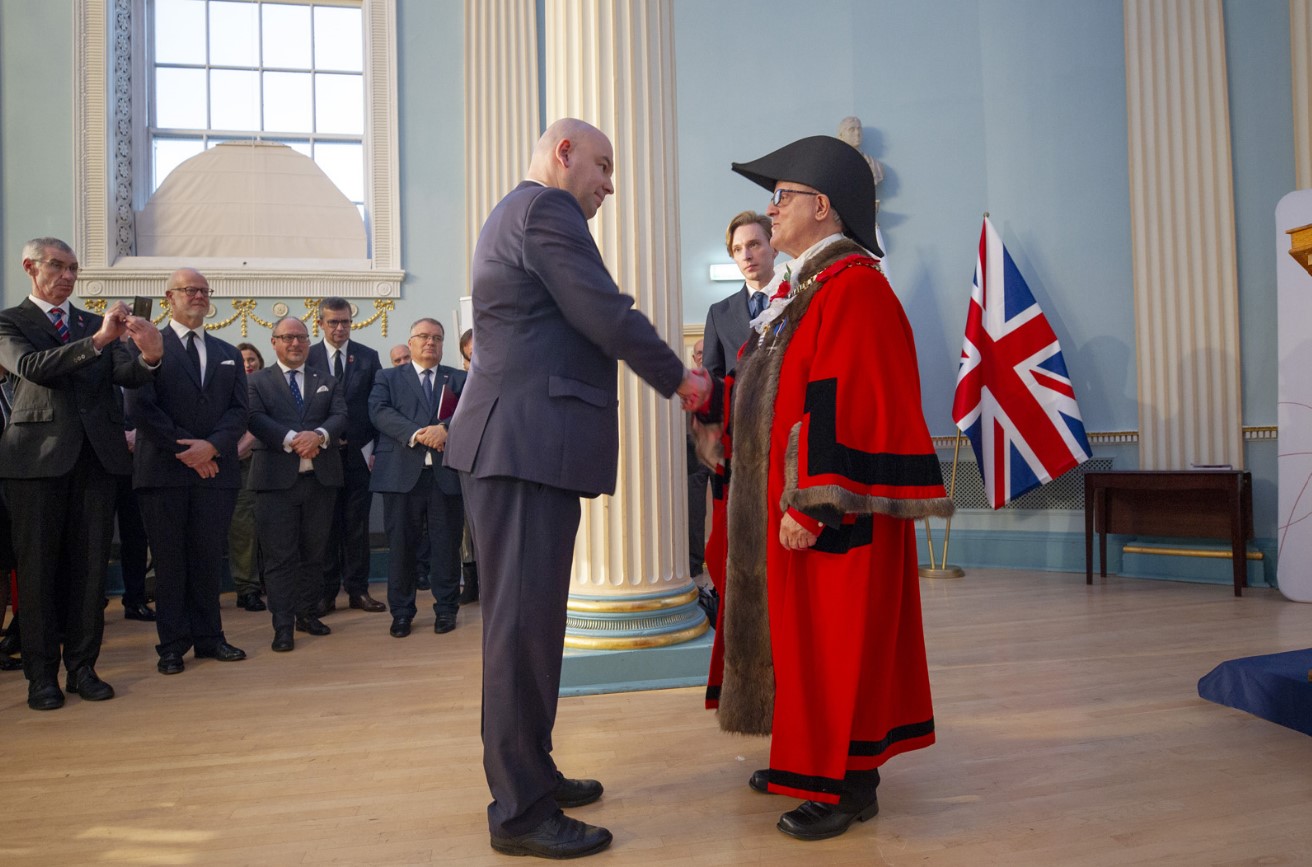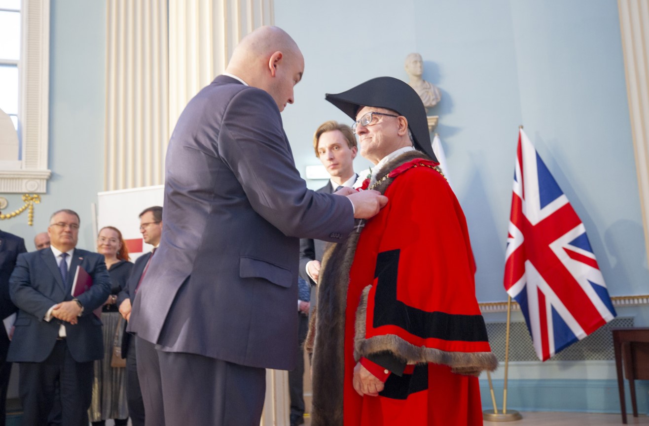 Minister Jan Dziedziczak, Pełnomocnik Rządu do spraw Polonii i Polaków za Granicą wręczył odznaczenie "Opiekun Miejsc Pamięci Narodowej" Burmistrzowi Newark za jego współpracę z Rządem RP w zakresie ochrony miejsca spoczynku Prezydentów w Newark on Trent.