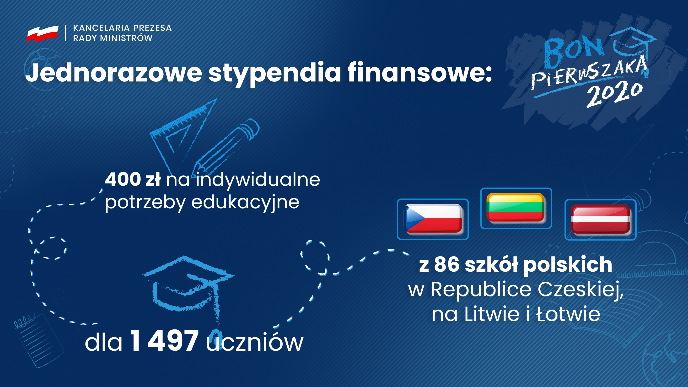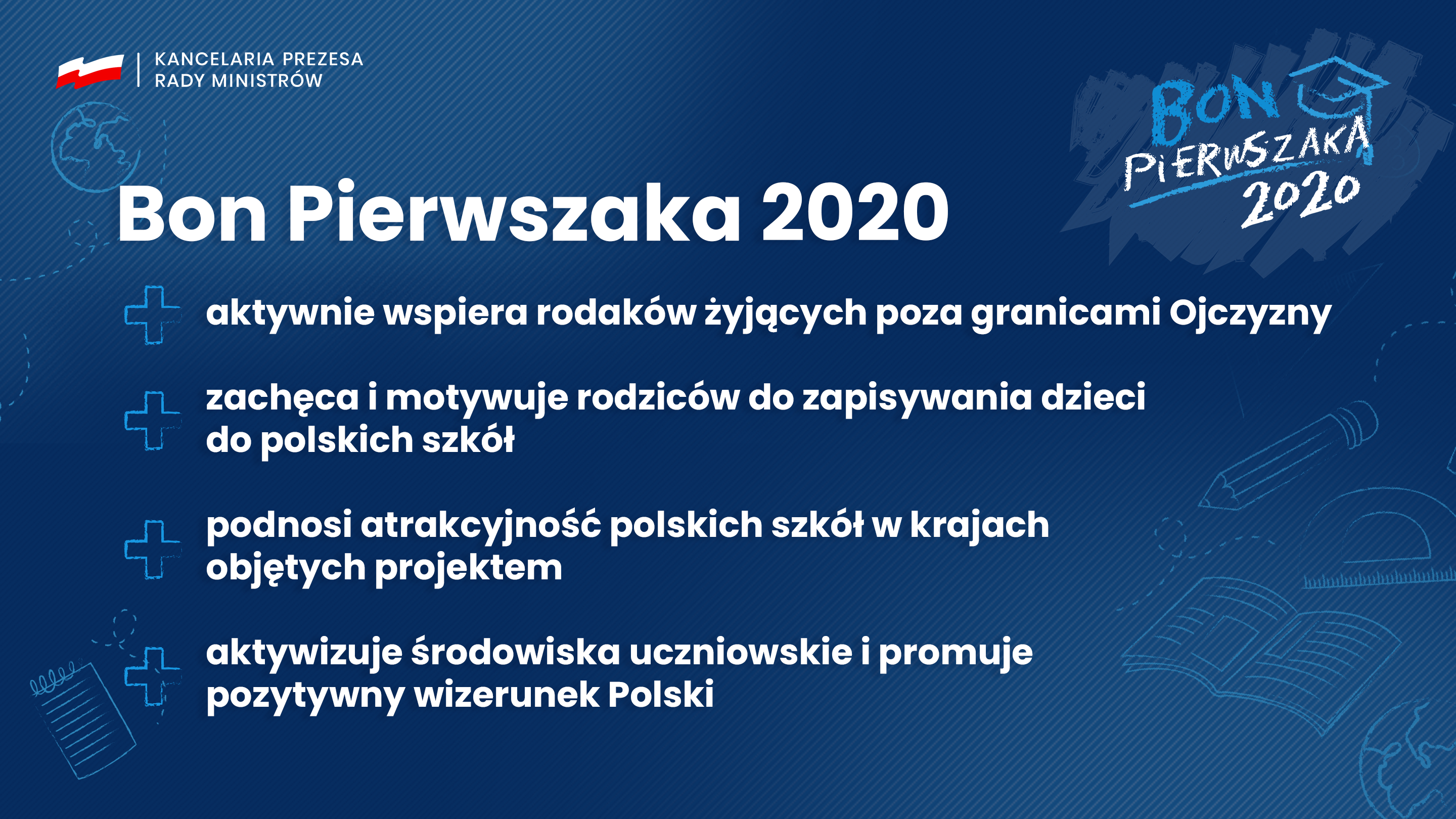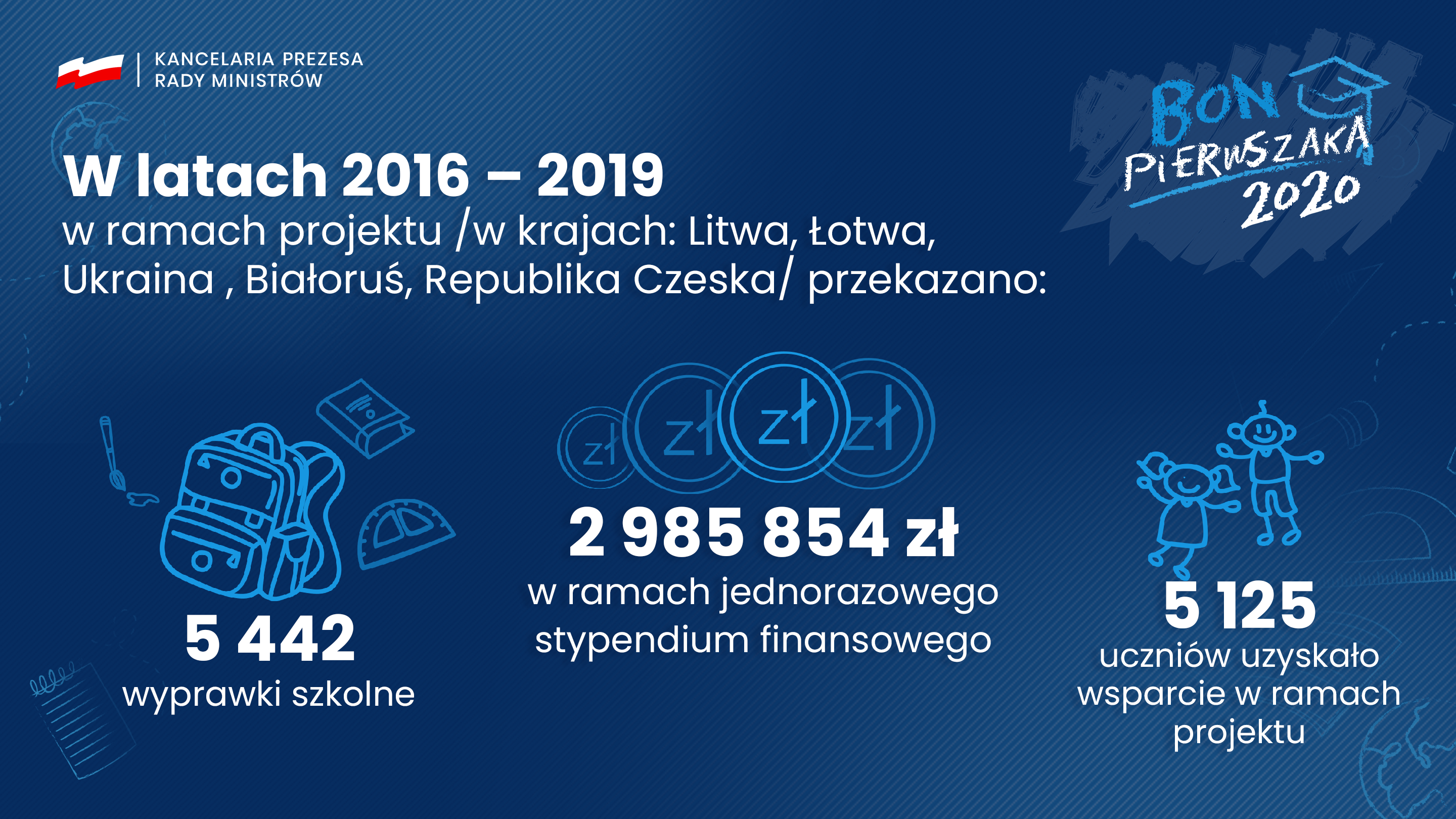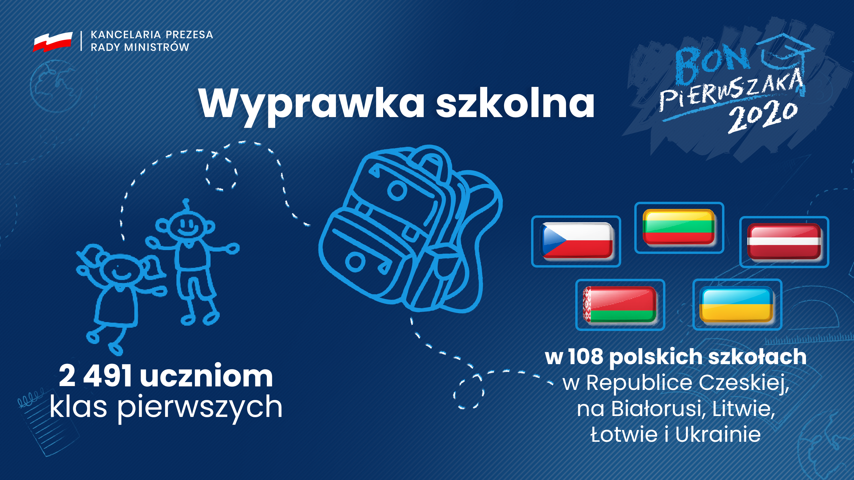 „Bon Pierwszaka” to międzynarodowy projekt Kancelarii Prezesa Rady Ministrów realizowany od 2016 r. Dzięki wsparciu rządu polscy pierwszoklasiści z Białorusi, Litwy, Łotwy, Ukrainy i Czech otrzymują wyprawki szkolne. Całkowity koszt dofinansowania projektu w 2020 r. to blisko 1,5 mln zł. W latach 2016-2019 w ramach projektu przekazano ponad 5,6 tys. wyprawek szkolnych (plecak z wyposażeniem), a ponad 5 tys. uczniów uzyskało wsparcie w formie jednorazowego stypendium finansowego na łączną kwotę niemal 3 mln zł.