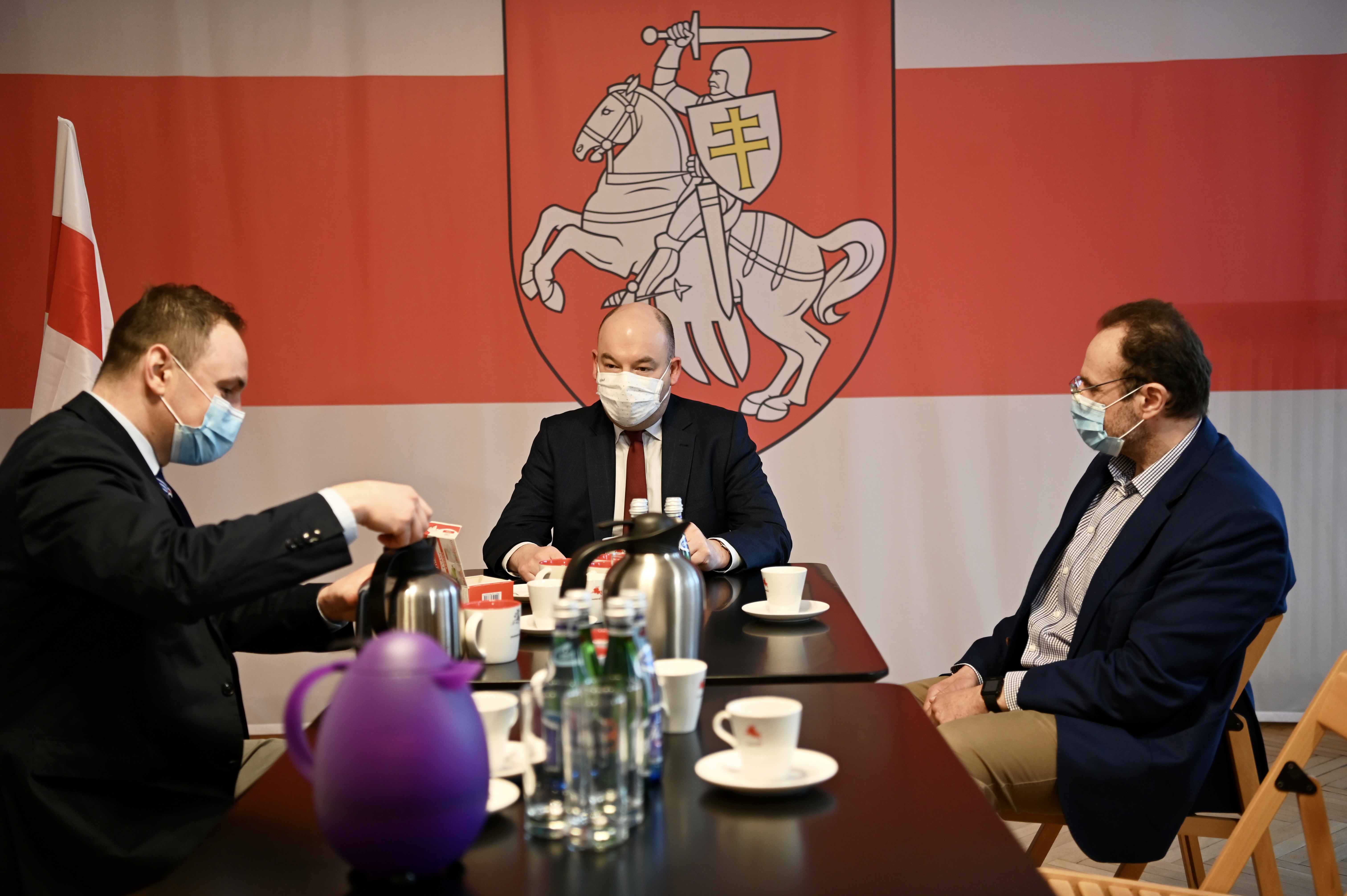 Minister Jan Dziedziczak odwiedził siedzibę Fundacji Białoruski Dom na Saskiej Kępie w Warszawie, gdzie spotkał się z prezesem fundacji, Alesiem Zarembiukiem oraz Rafałem Dzięciołowskim, prezesem Fundacji Solidarności Międzynarodowej.