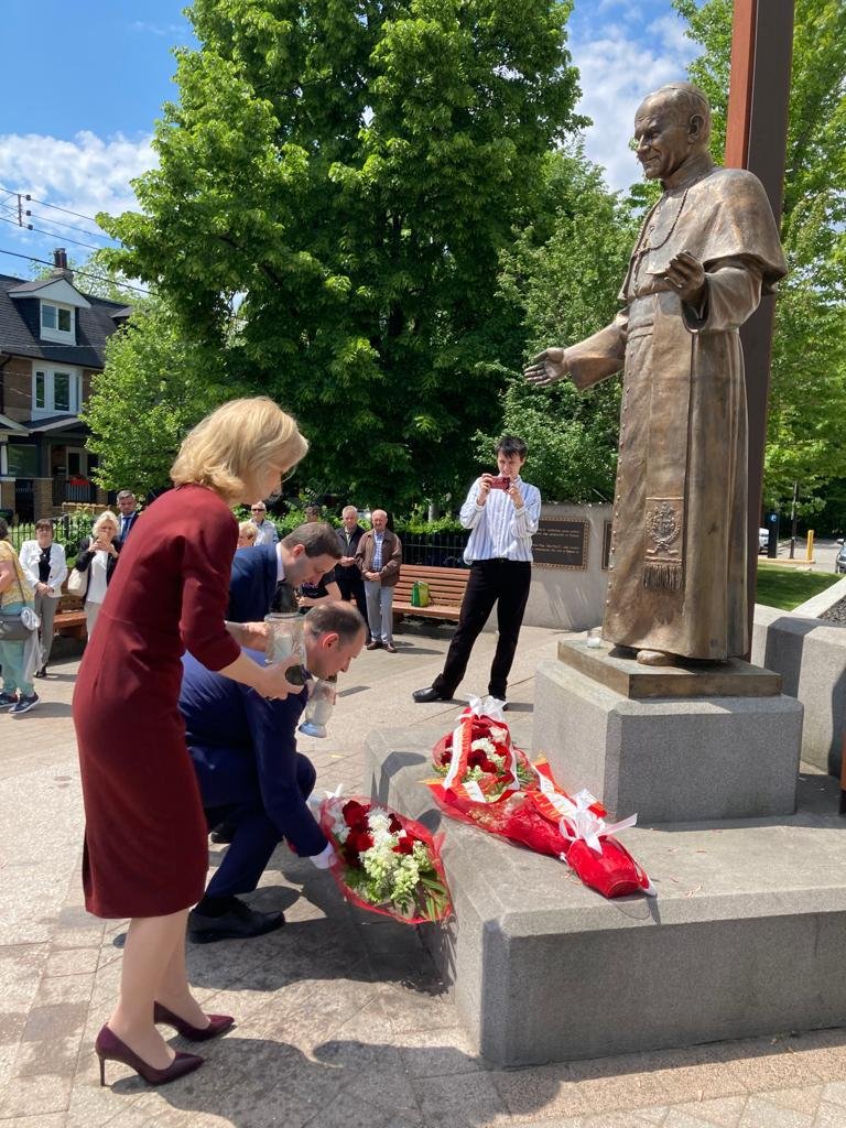 W niedzielę polska delegacja złożyła kwiaty przed pomnikiem św. Jana Pawła II, Pomnikiem Katyńskim oraz pamiątkowymi tablicami: smoleńską i sybiracką oraz uczestniczyła we Mszy Św. w kościele pw. Św. Kazimierza w Toronto. Wieloetniczną parafię rzymskokatolicką św. Kazimierza położoną w „polskiej dzielnicy” Roncesvalles prowadzą ojcowie oblaci. Po południu odbyło się spotkanie gości z Polski z Polonią w siedzibie Konsulatu Generalnego w Toronto. Wieczorem polska delegacja wzięła udział w uroczystym uruchomieniu biało-czerwonej iluminacji znaku „TORONTO”, będącego wizytówką miasta. Iluminacja była jednym z punktów Miesiąca Dziedzictwa Polskiego ustanowionego przez Parlament prowincji Ontario.