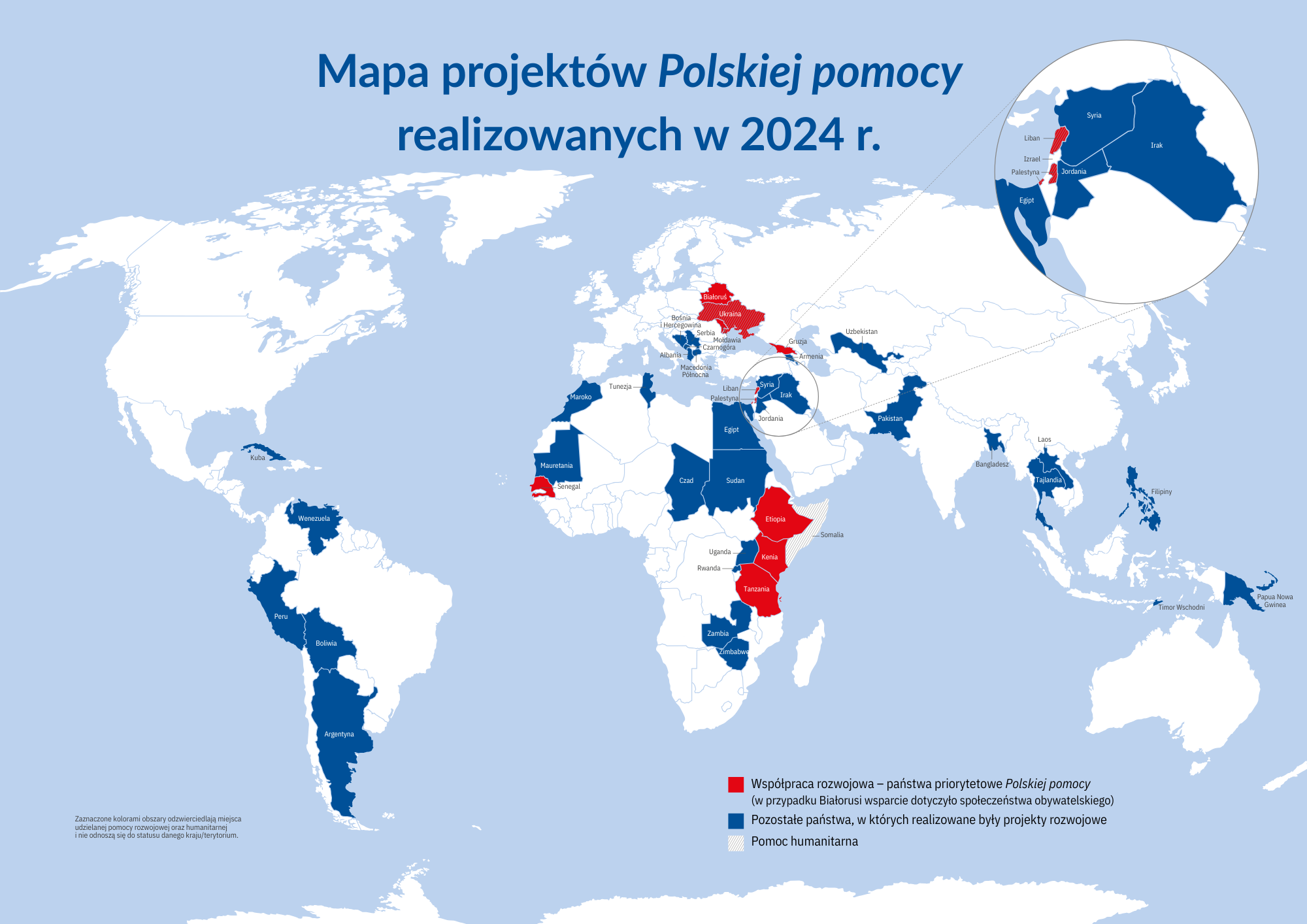 Kluczowym państwem objętym pomocą humanitarną pozostaje Ukraina. Pomoc humanitarna udzielana przez Polskę będzie również realizowana w związku z trwającymi kryzysami humanitarnymi w regionie Bliskiego Wschodu, w szczególności na rzecz Libanu i Palestyny. Pomoc humanitarna często świadczona jest w procedurze ad hoc w związku z pojawiającymi się na świecie kryzysami humanitarnymi, które dotykają mieszkańców danego regionu. Pomoc humanitarna może być udzielana zarówno dwustronnie, jak i kanałem wielostronnym poprzez wpłaty do wyspecjalizowanych organizacji międzynarodowych.