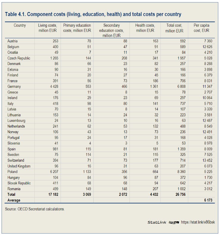 Wg październikowych szacunków OECD co do wysokości wydatków związanych z pomocą humanitarną dla uchodźców z Ukrainy na kolejnych miejscach po Polsce plasują się Niemcy (6,8 mld EUR), Czechy (1,96 mld EUR), Hiszpania (1,36 mld EUR) oraz Rumunia (1 mld EUR). Wstępny, łączny koszt wydatków związanych z pomocą humanitarną dla ukraińskich uchodźców poniesiony przez 27 państw europejskich to 26,7 mld EUR. Na tę sumę składa się m.in. 17,2 mld EUR przeznaczone na zakwaterowanie i bezpośrednią pomoc finansową, 5,1 mld EUR na edukację, 4,4 mld EUR na opiekę zdrowotną.