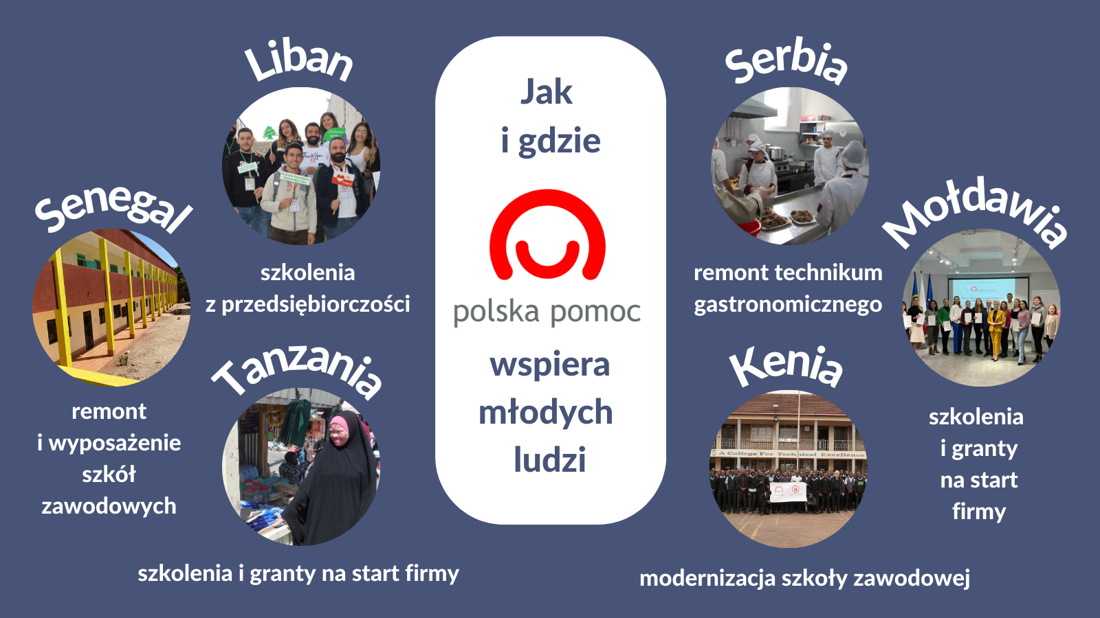 Polska pomoc wspiera rozwój zawodowy młodzieży, poprzez zapewnienie dostępu do wysokiej jakości technicznego i zawodowego kształcenia, budowanie infrastruktury edukacyjnej, dostarczanie specjalistycznego sprzętu, programów nauczania oraz podnoszenie kwalifikacji kadry placówek edukacyjnych. Przedsięwzięcia wspierają młodych ludzi w zdobywaniu praktycznych umiejętności, które są niezbędne na rynku pracy oraz promują przedsiębiorczość jako ścieżkę do samorealizacji i tworzenia miejsc pracy. Ponadto wizja Polski dotycząca wspierania szkoleń zawodowych i rozwijania przedsiębiorczości wśród młodzieży jest ukierunkowana na tworzenie równych szans zarówno dla chłopców i dziewcząt, jak i osób z niepełnosprawnościami.