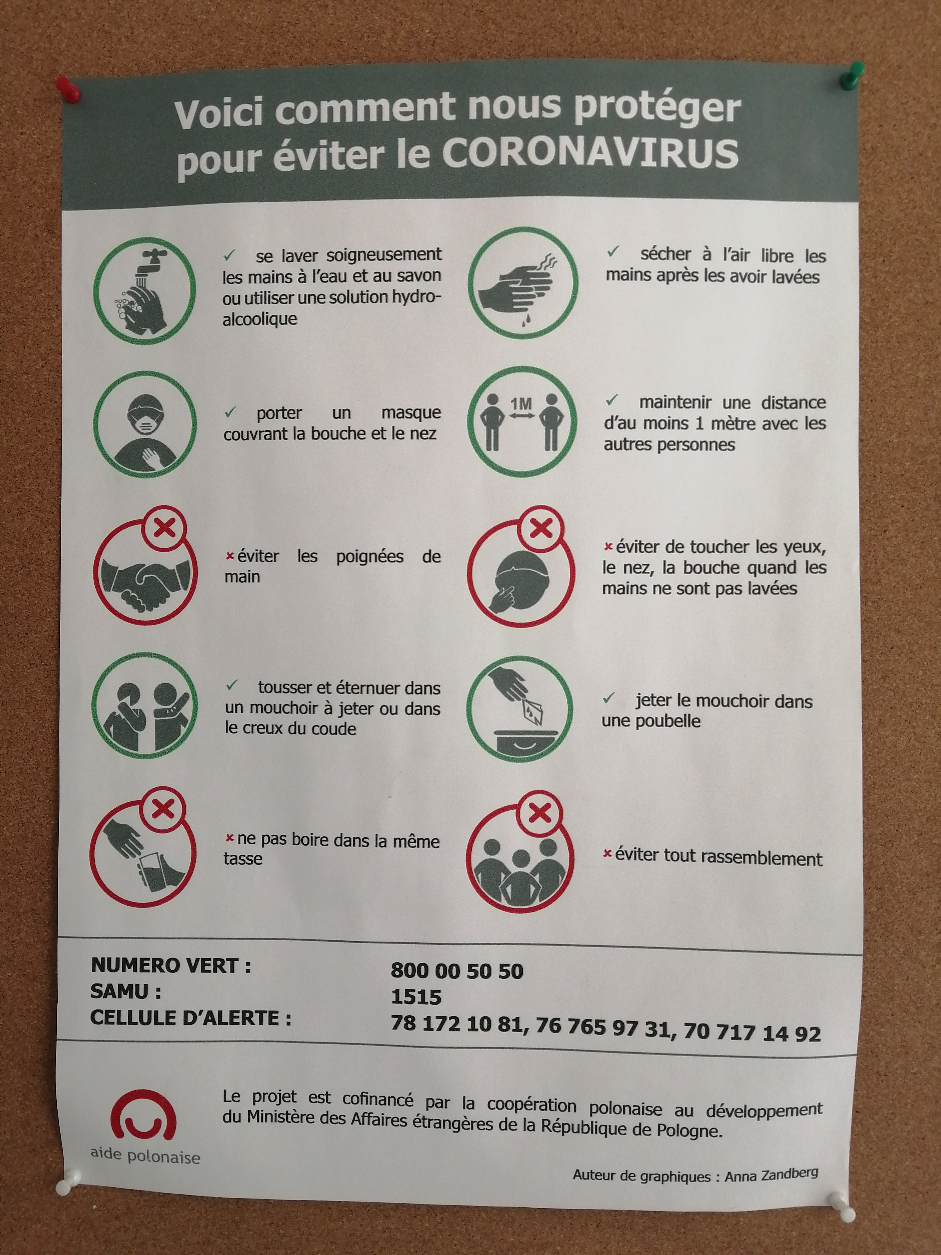 W przychodni "Dispensaire Notre-Dame d'Esperance" w dzielnicy Thiaroye zainstalowano przenośną umywalkę ze stałym przyłączem wodnokanalizacyjnym. Zakupiono termometry zdalne, maski, przyłbice, rękawiczki, leki, leki i odżywki wspomagające leczenie chorych na AIDS, leki i mieszanki używane w centrum dożywiania znajdującym się w przychodni.