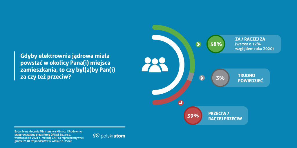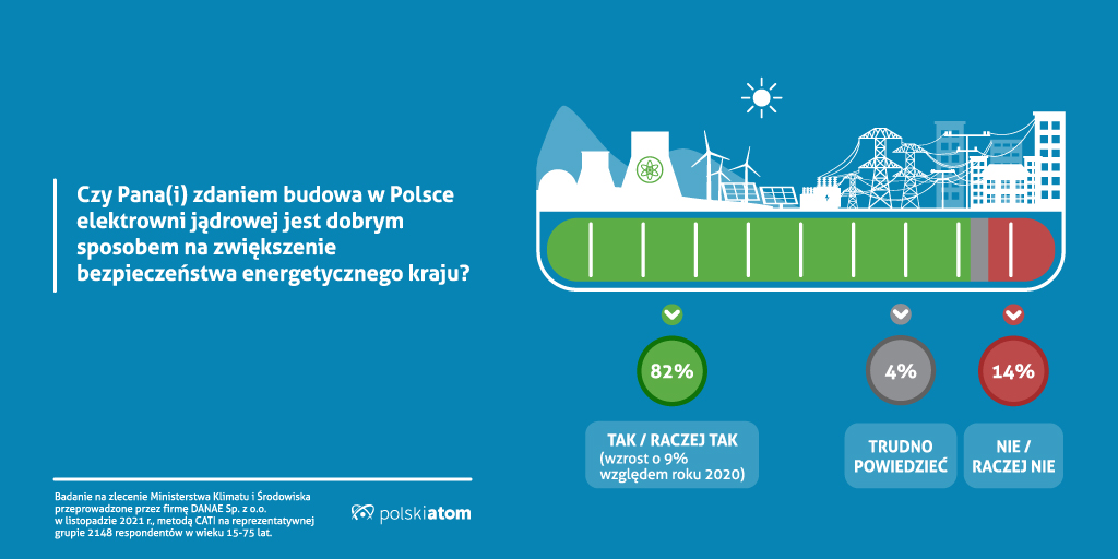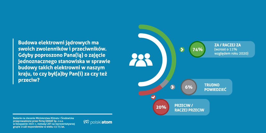 Badanie z listopada 2021 r. wskazuje, że 74% ankietowanych wyraża poparcie dla elektrowni jądrowych w naszym kraju a 20% jest przeciwnego zdania. W porównaniu do 2020 r. odnotowano wzrost zwolenników tego typu inwestycji o 11%.