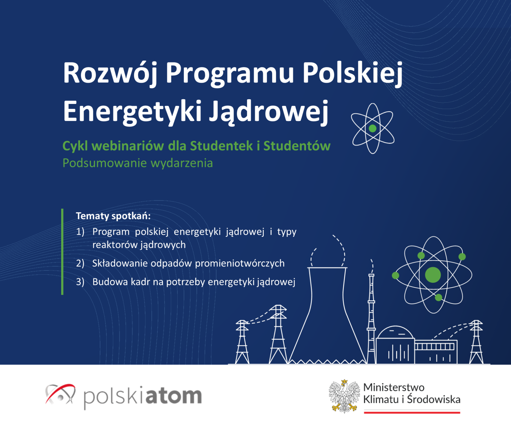 W dniach 14-18 maja 2024 r. odbył się cykl webinariów organizowany przez Departament Energii Jądrowej Ministerstwa Klimatu i Środowiska pt. „Rozwój Programu Polskiej Energetyki Jądrowej”. Cykl adresowany był do studentek i studentów zainteresowanych tematyką energii jądrowej oraz zagadnieniami z obszaru fizyki i chemii. W wydarzeniu wzięło udział ponad 220 osób.