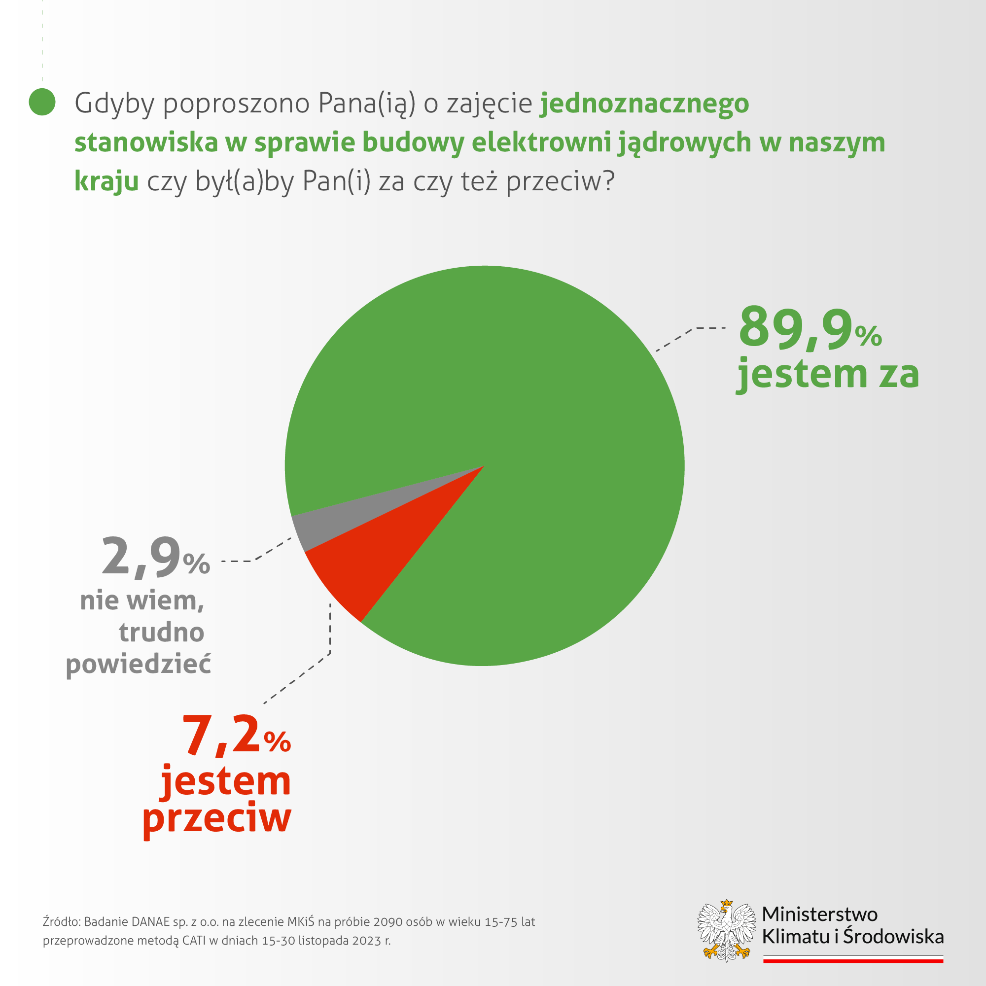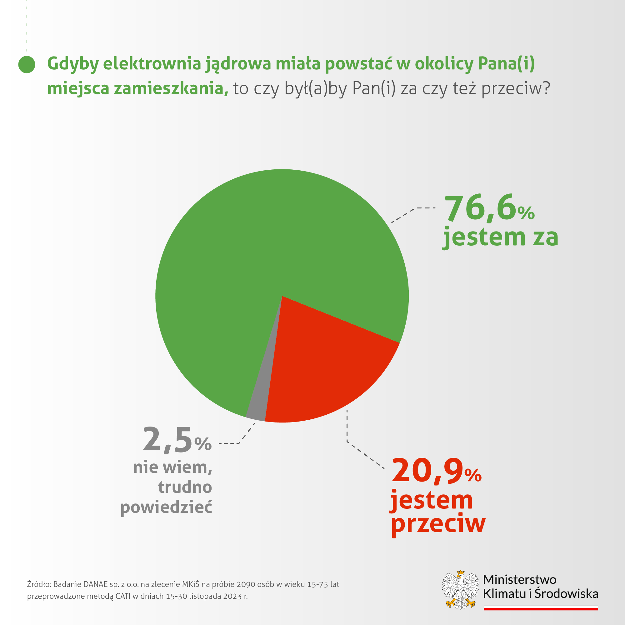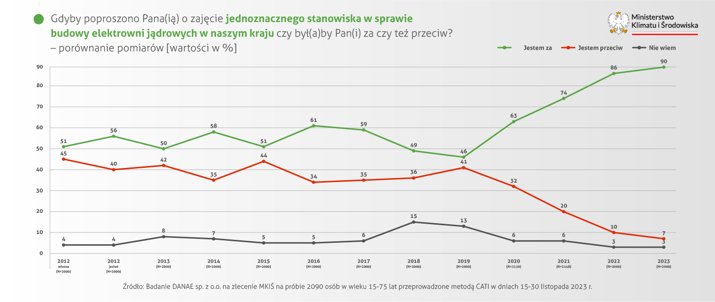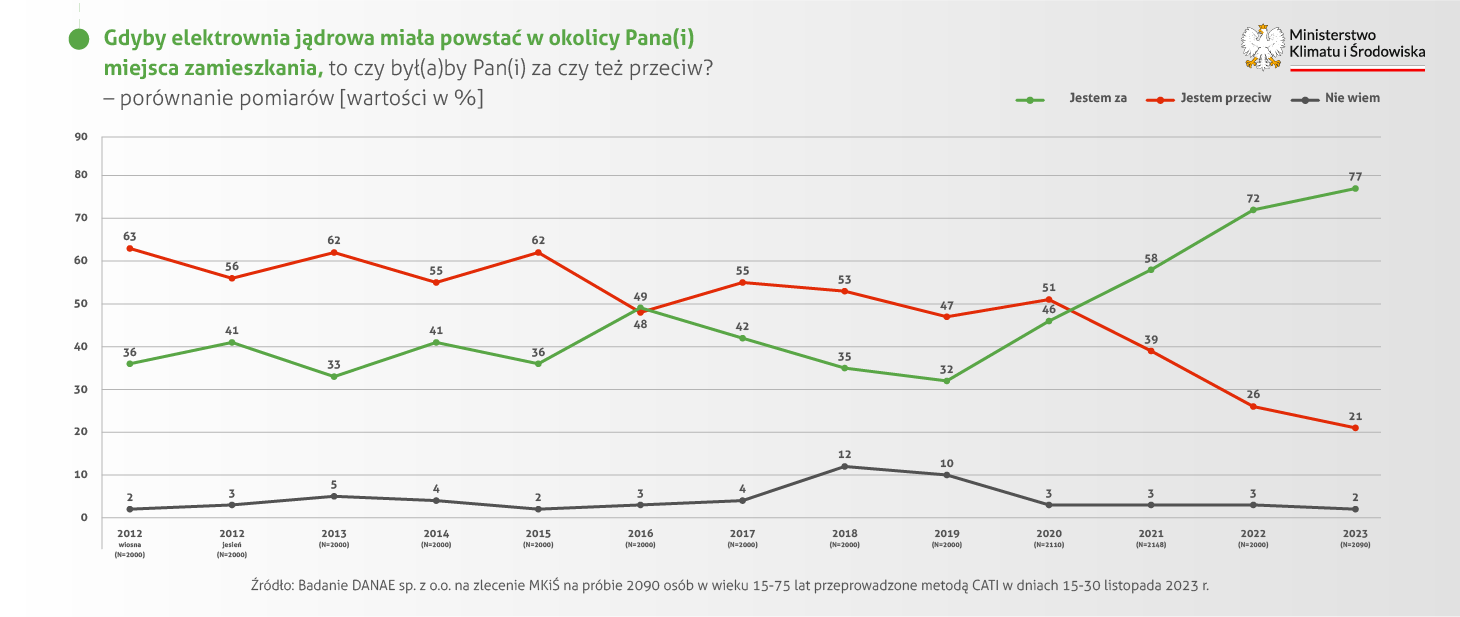 Badanie z listopada 2023 r. wskazuje, że 89,9 proc. ankietowanych wyraża poparcie dla elektrowni jądrowych w naszym kraju, a 7,2 proc. jest przeciwnego zdania. 2023 rok przyniósł kolejny wyraźny wzrost liczby zdecydowanych zwolenników budowy elektrowni jądrowych w Polsce (61,7 proc. w stosunku do 56,7 w 2022, 43,3 proc. w 2021 i 31,7 proc. w 2020 roku). Jednocześnie spadł odsetek osób raczej przeciwnych tego rodzaju inwestycji w kraju (3,3 proc. w porównaniu do 5,7 proc. w 2022 roku).